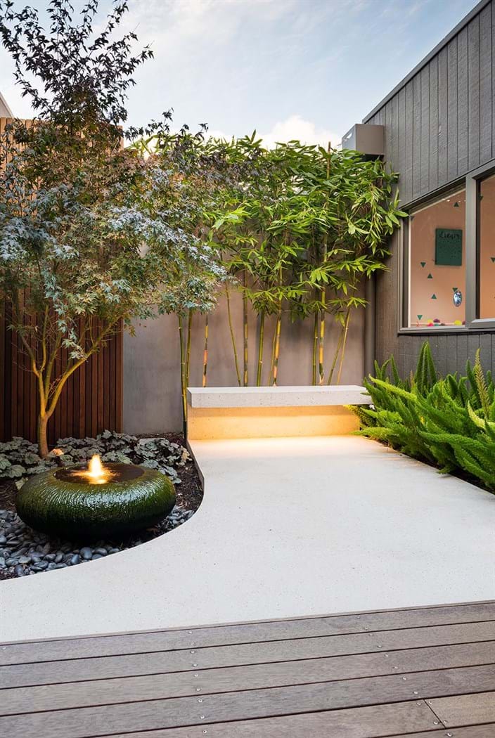 The front yard features a circular raised lawn which influenced repeated circular elements throughout the rest of the garden. An internal courtyard was kept simple, yet functional and is a feature from the sitting room.