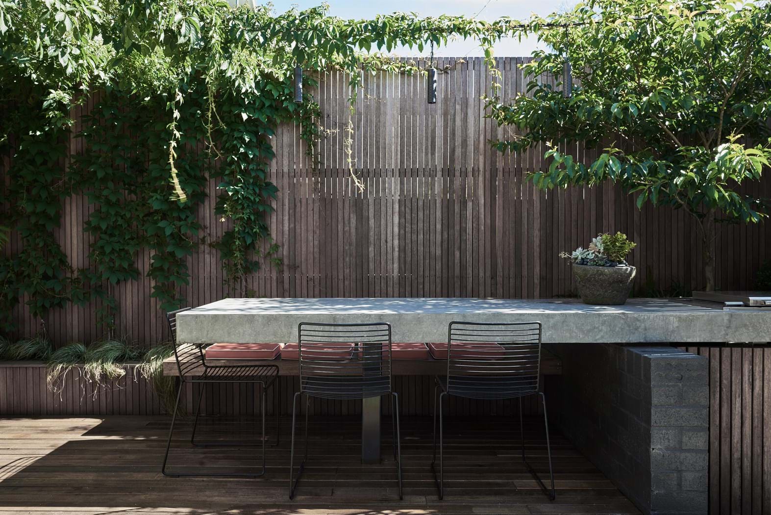 Screens hide utility spaces whilst becoming beautiful backdrops that frame the plant life. Benches and tables float to not only give the space visual impact but to save space wherever possible in this small courtyard.