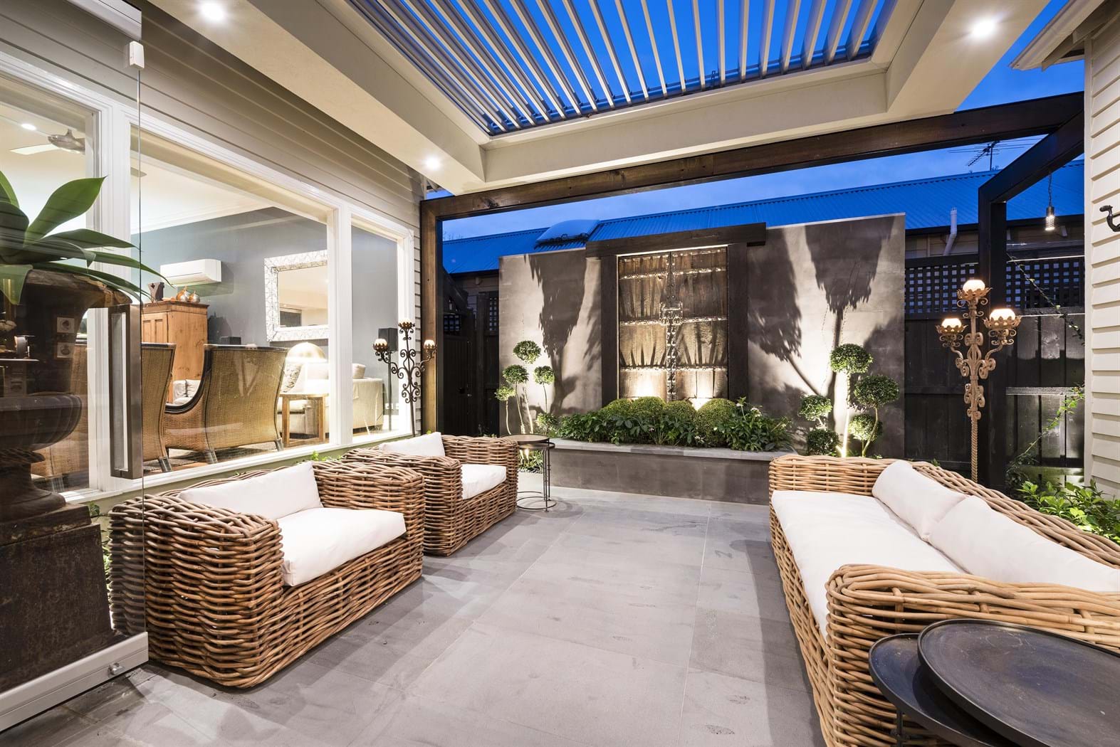 The clients wanted the transformation of a cluttered, underused and tired courtyard into a relaxed outdoor lounge. With improved access from the home, a flexible roof cover, a special focal point (to take the emphasis away from the neighbours roof) and an overall visual impression that would become a permanent invitation to use the once never used courtyard.