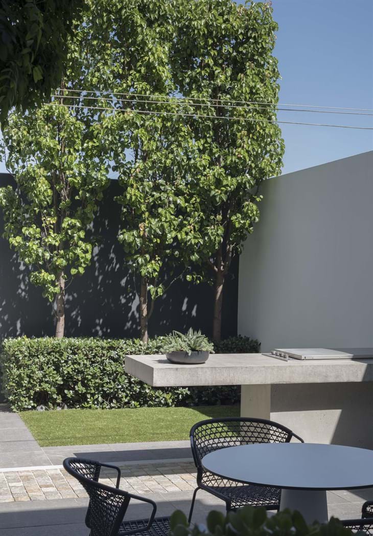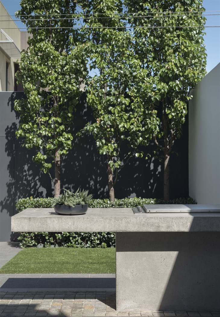 Entertaining was high on their agenda as well as the opportunity to cook. A concrete island bench was positioned perpendicular to the boundary wall to encourage conversation rather than have the chef staring at the boundary wall. It also helped provide a division in the garden, creating two distinct rooms. This concept of two spaces was important as they had two dogs. Artificial grass was used in the compact area provided for the dogs for ease of maintenance.