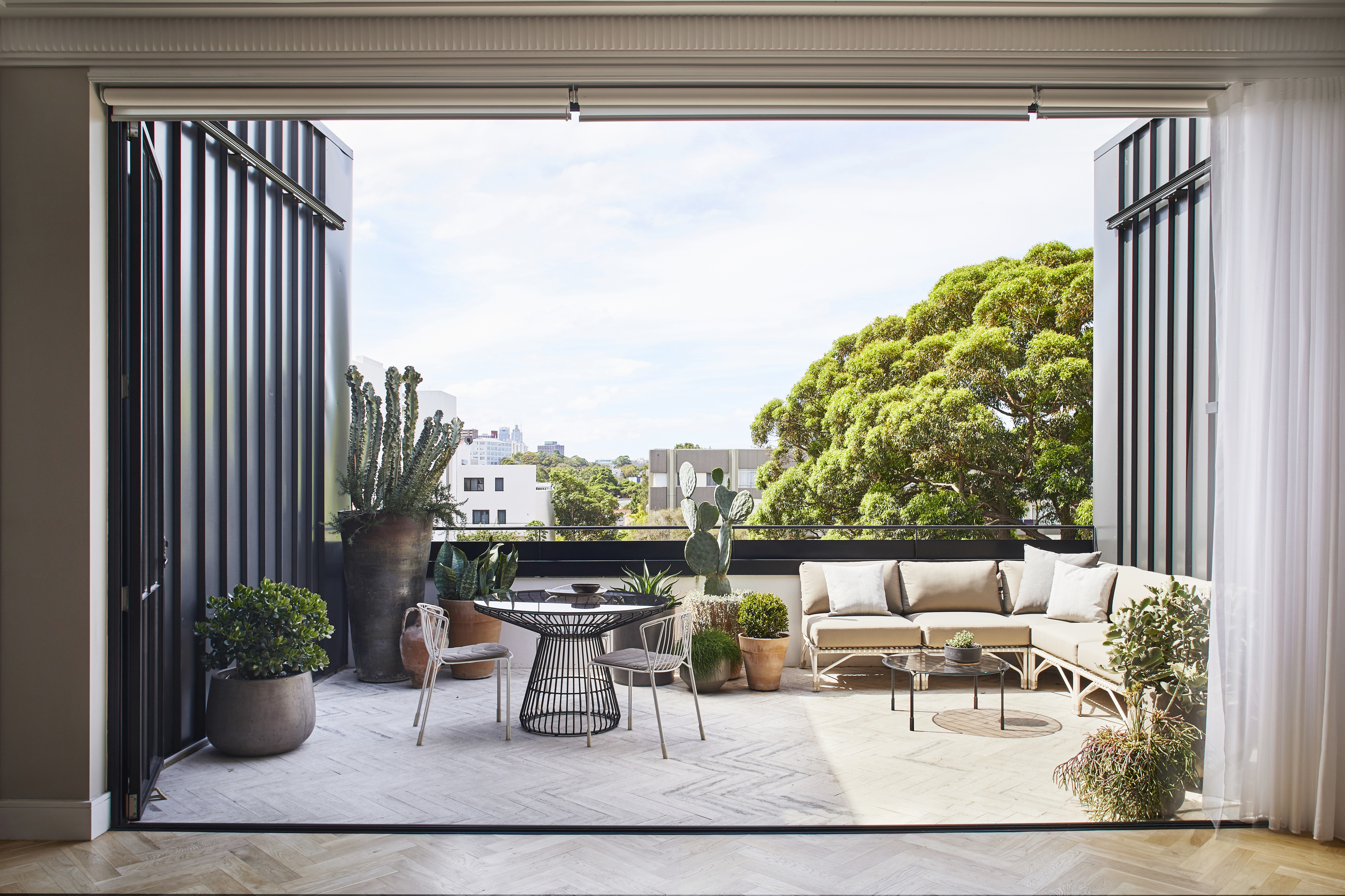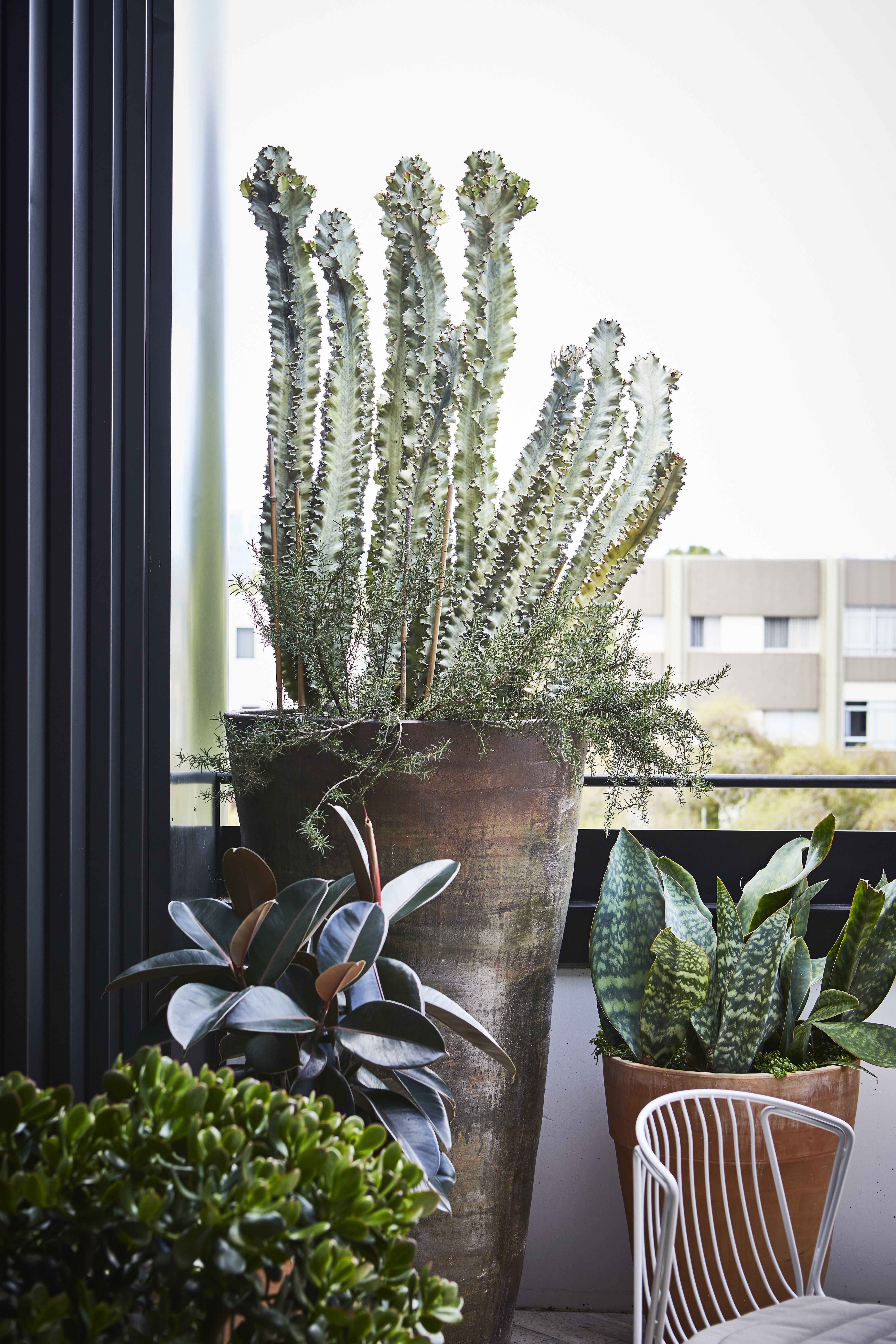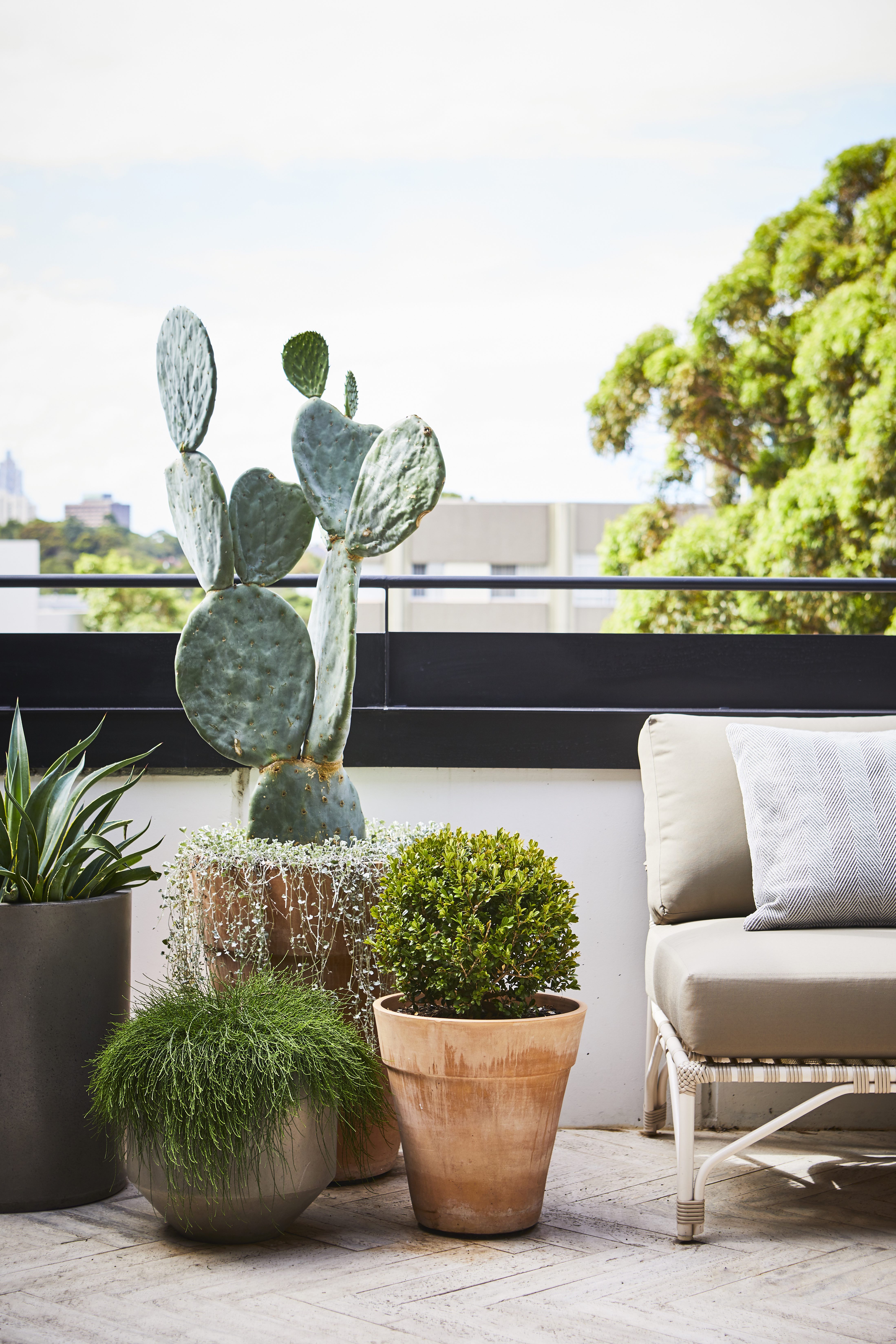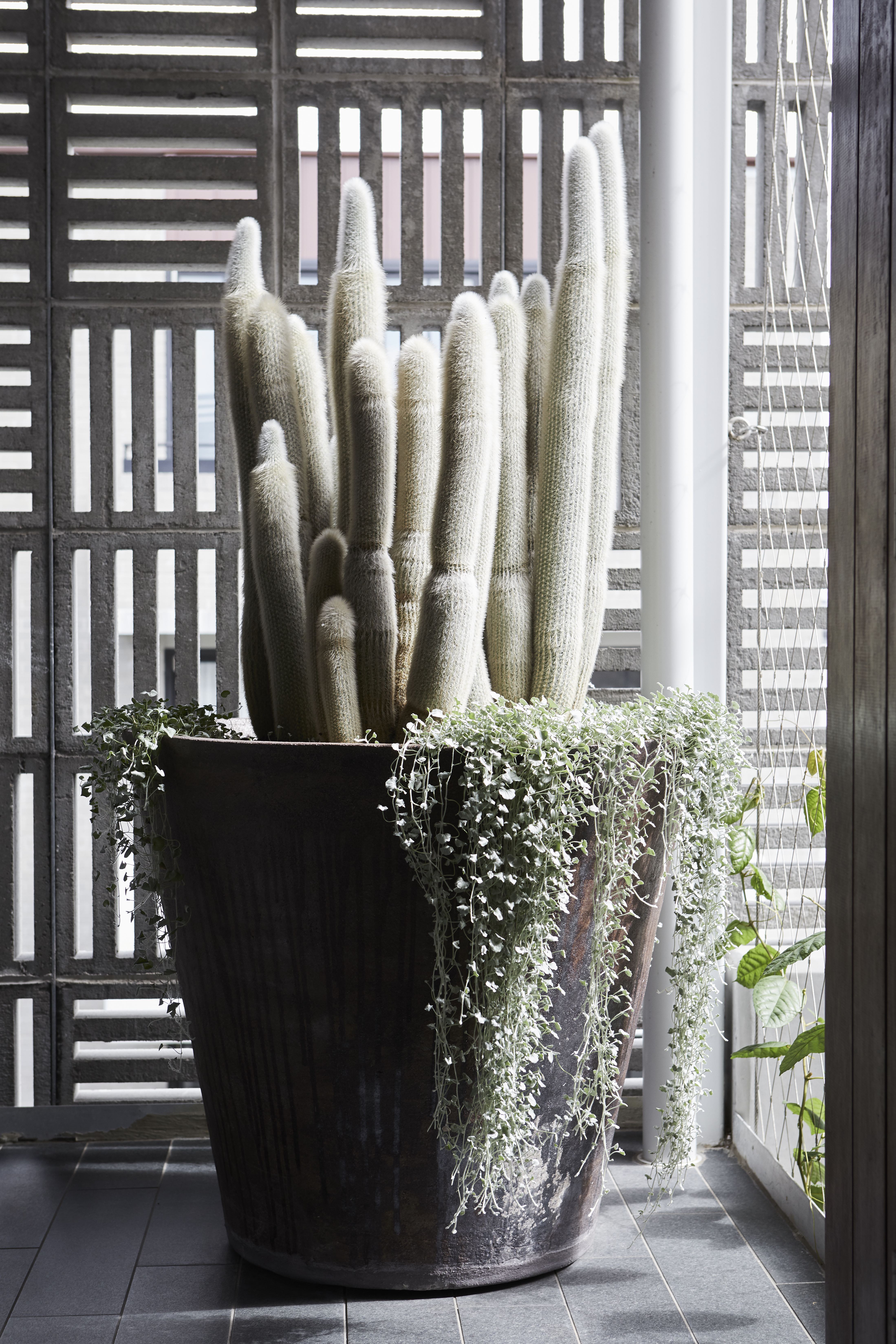 Interesting and hardy plants were to be introduced to the space to incorporate some greenery and visual interest. The client also wanted to decorate the entry to the apartment with planting in pots – a statement pot with cacti was chosen as the focal point, with a row of three of the same pots to flank the entryway.
