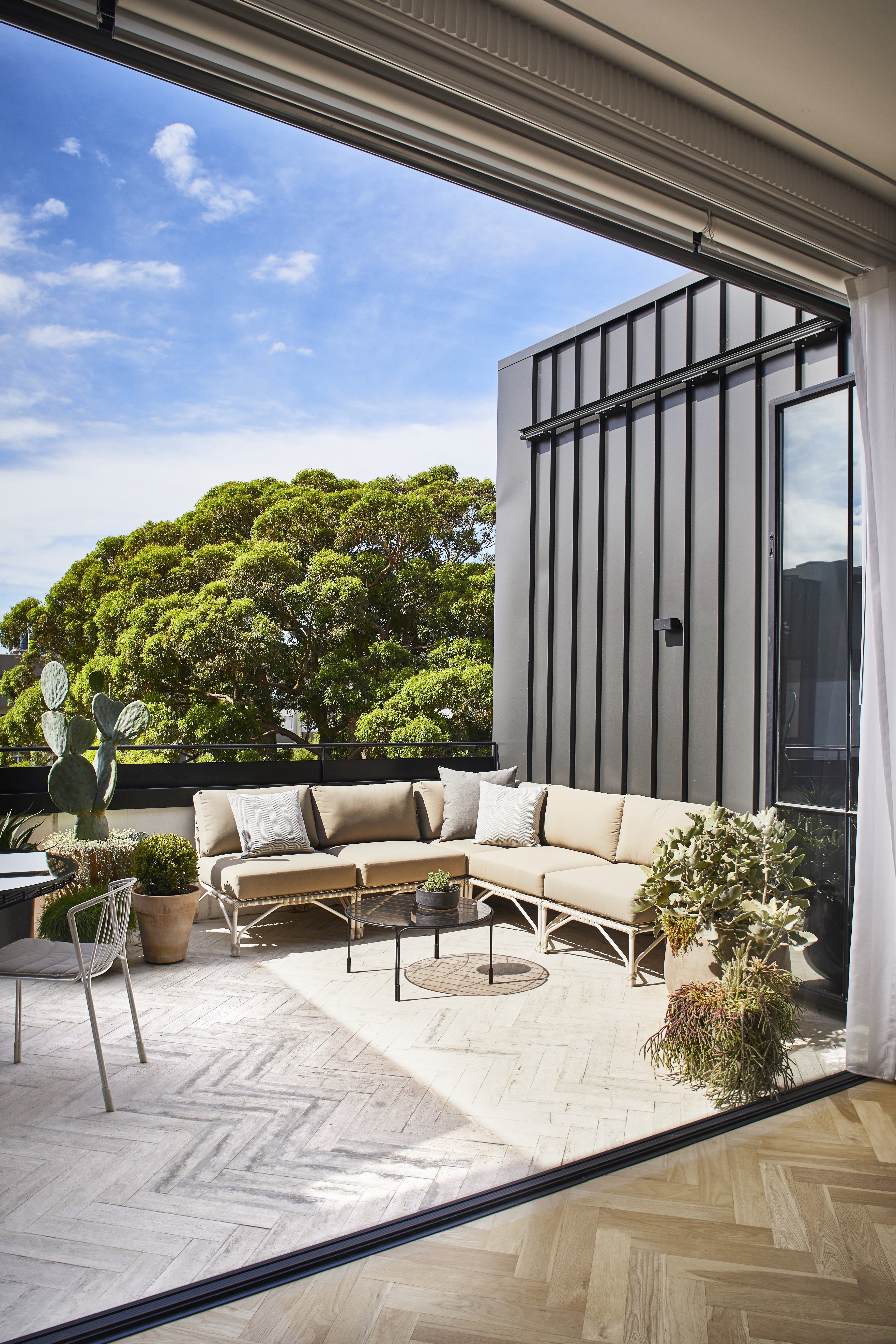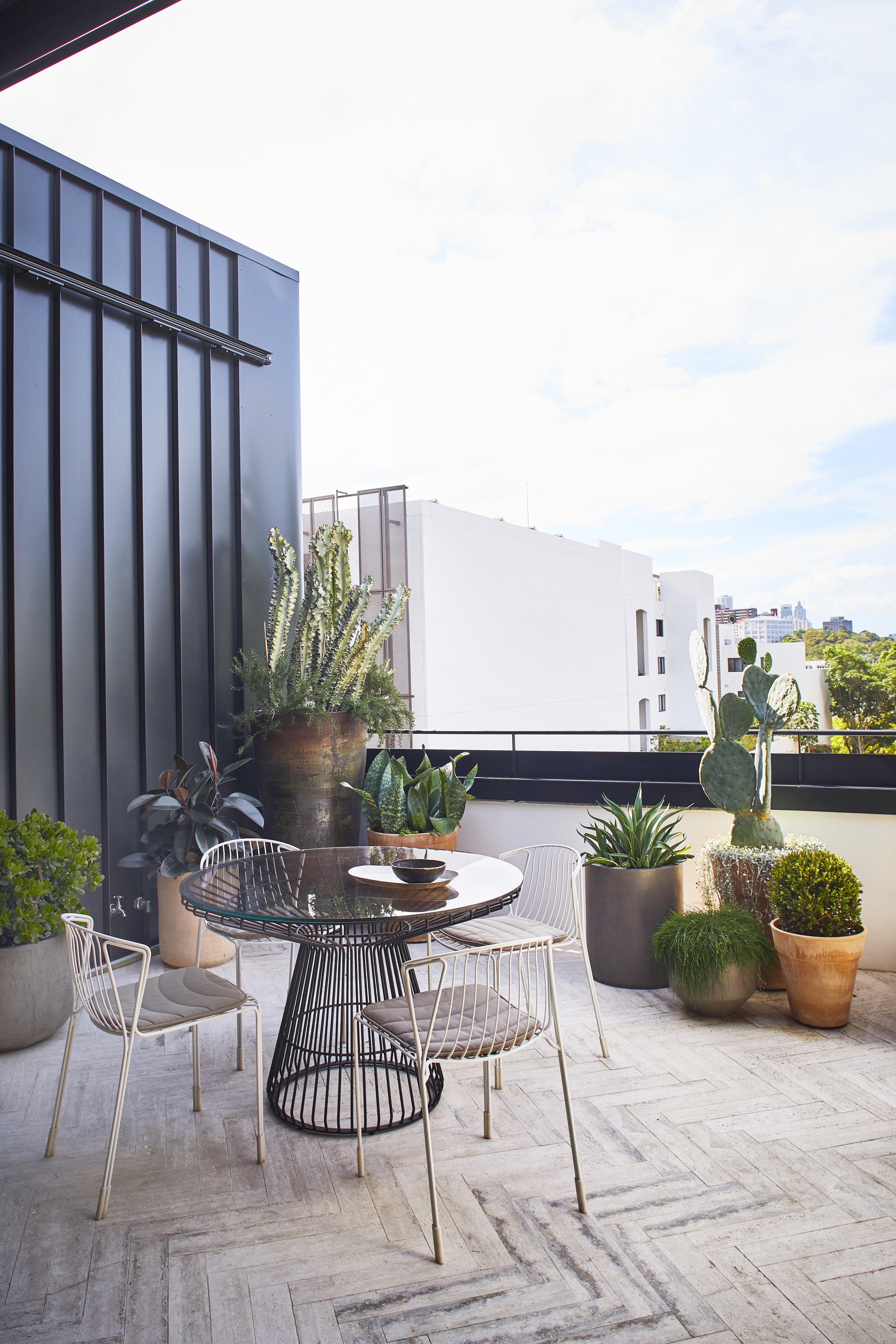 The client had moved into a new apartment complex and wanted to turn the balcony into a stylish, useable and low maintenance space. There was a requirement for alfresco dining and lounging, so furniture was chosen that would provide ample space for both without inhibiting movement through around the balcony.