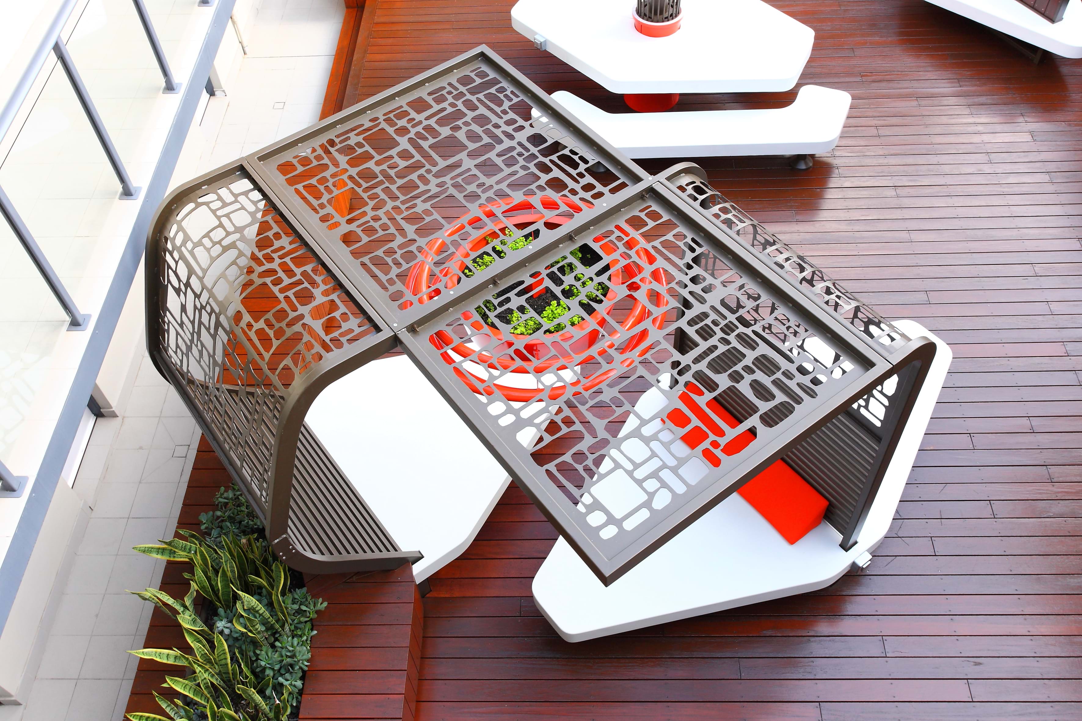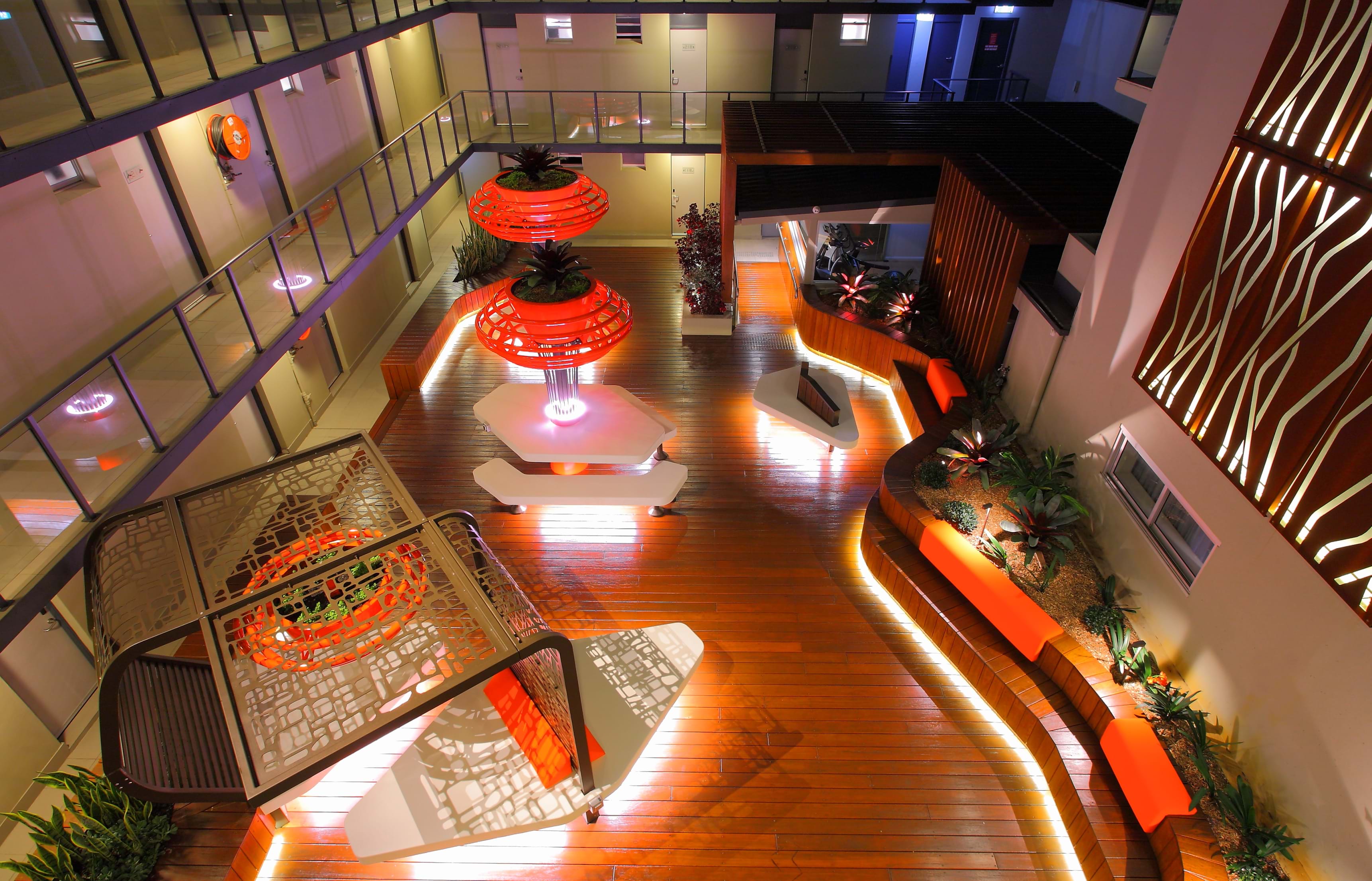 The brief for this project was clear. It must be unique, encourage people to venture out of their room and engage in the hotel’s services and facilities. The goal was to encourage these guests to use the space for all of their needs- to work (plug in laptop access), relax (reclining seating), and socialise (sizeable clusters and hubs).