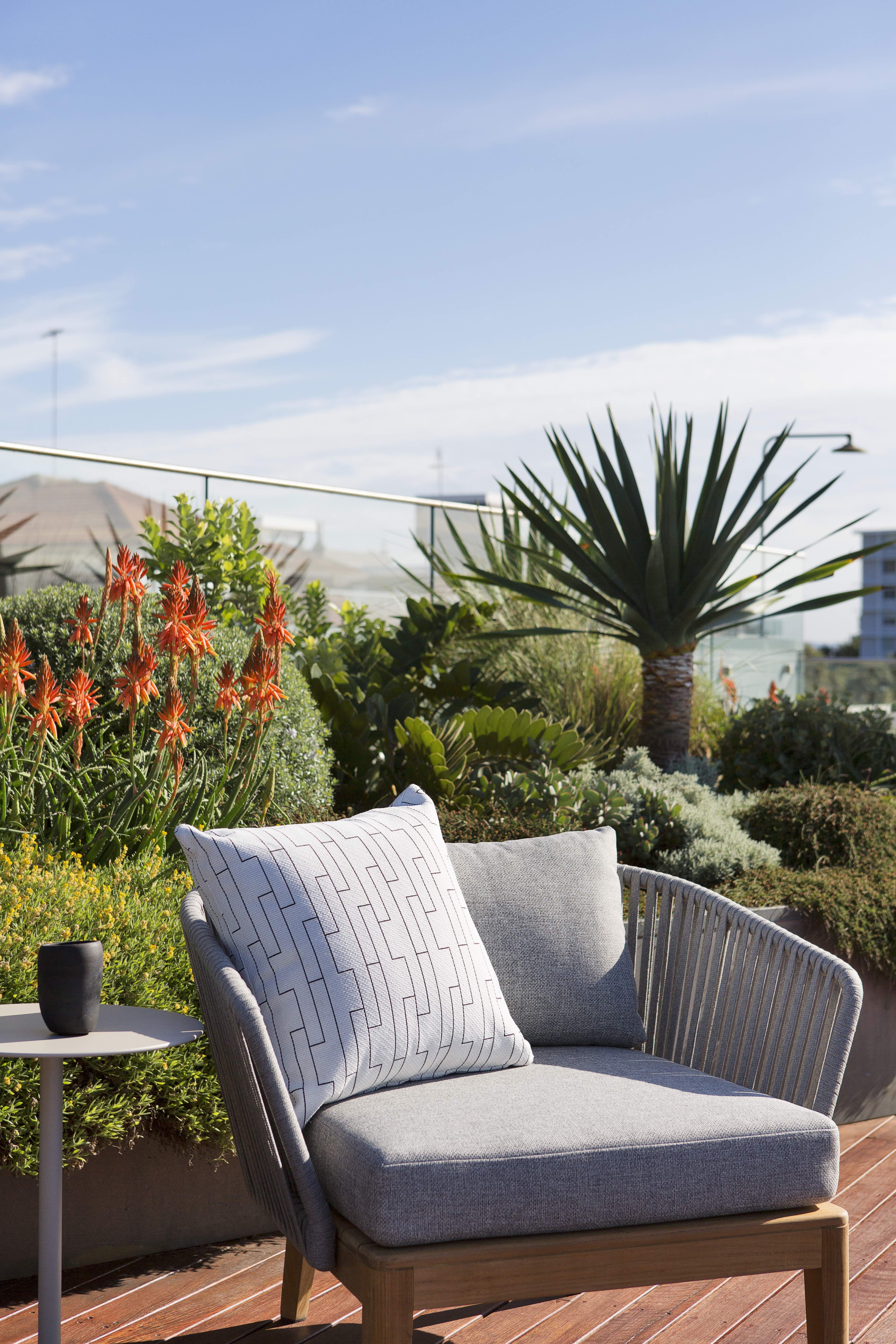 A statement, contemporary design was desired, with plants that could tolerate the intense and variable weather conditions that come with a rooftop right on the coast.