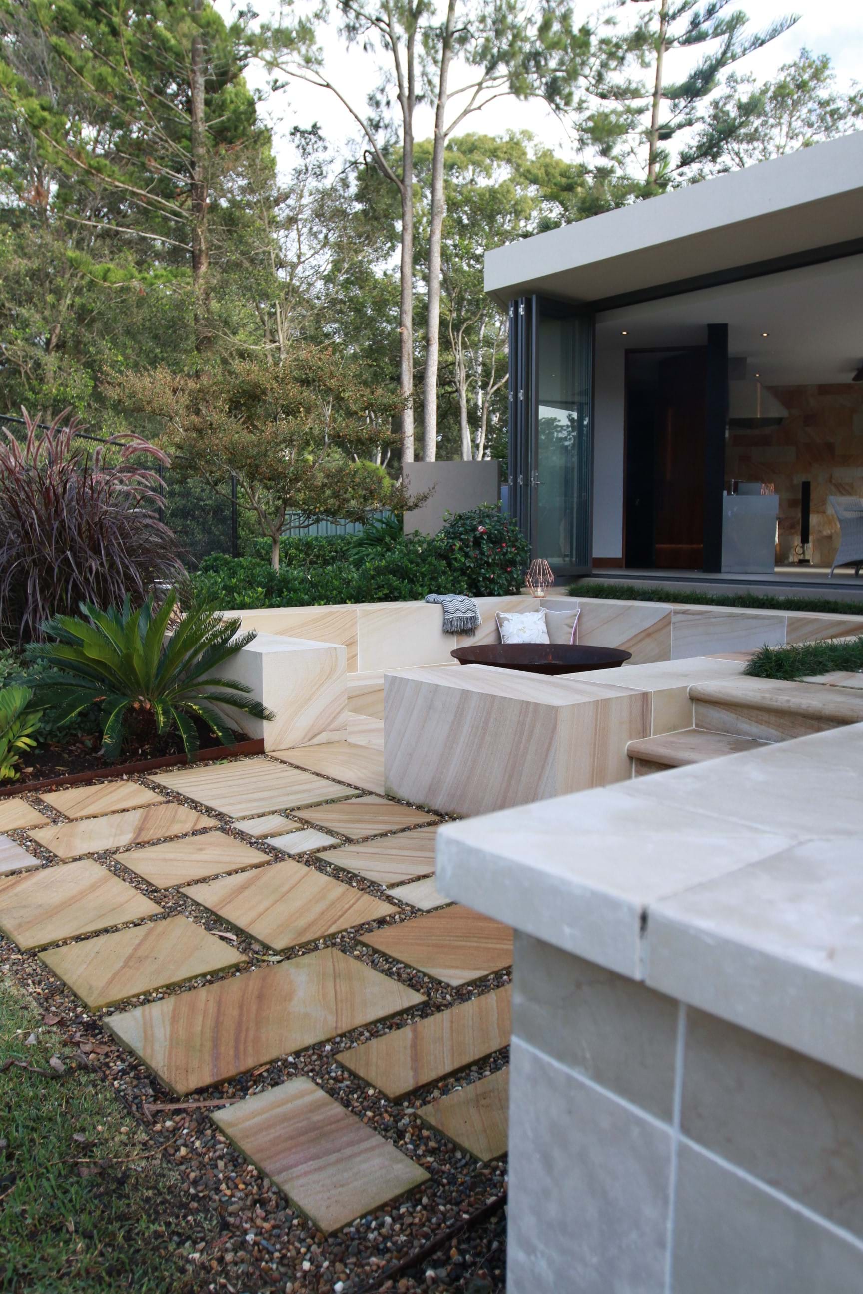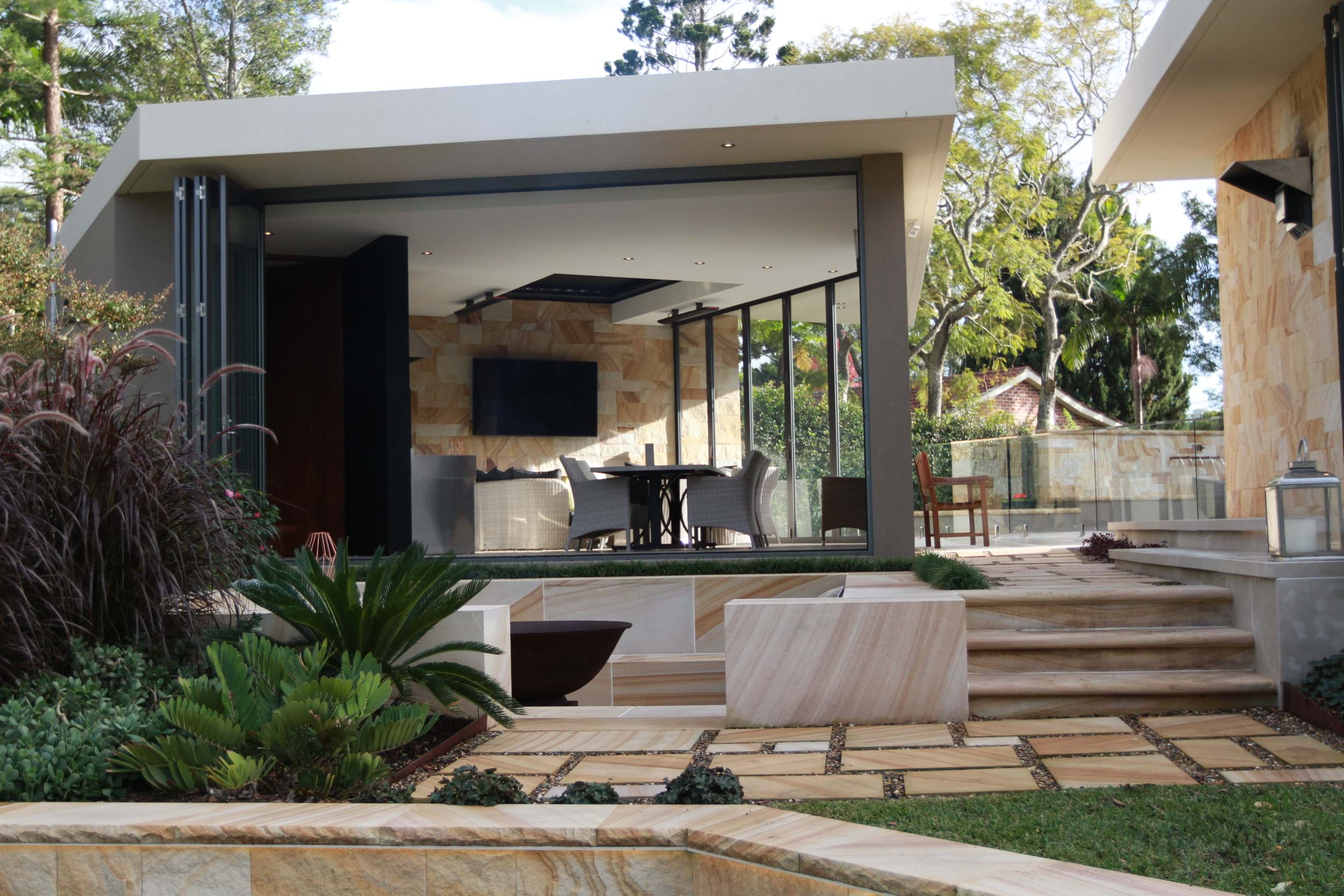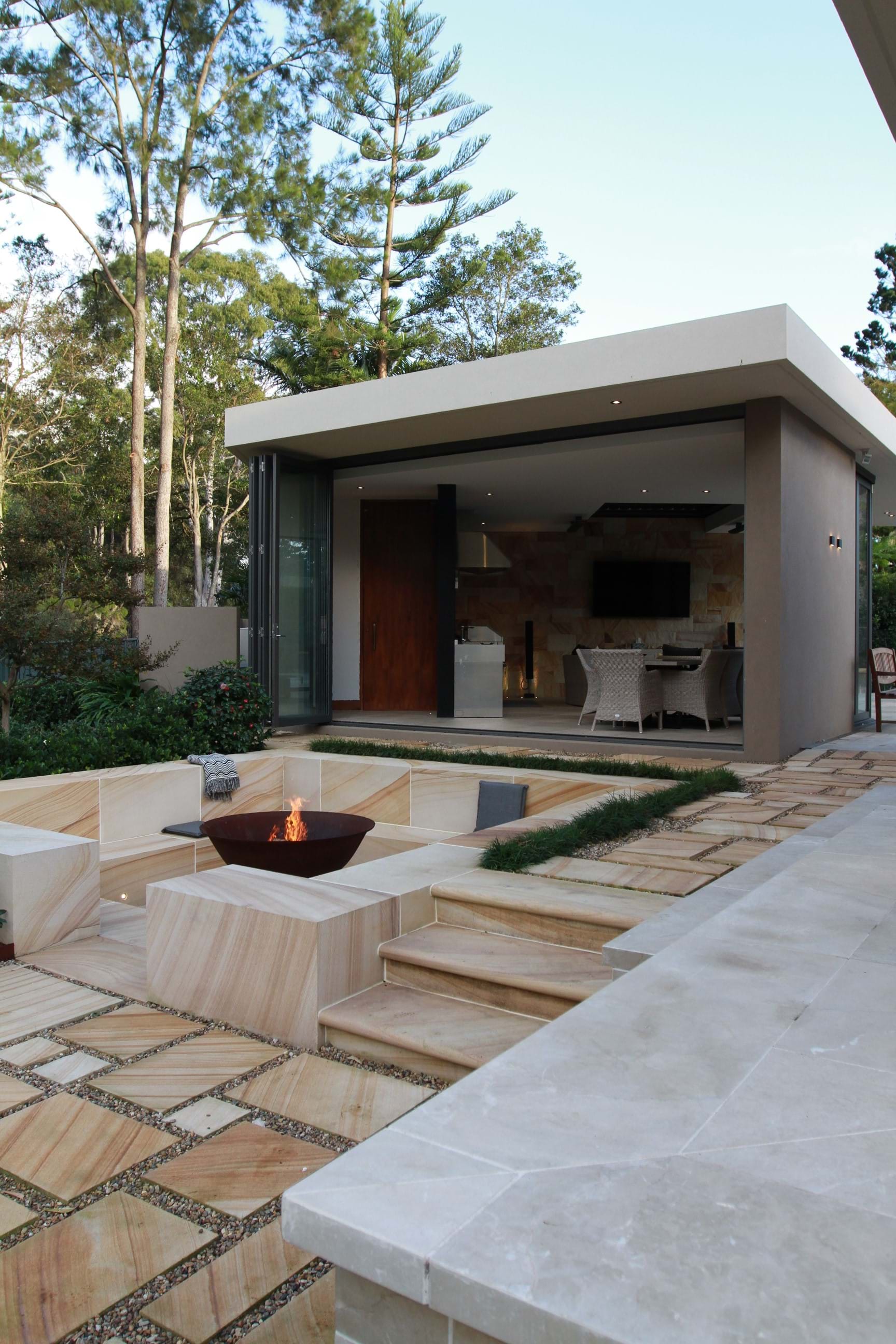 A modern Central Coast property with an existing garden was being added to. The client wished to create a sophisticated entertaining area that integrated the existing pool cabana, as well as fusing with the house, which is extensively clad with local sandstone.