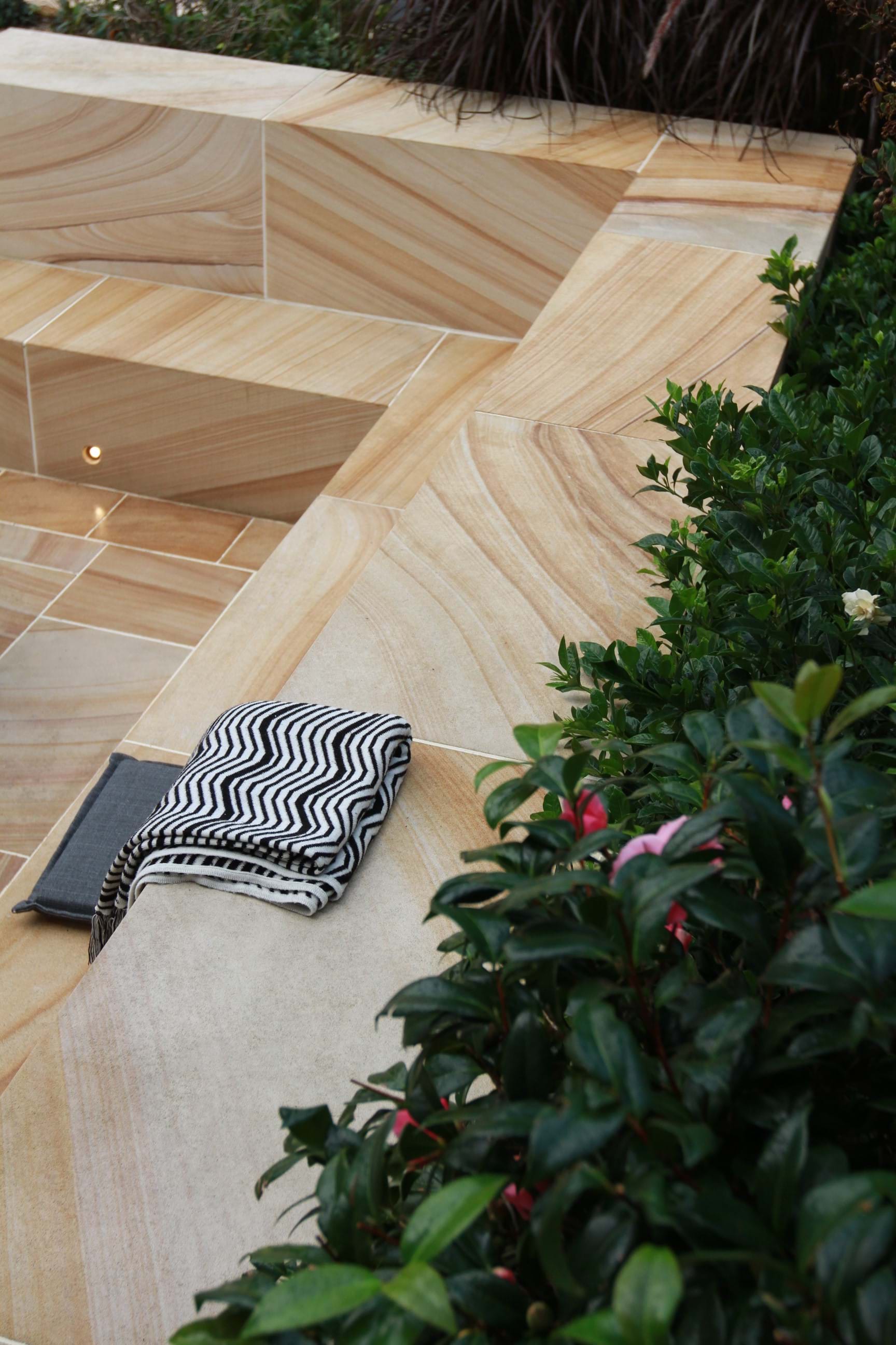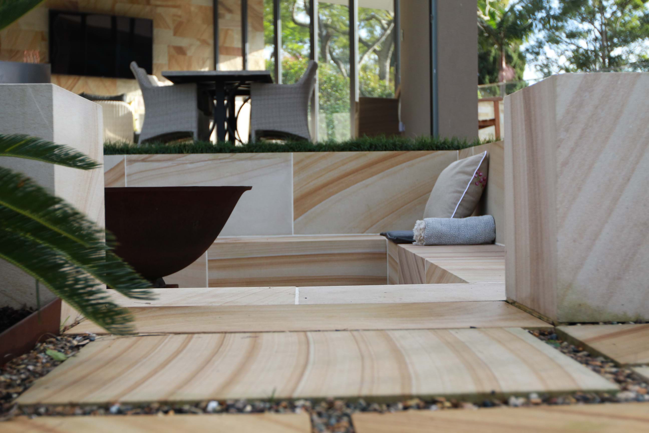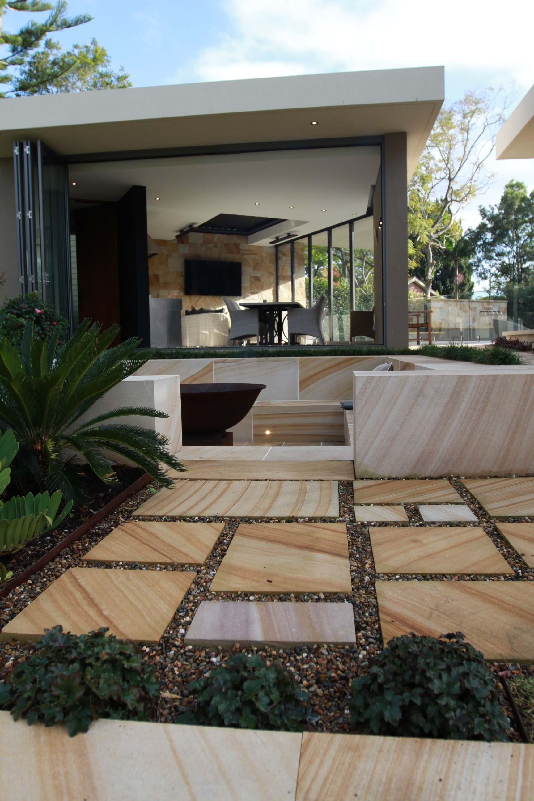 A modern Central Coast property with an existing garden was being added to. The client wished to create a sophisticated entertaining area that integrated the existing pool cabana, as well as fusing with the house, which is extensively clad with local sandstone.