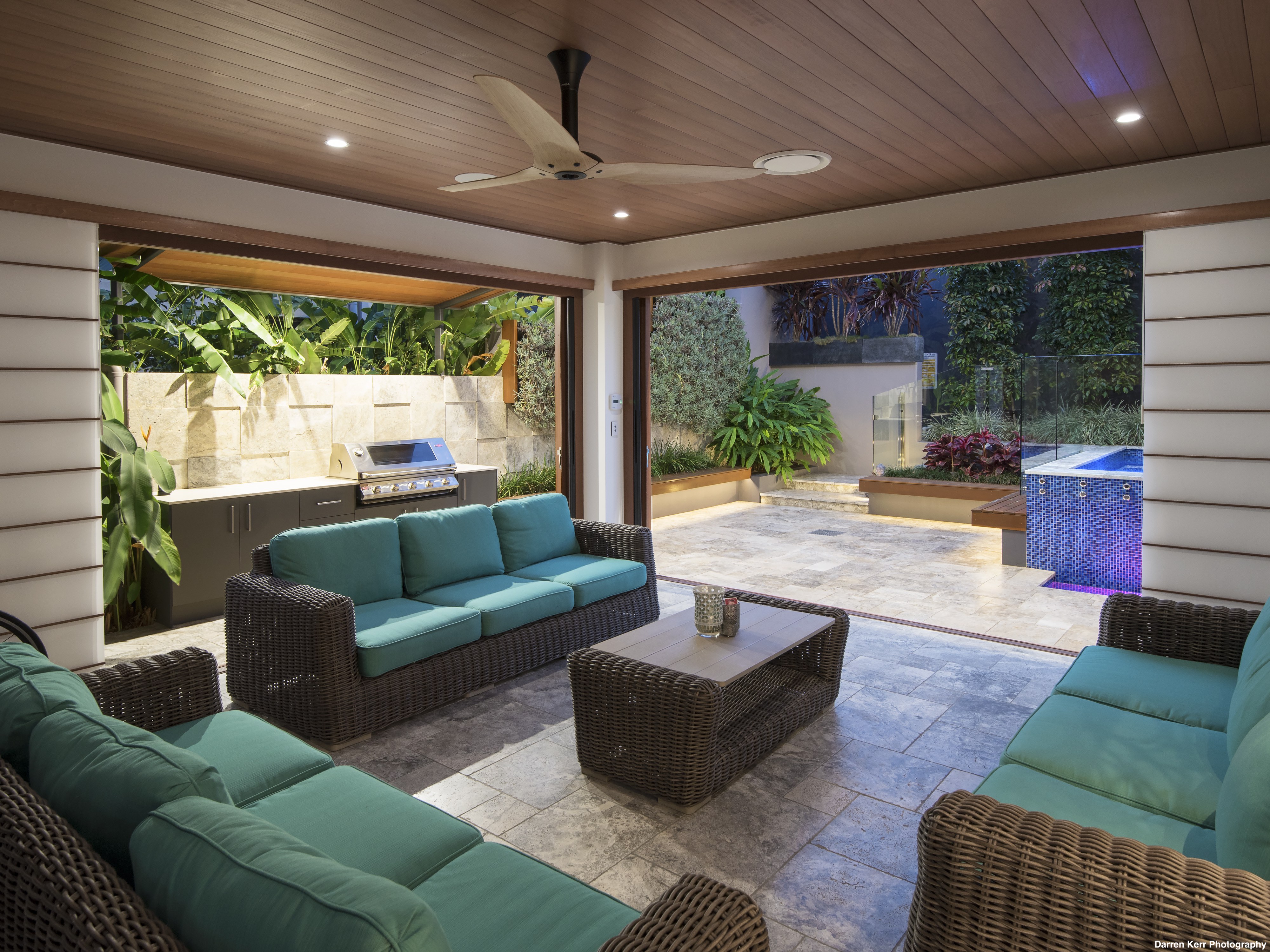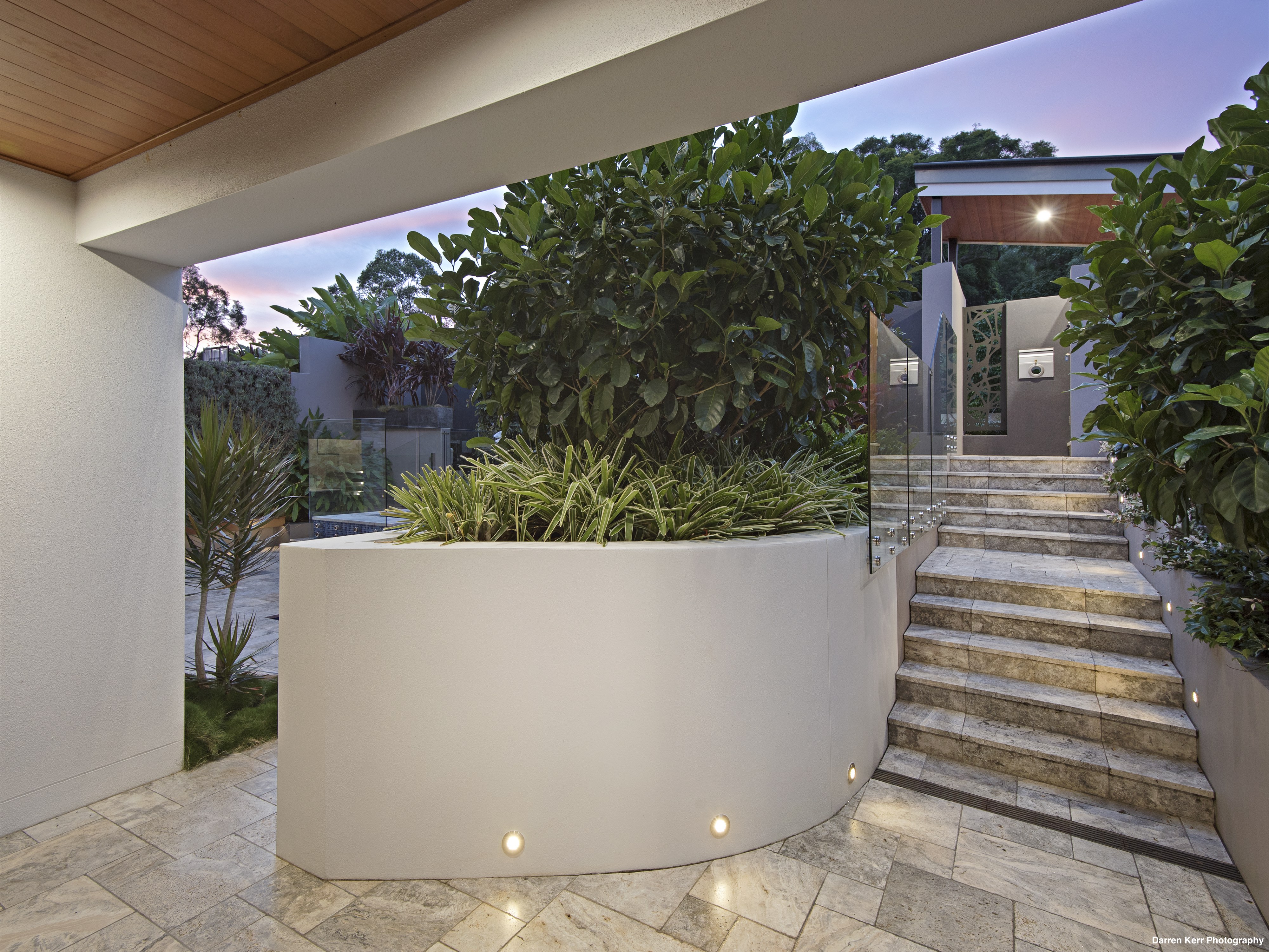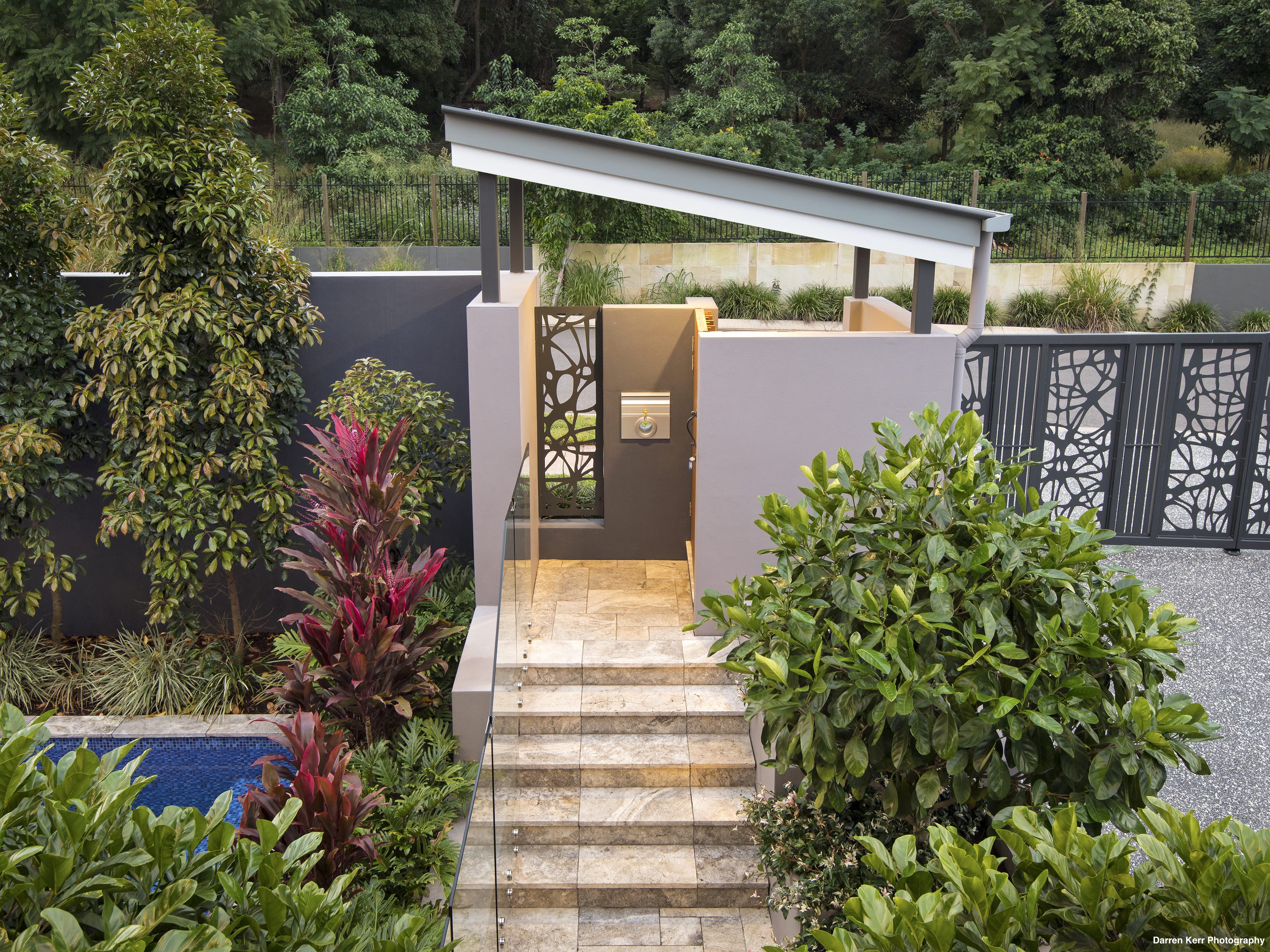 rear and an additional alfresco room at the front, which the client hoped could be used in conjunction with a pool and outdoor entertaining. In addition, they were seeking a formal pedestrian entry which along with driveway access to the garage was secure but provided a great entry statement for the property.