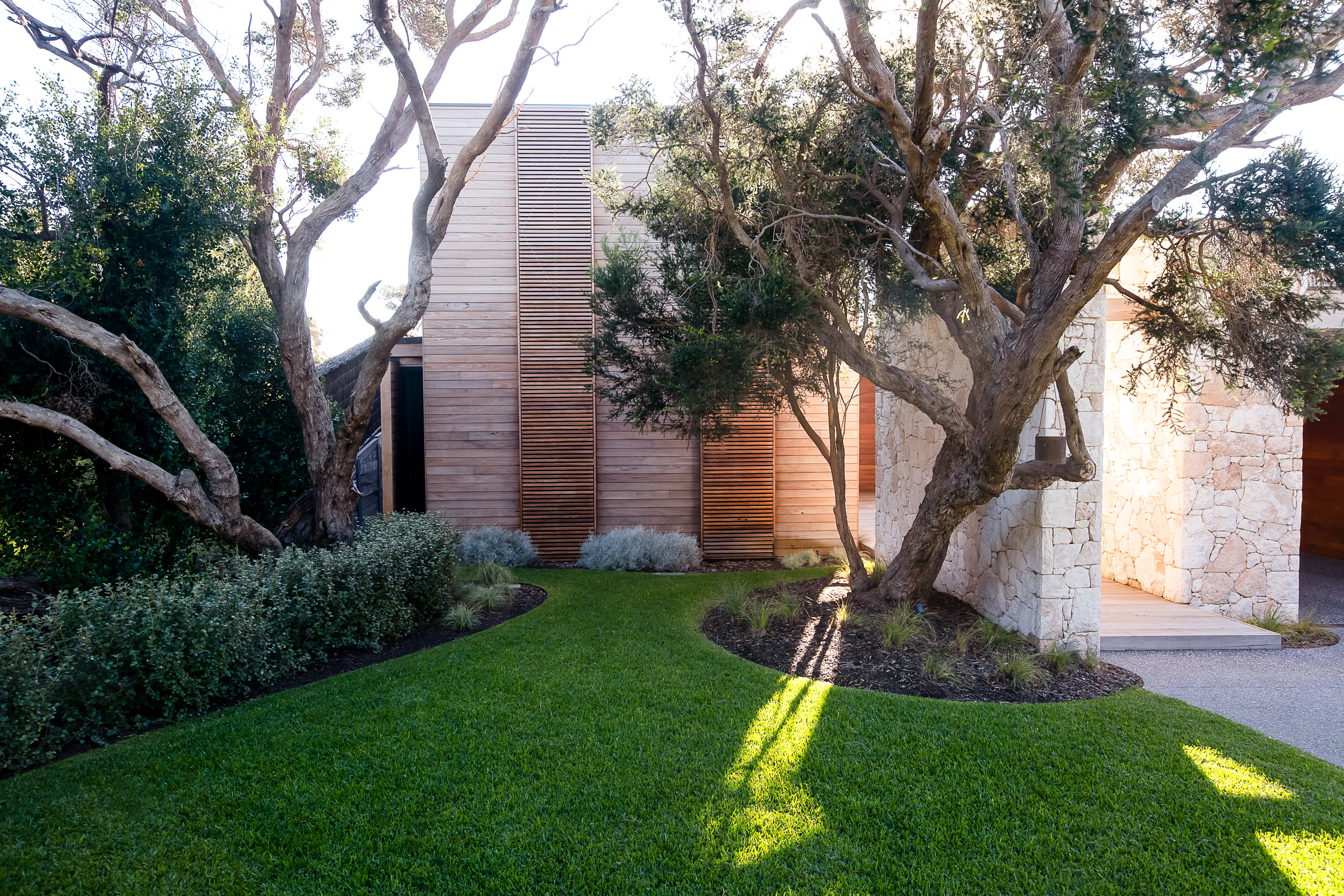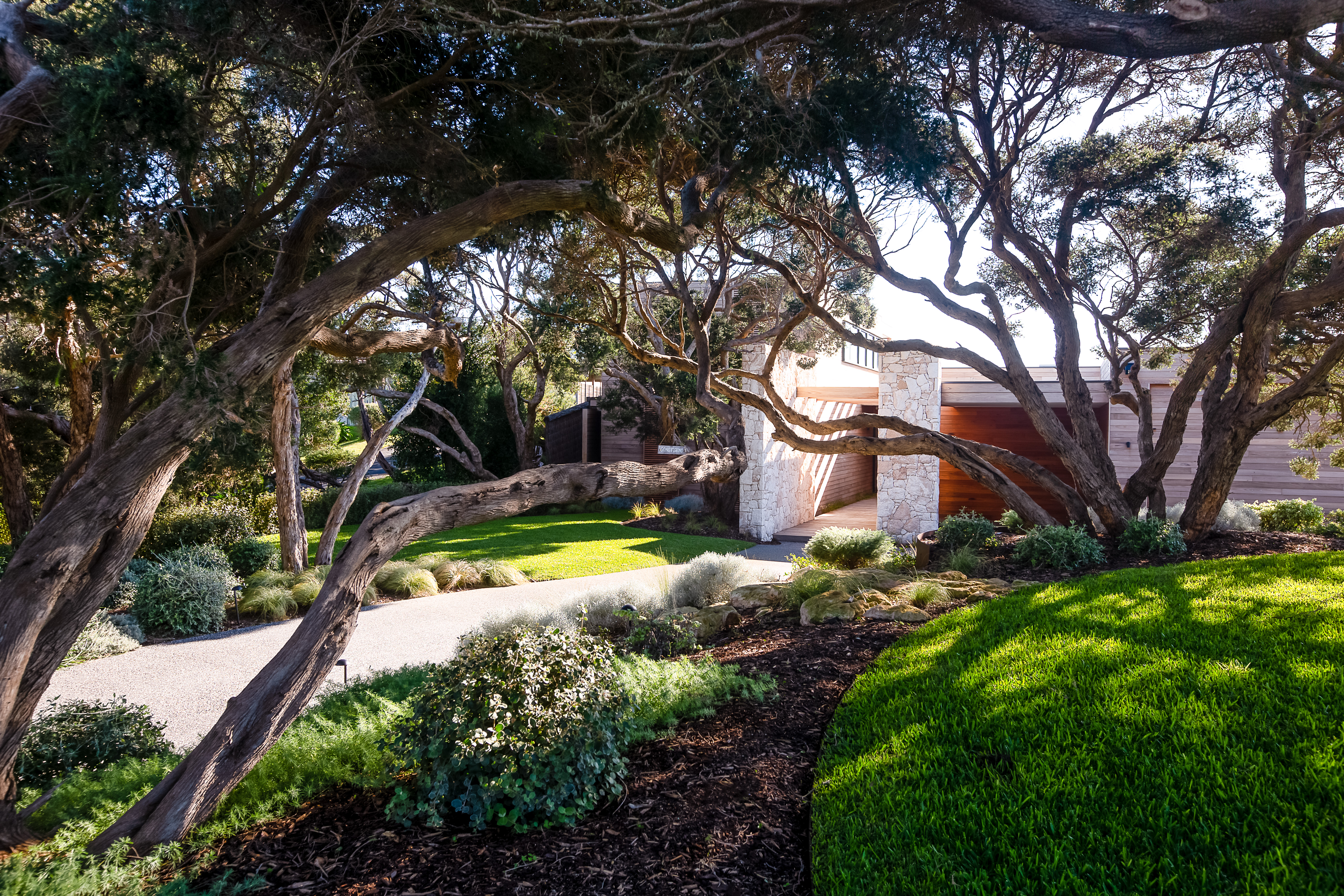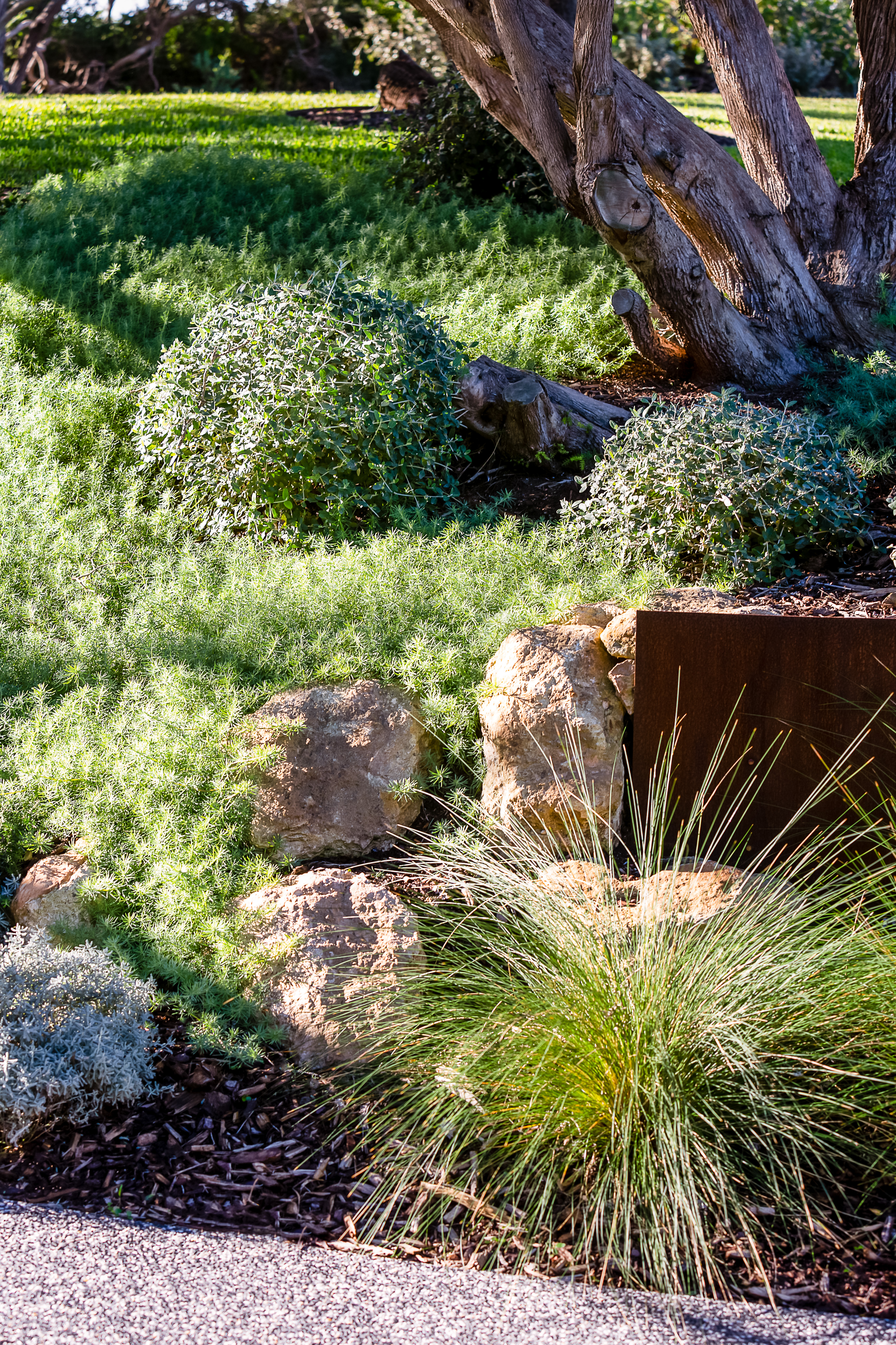 At the front the driveway weaved in and around the stunning tea tree and feature Moonah trees. Curved corten planters, local limestone boulders and plantings soften the steep bank.