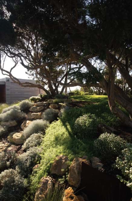 This site with nearly 6m of fall from the front to the rear as well as an array of protected tea tree and Moonah provided the designer with a challenge.