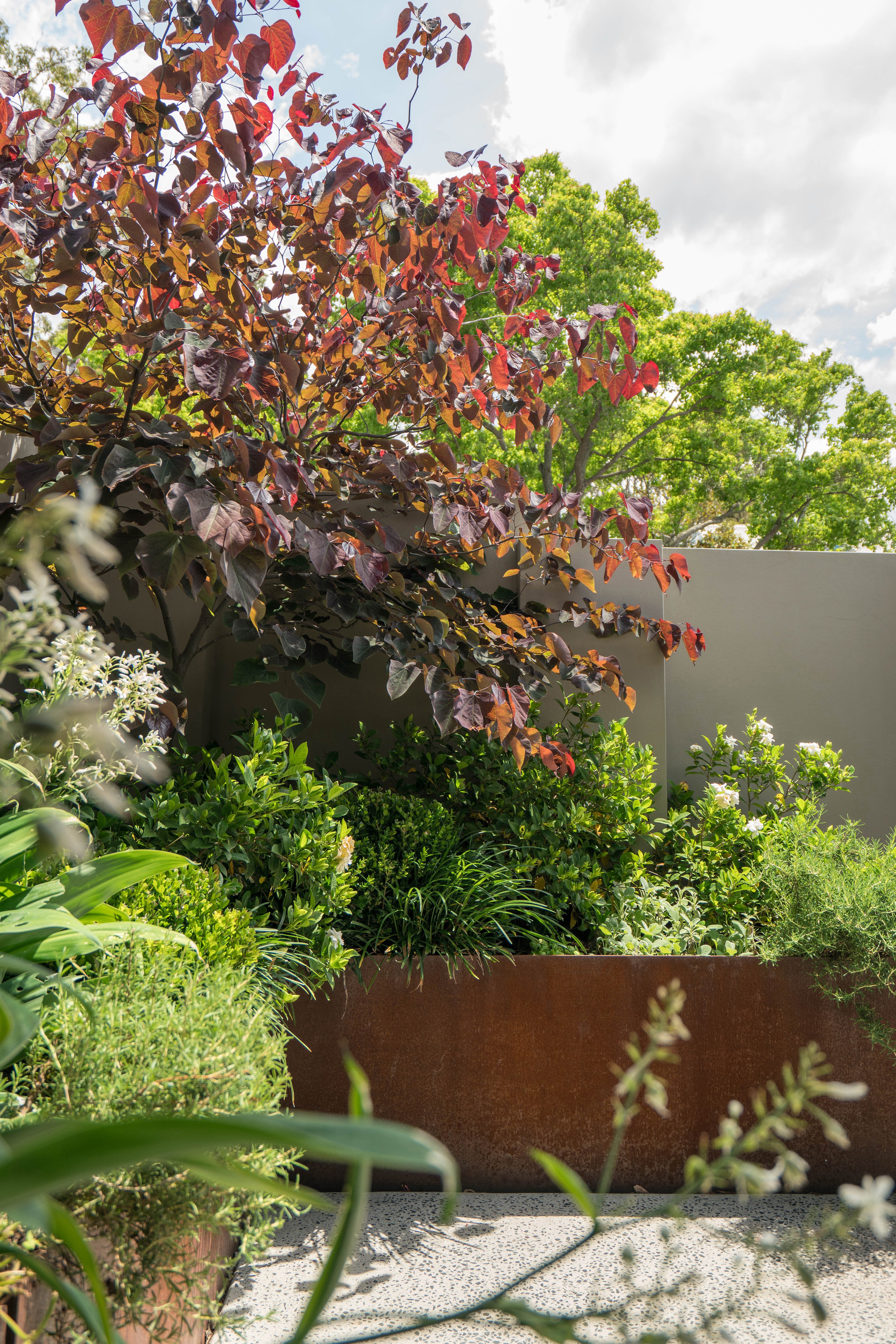 The large corten steel planter troughs in the front courtyard provide a dark contrast to the polished concrete paving, and provides a dark background for the lush green trailing plantings to stand out.