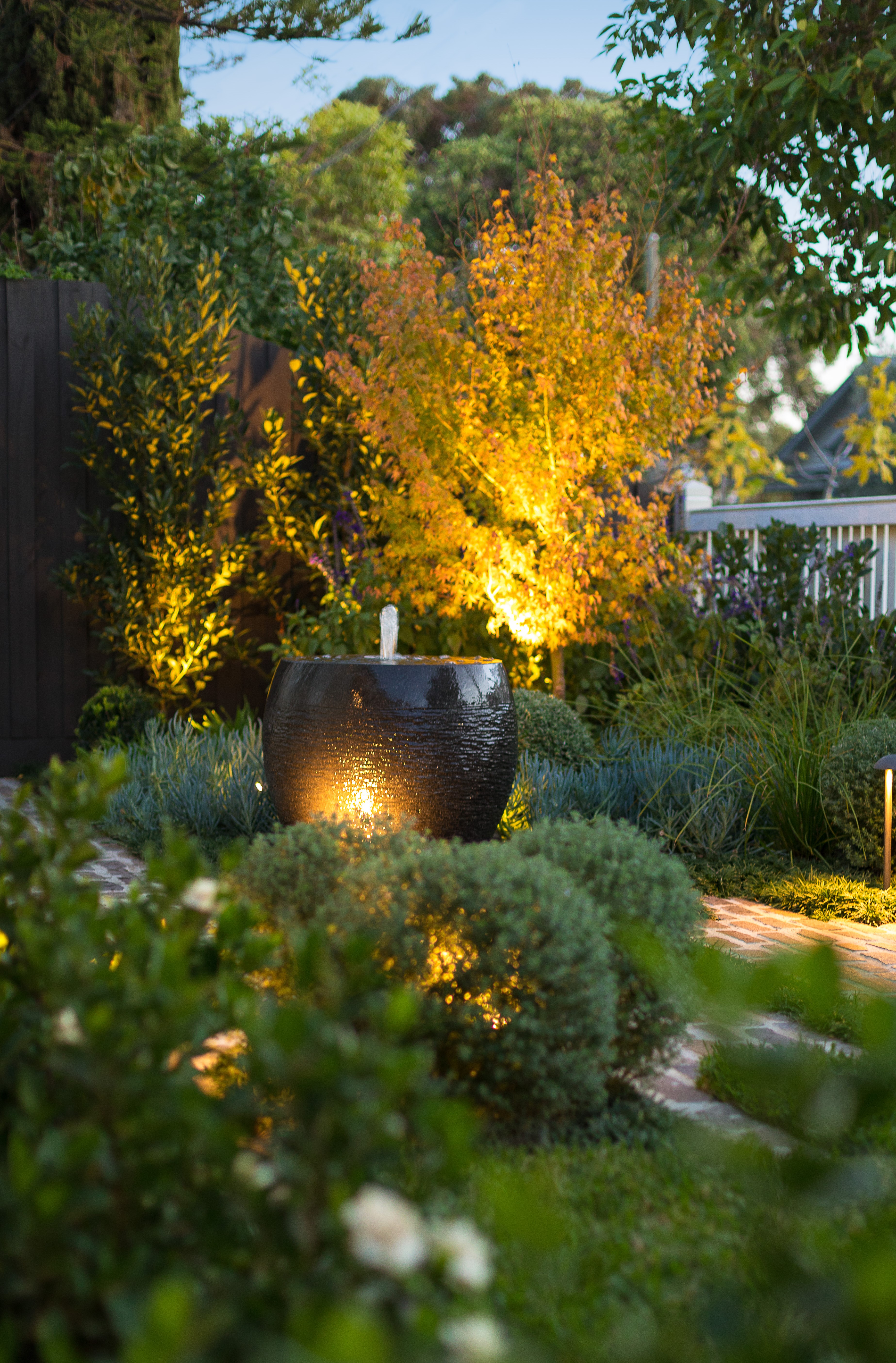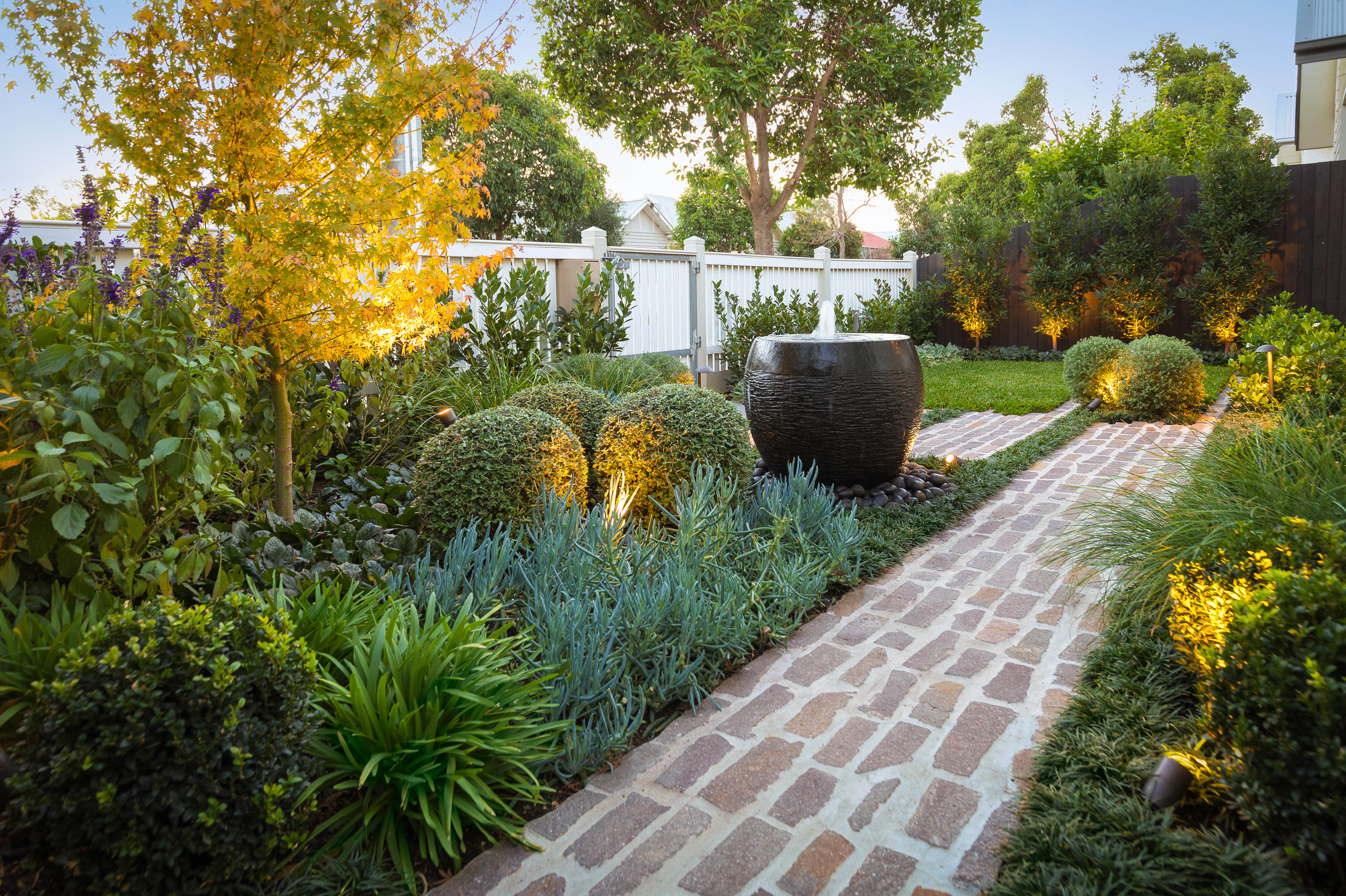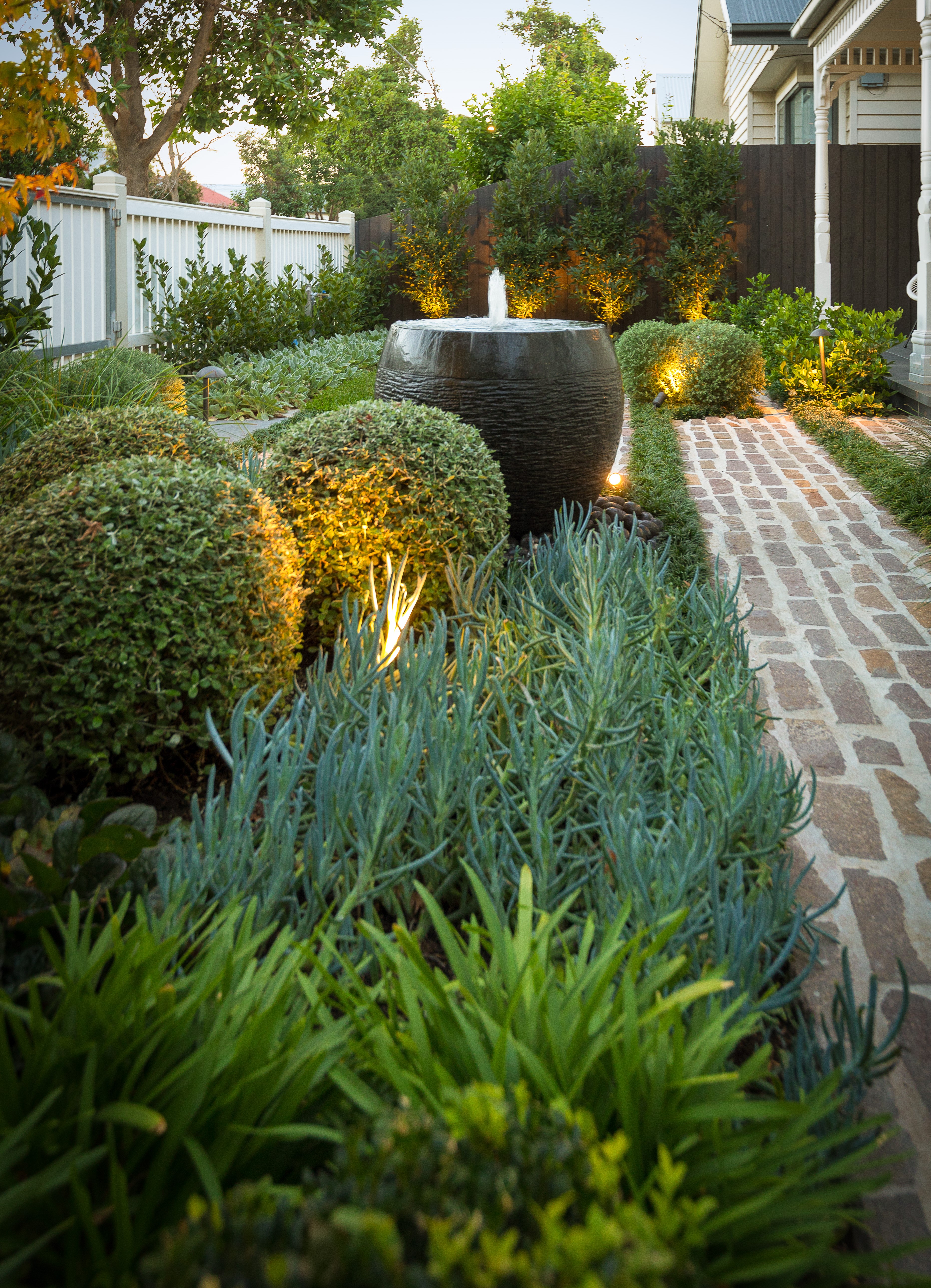 The entry starts with the informal filetti steppingstones and more formal bluestone pavers zones. The random ends of the filetti blur the lines between hard and soft and instantly relax the space and create interest. A water bowl delivers a sense of calm and the spheres of teucrium, westringia and buxus provide a contemporary take of clipped hedges. In and around these spheres lies, liriope, scenecio, ajugs, salvia and mondo which all nestle under the canopy if the crepe myrtle and bay laurel hedges.