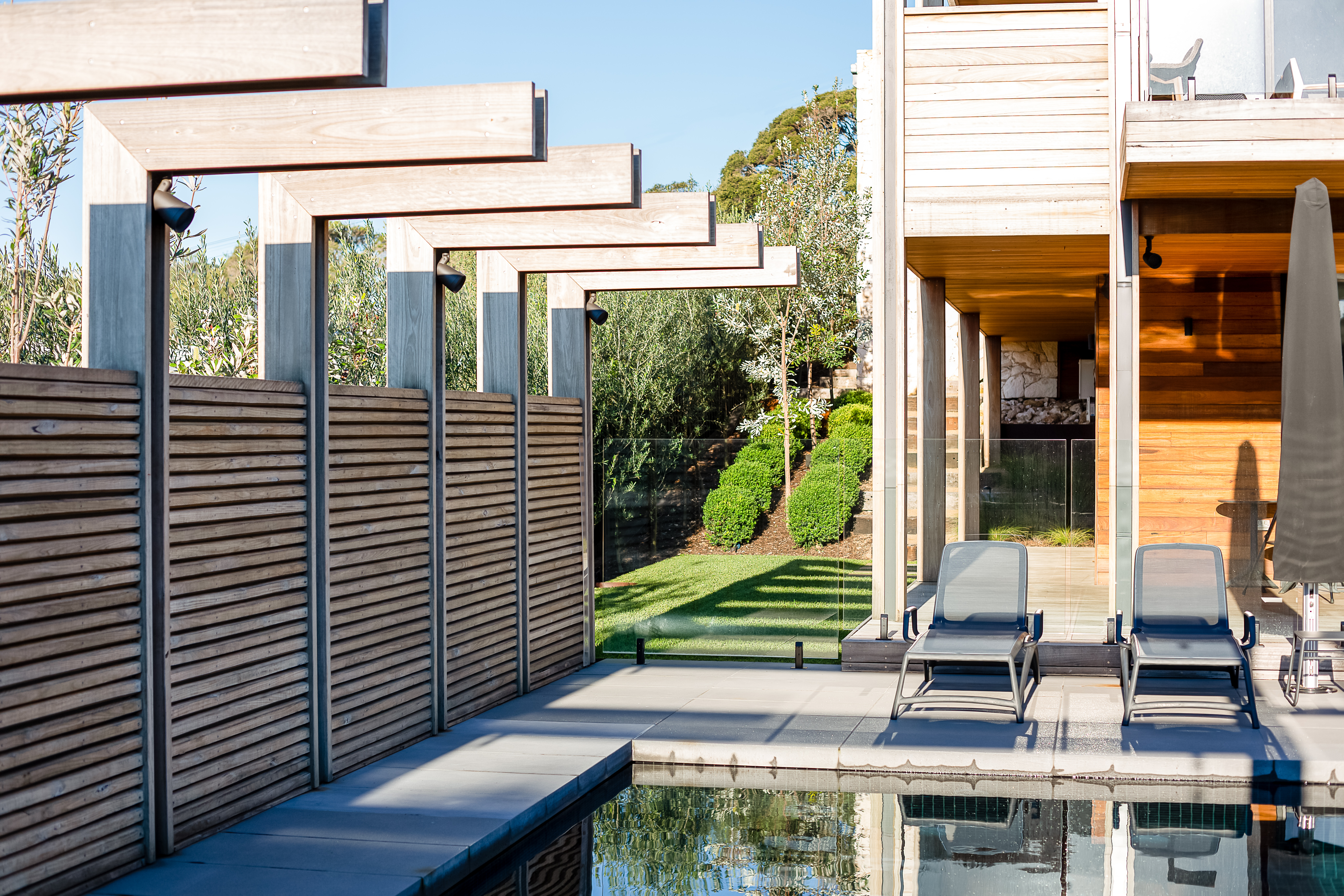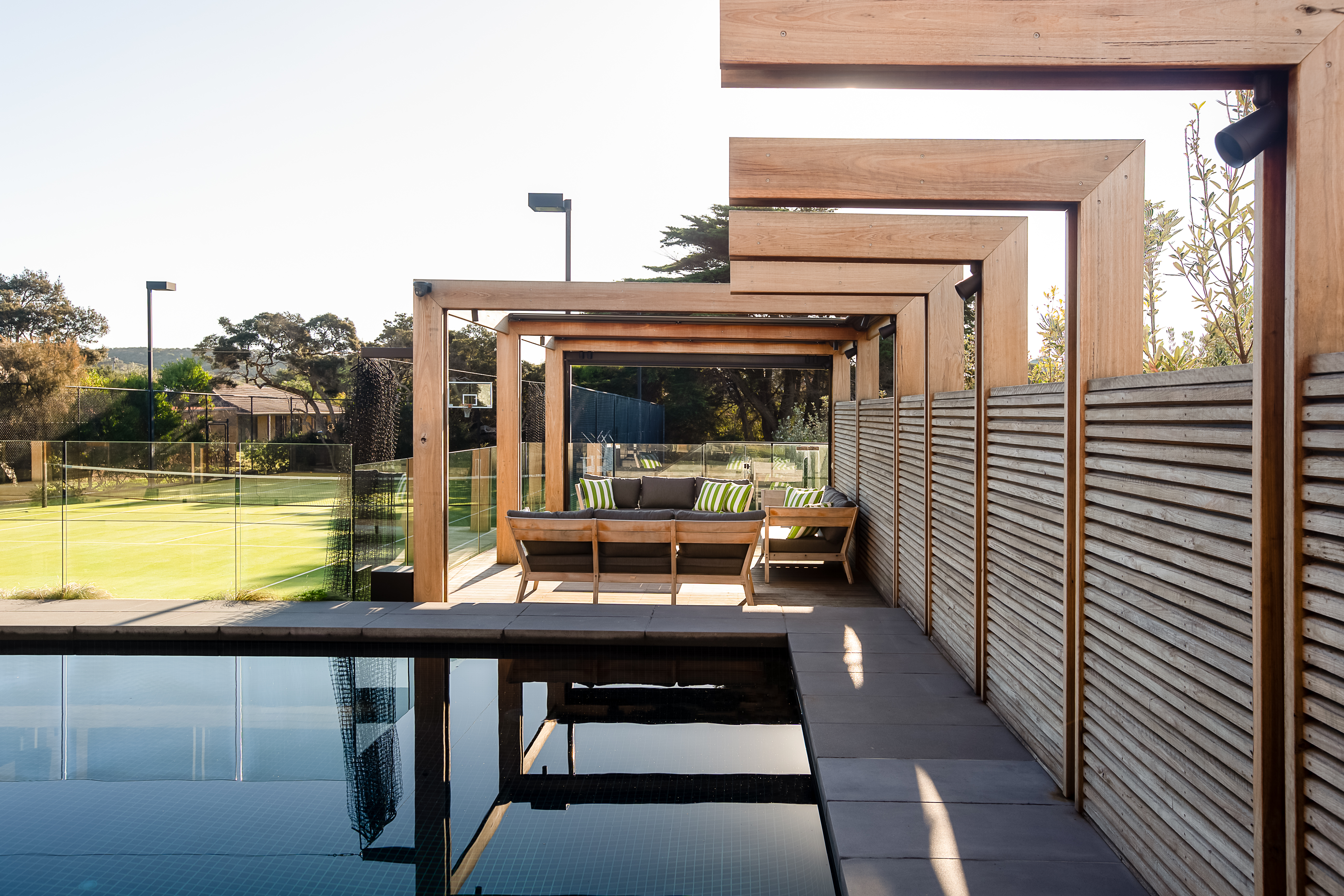 The arbors and the sitting deck service all areas including the the tennis court, trampoline and the pool areas and have built in shade awnings throughout for flexible shade options. Privacy was created using cantilevered arbors and a privacy screen.