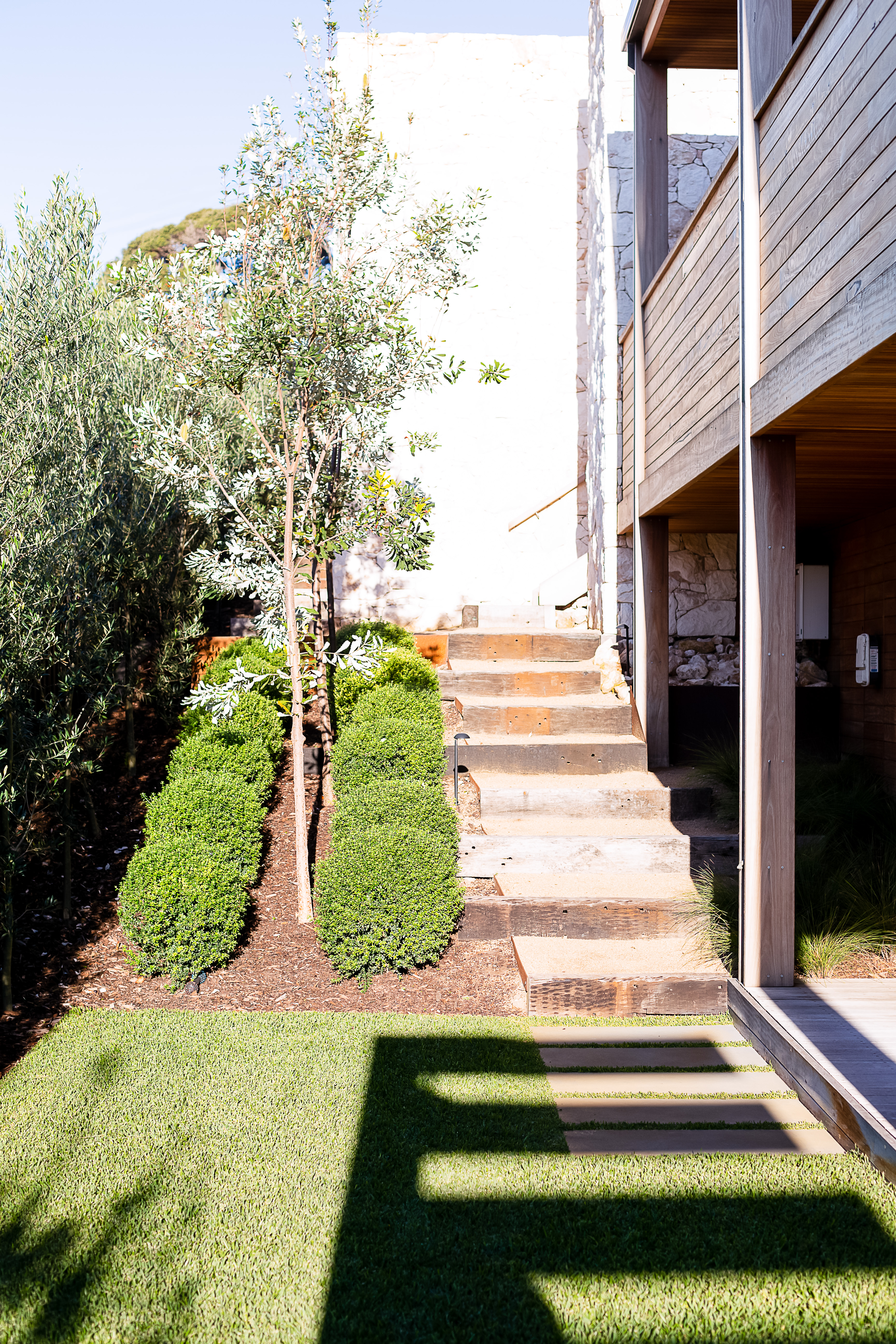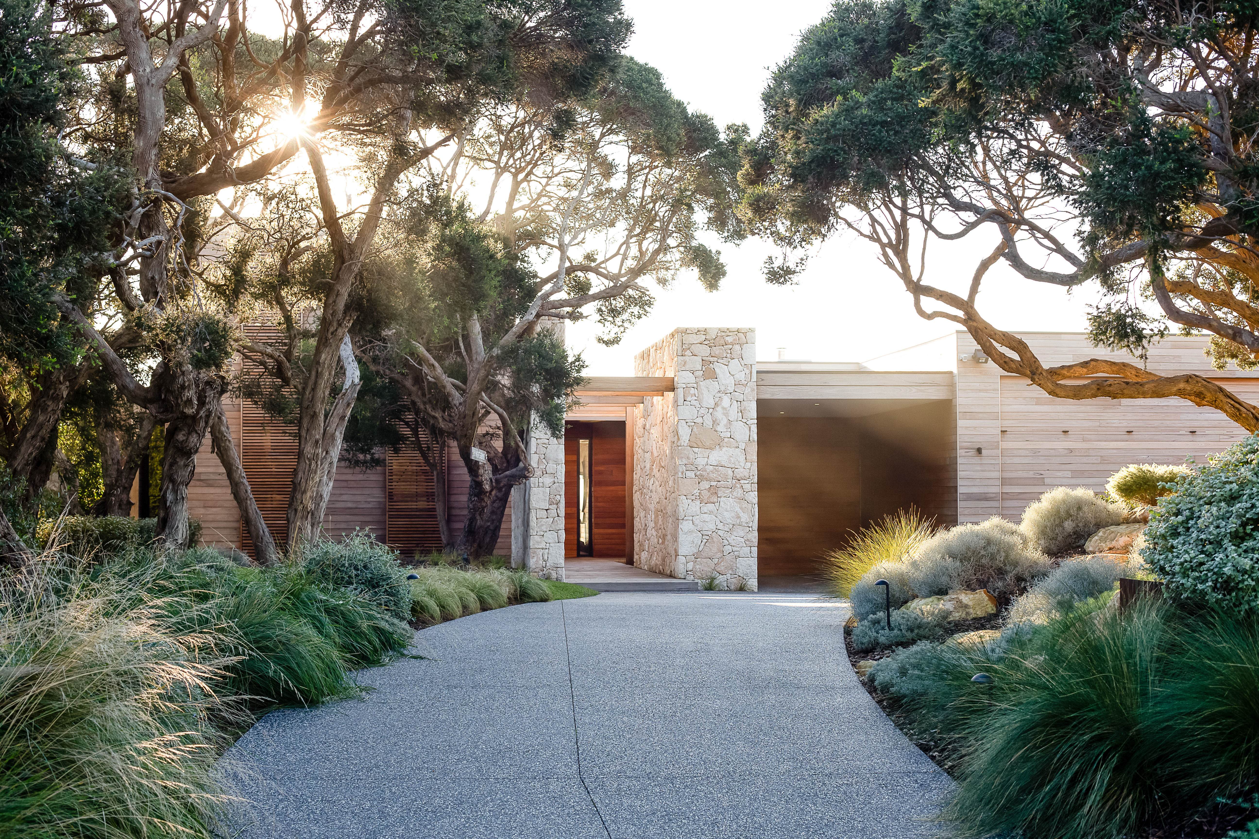 At the front the driveway weaved in and around the stunning tea tree and feature Moonah trees. Curved corten planters, local limestone boulders and plantings soften the steep bank.
