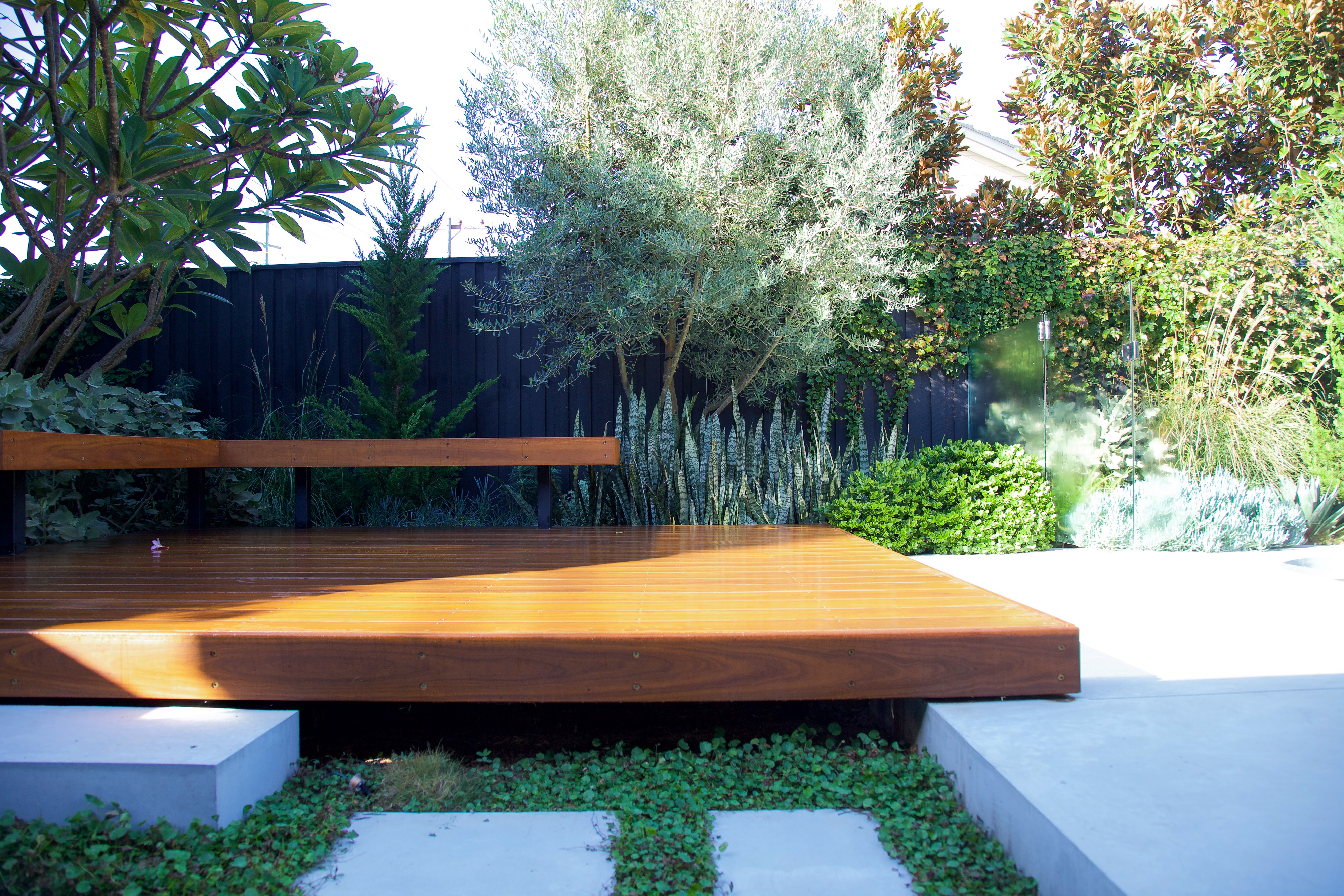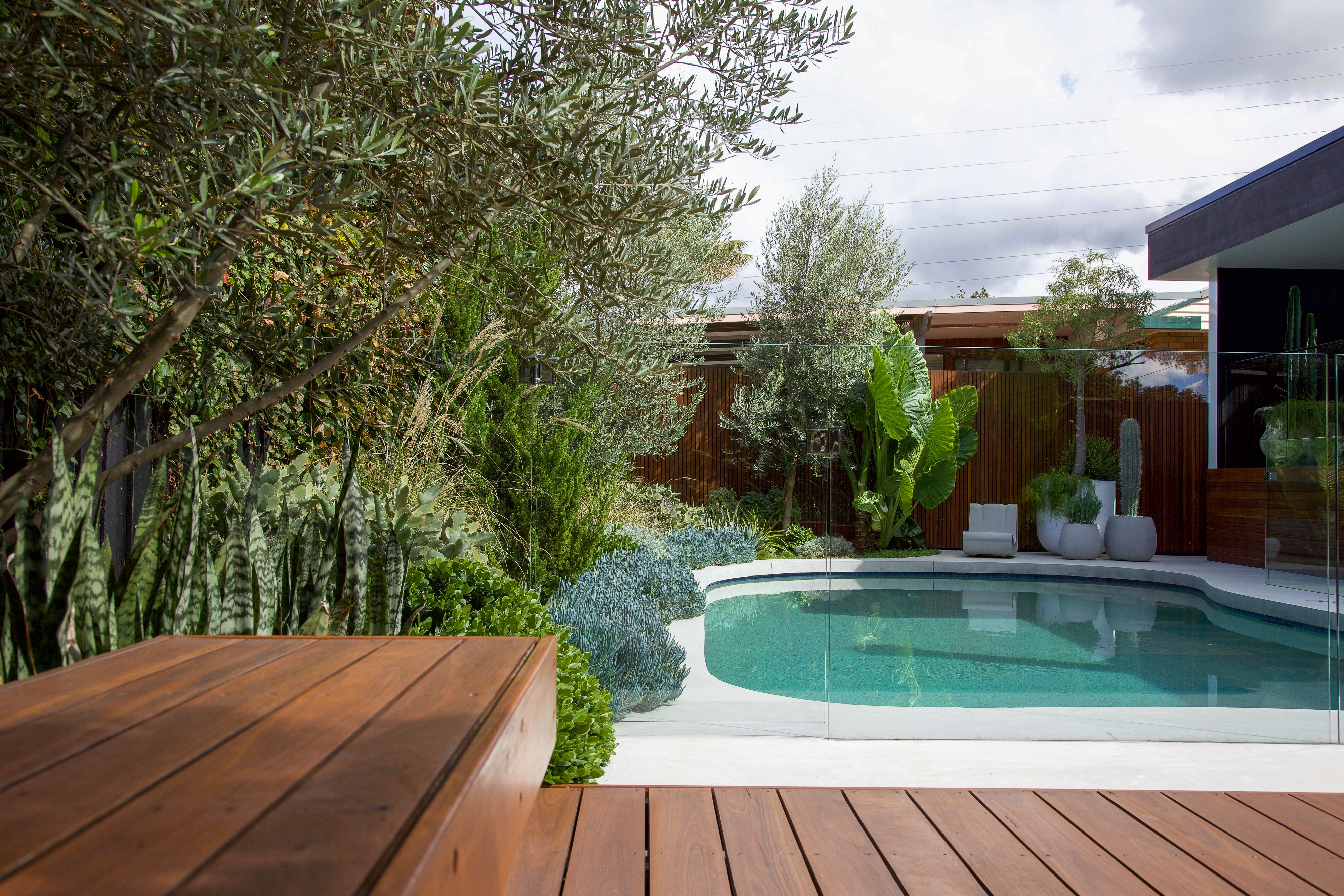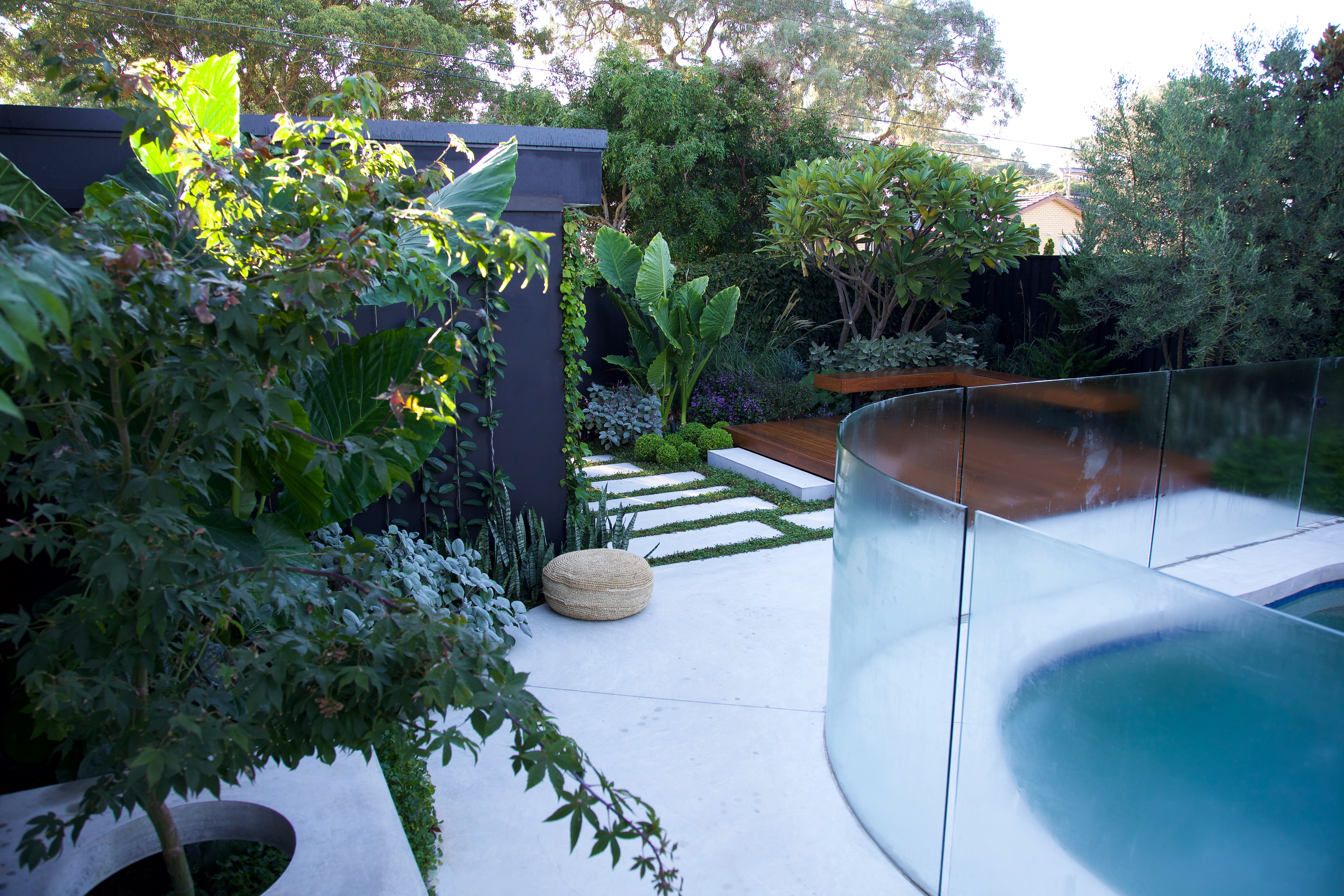 In the back garden a large floating pontoon slab provides a cool casual retreat out of the sun closely located near the pool entry. A curved glass pool fence reduces the impact of pool safety requirements within the back garden space.