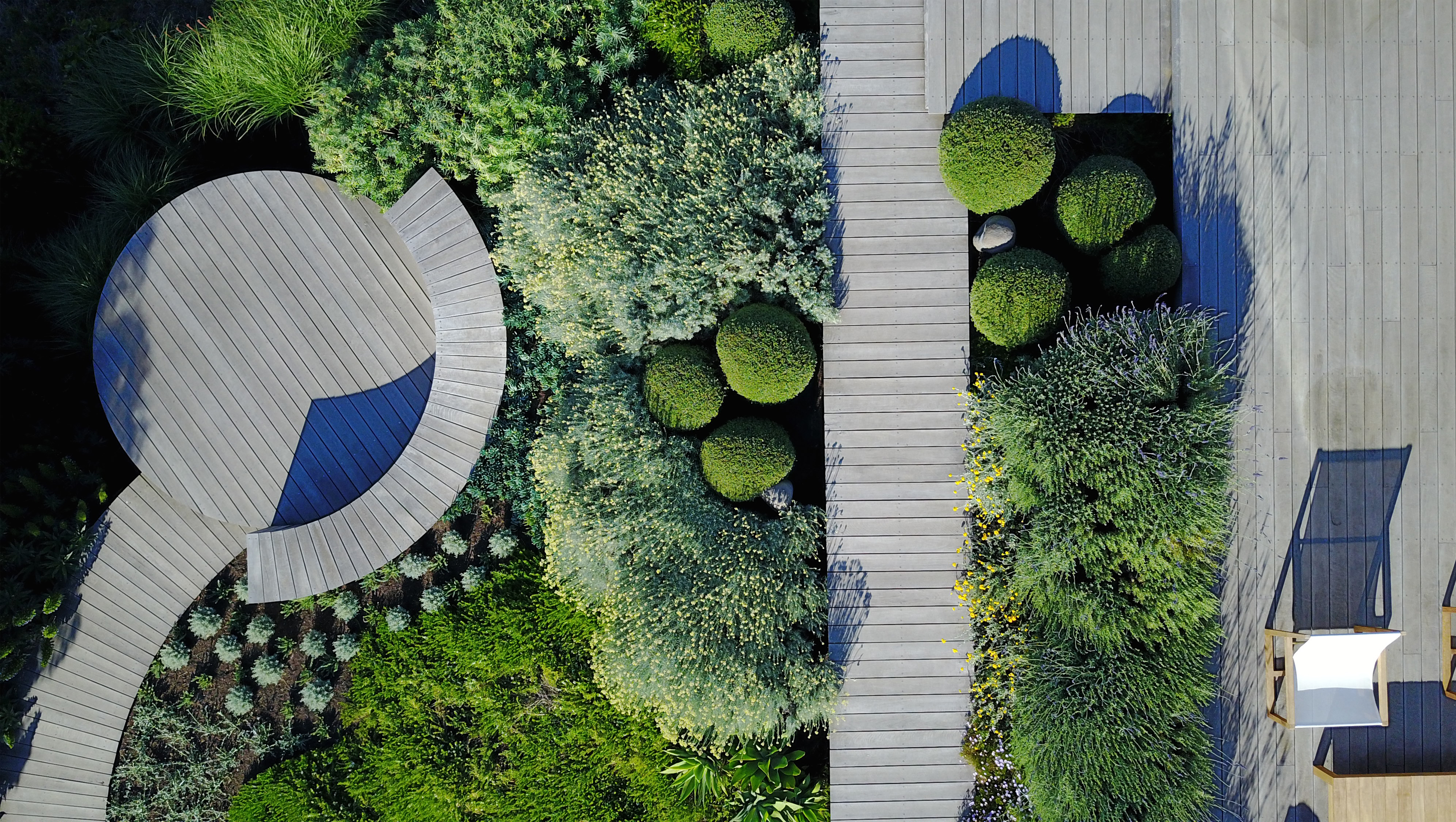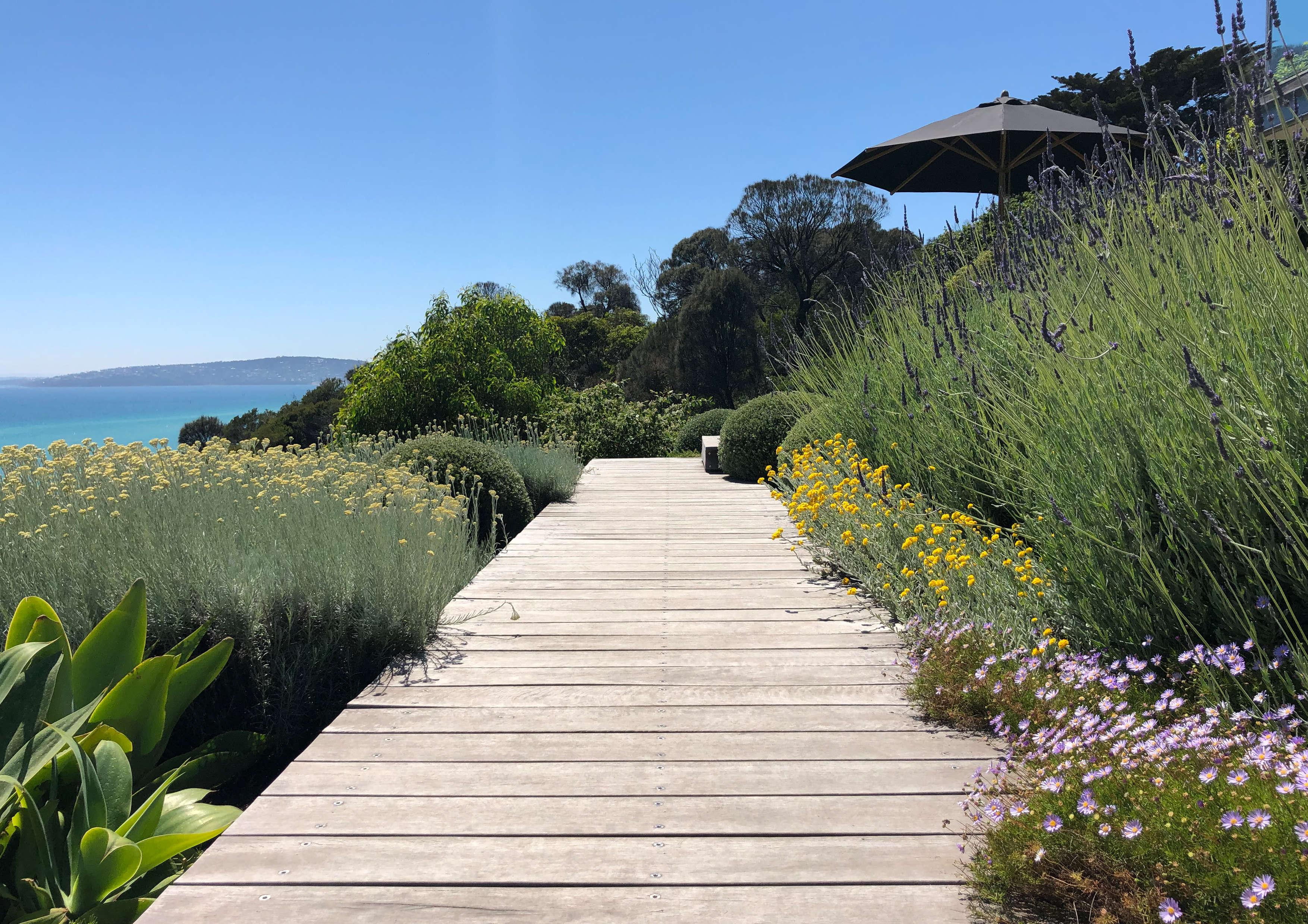 A sweeping timber boardwalk weaves a sculptural form throughout the garden allowing visitors to capture several naturally framed stunning views of the ocean. Plant species such as Westringia, Miscanthus and Lavender provide structure amongst a plethora of silver and green. The curved deck leads down to a viewing platform with breathtaking views of Port Phillip Bay.