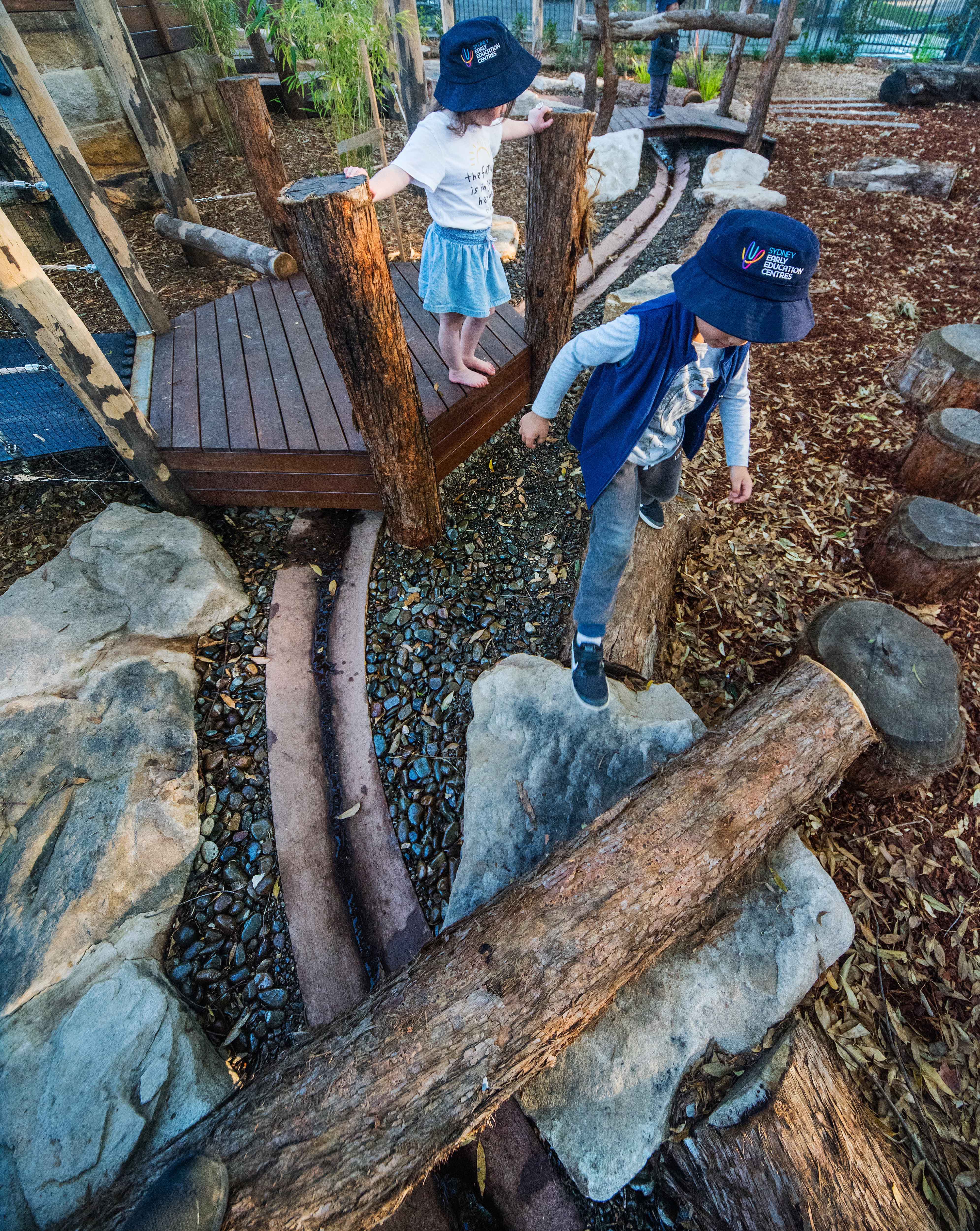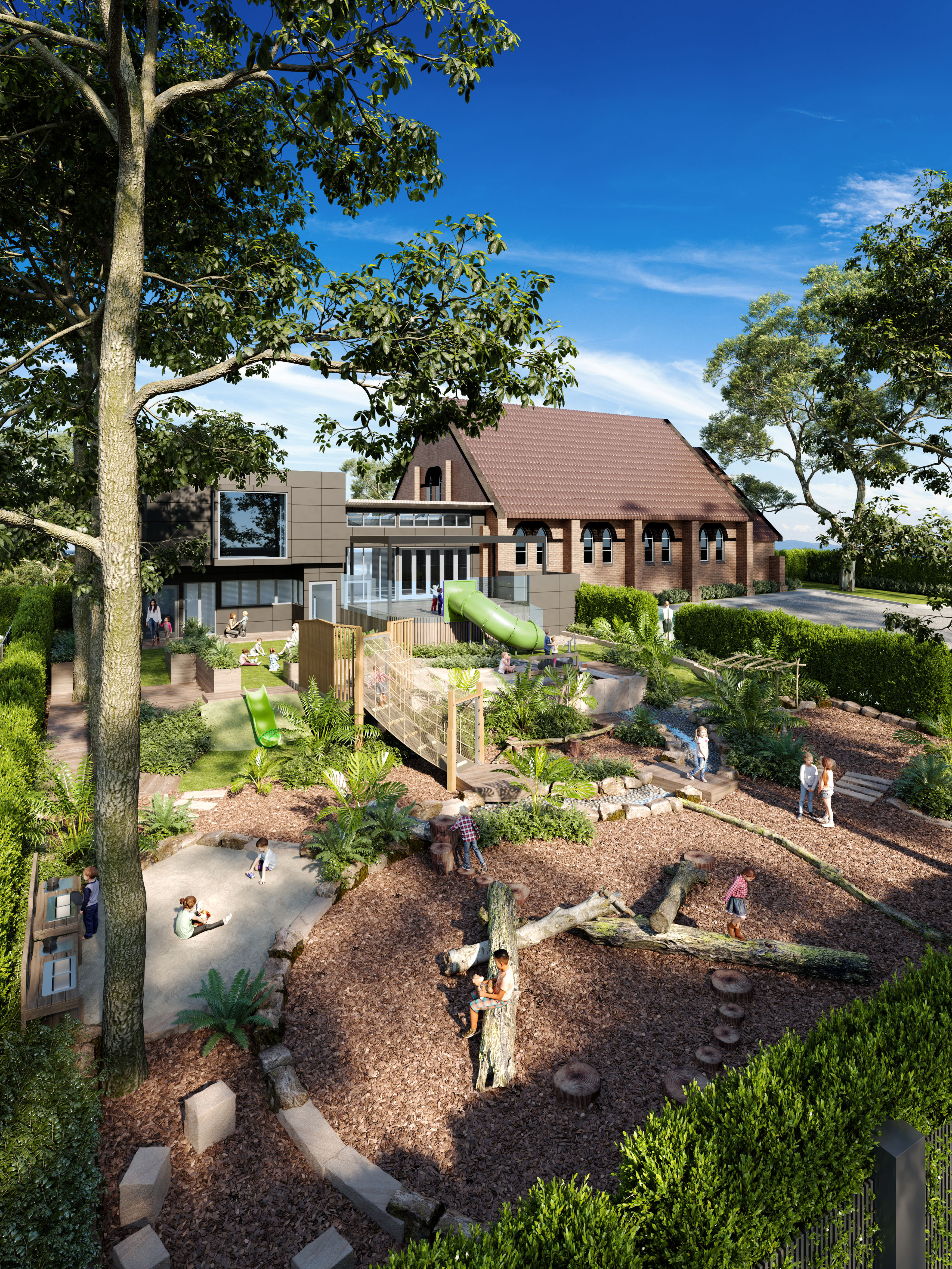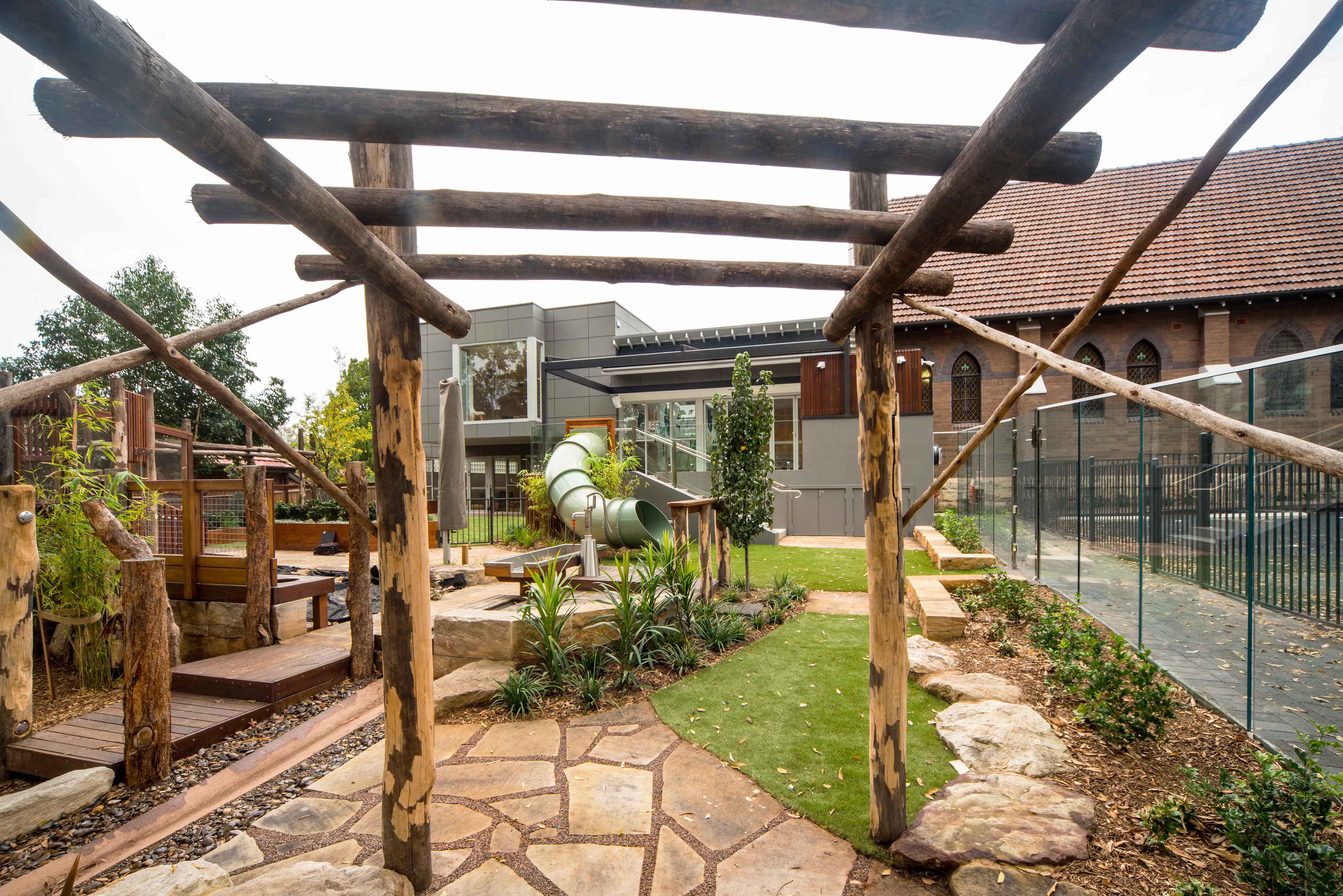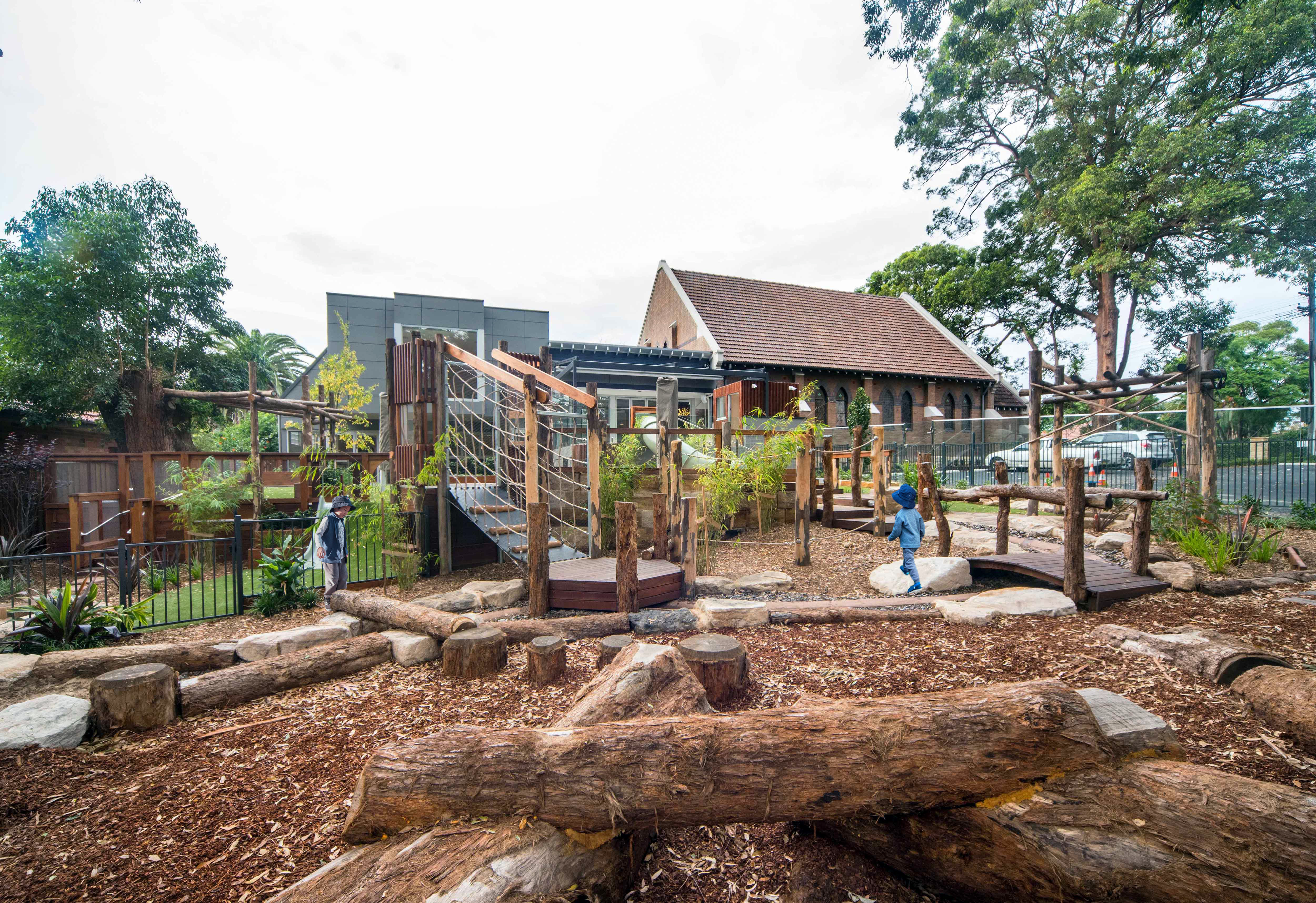 The brief was to design a high-quality natural playground for a new sixty place Early Learning Centre at Cheltenham. The site was an unused heritage listed church that had been purchased for renovation and conversion, including the provision of the new playground environment.