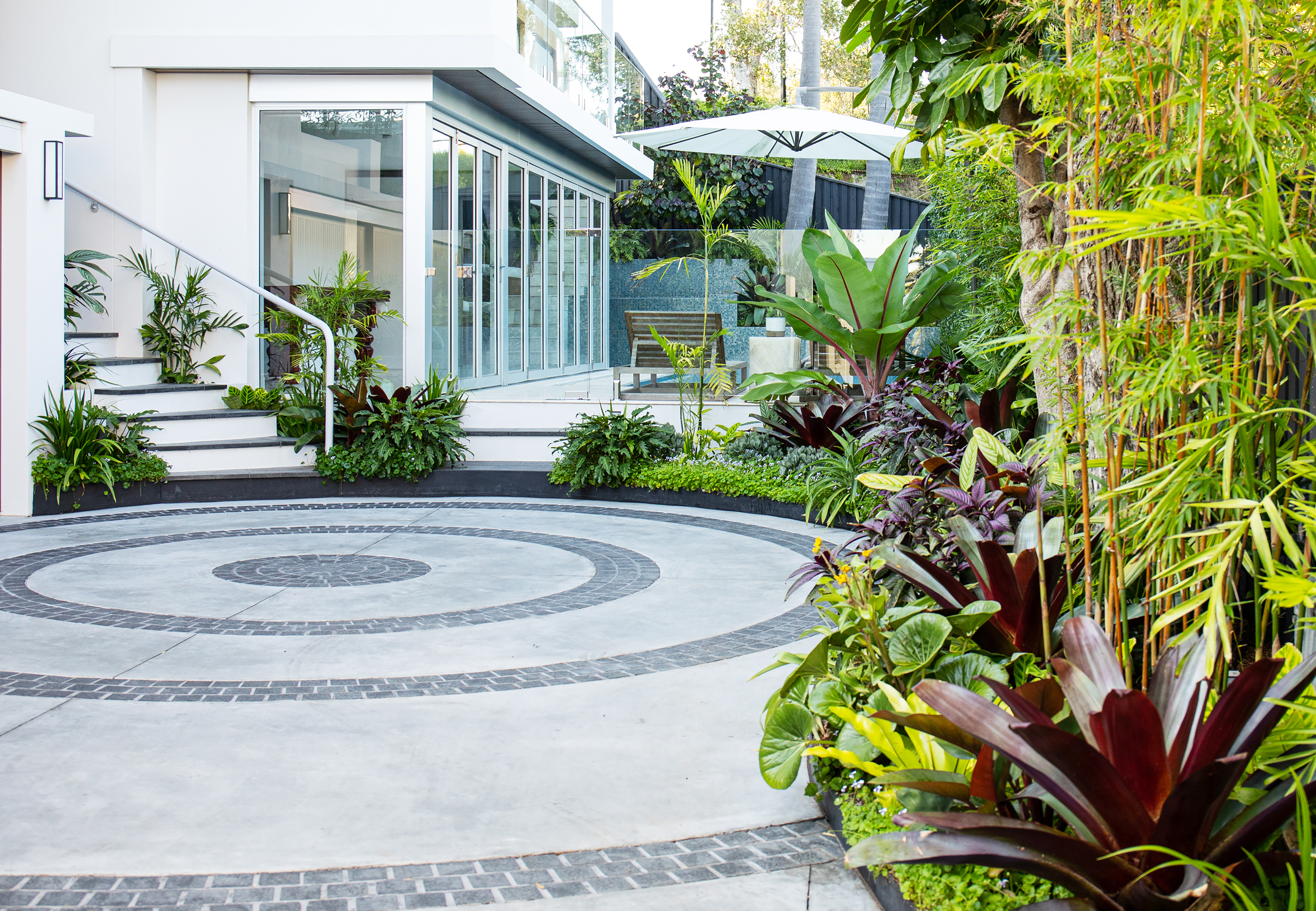 This is a dynamic design that has brought lushness, scale and vibrancy into the landscape. The strong geometric circles on 3 levels have created cohesion and scale, and the choice of textural plants, which are bold and colourful, compliment and strengthen the design.