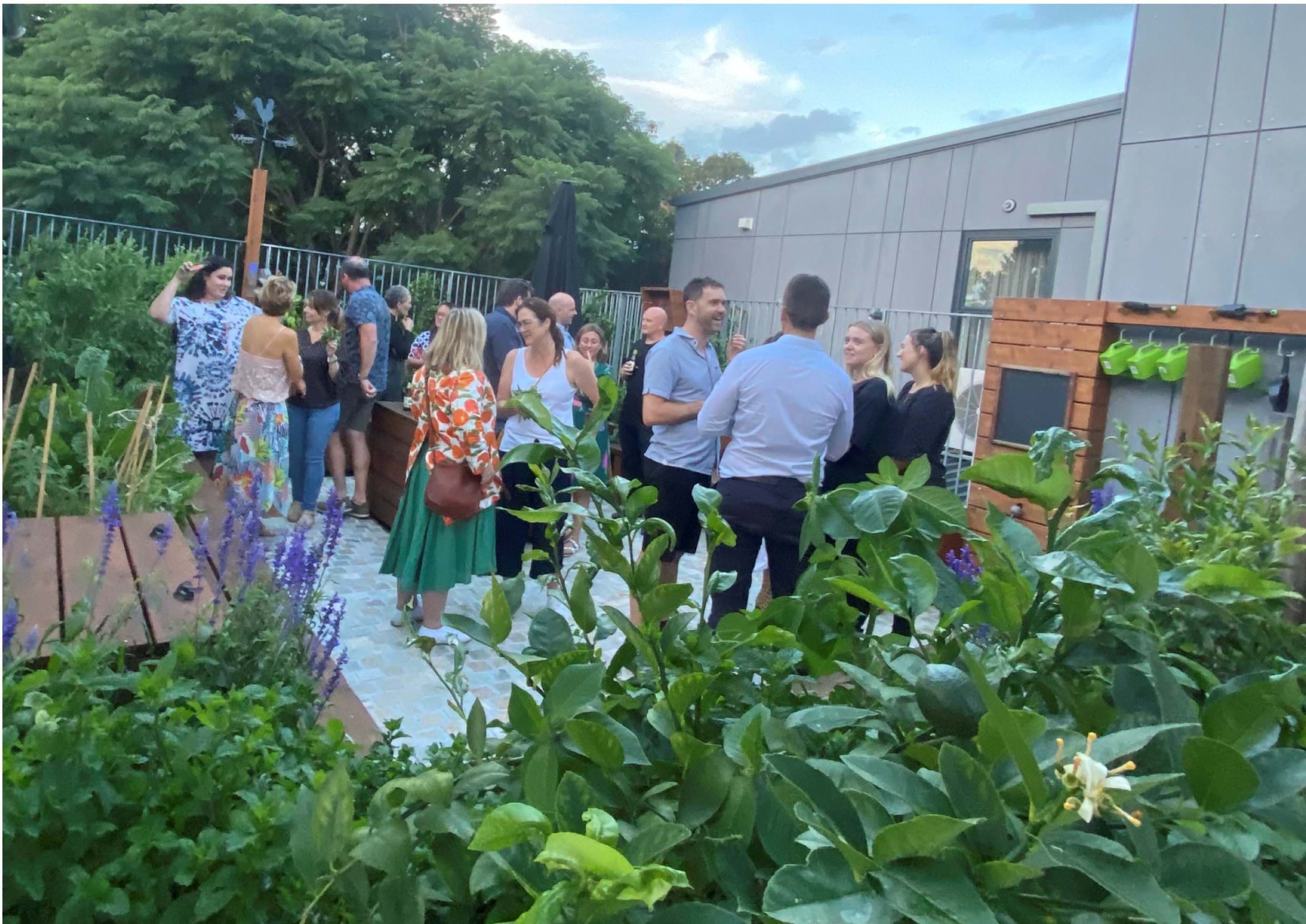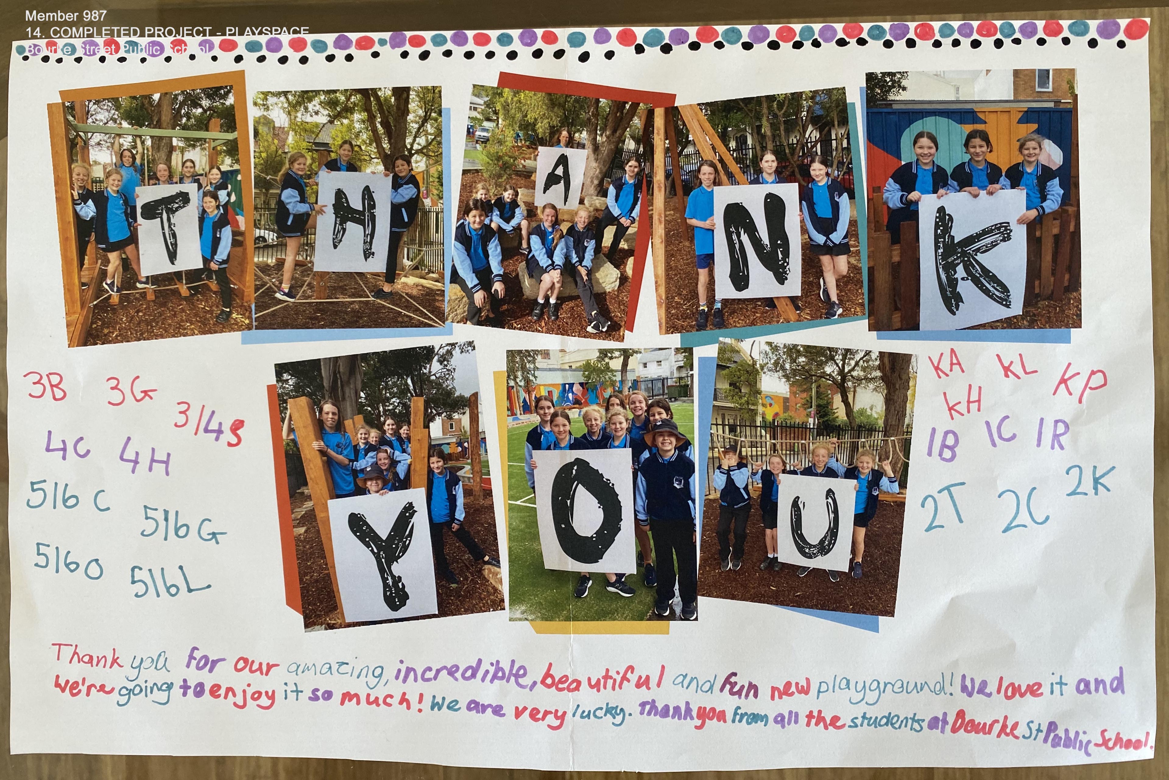 Off-form concrete walls delineate the sports court and play areas. Undulating concrete walls double as a seating edge and create a sweeping, organic curve to break up the geometry of the surrounding structures. A large vibrant mural on the fence line, has colours that are picked up in the play space elements. The natural play space was designed to carefully weave its way through the existing trees. A rooftop garden includes productive gardens, storage for gardening equipment and elements that help teach about sustainability.