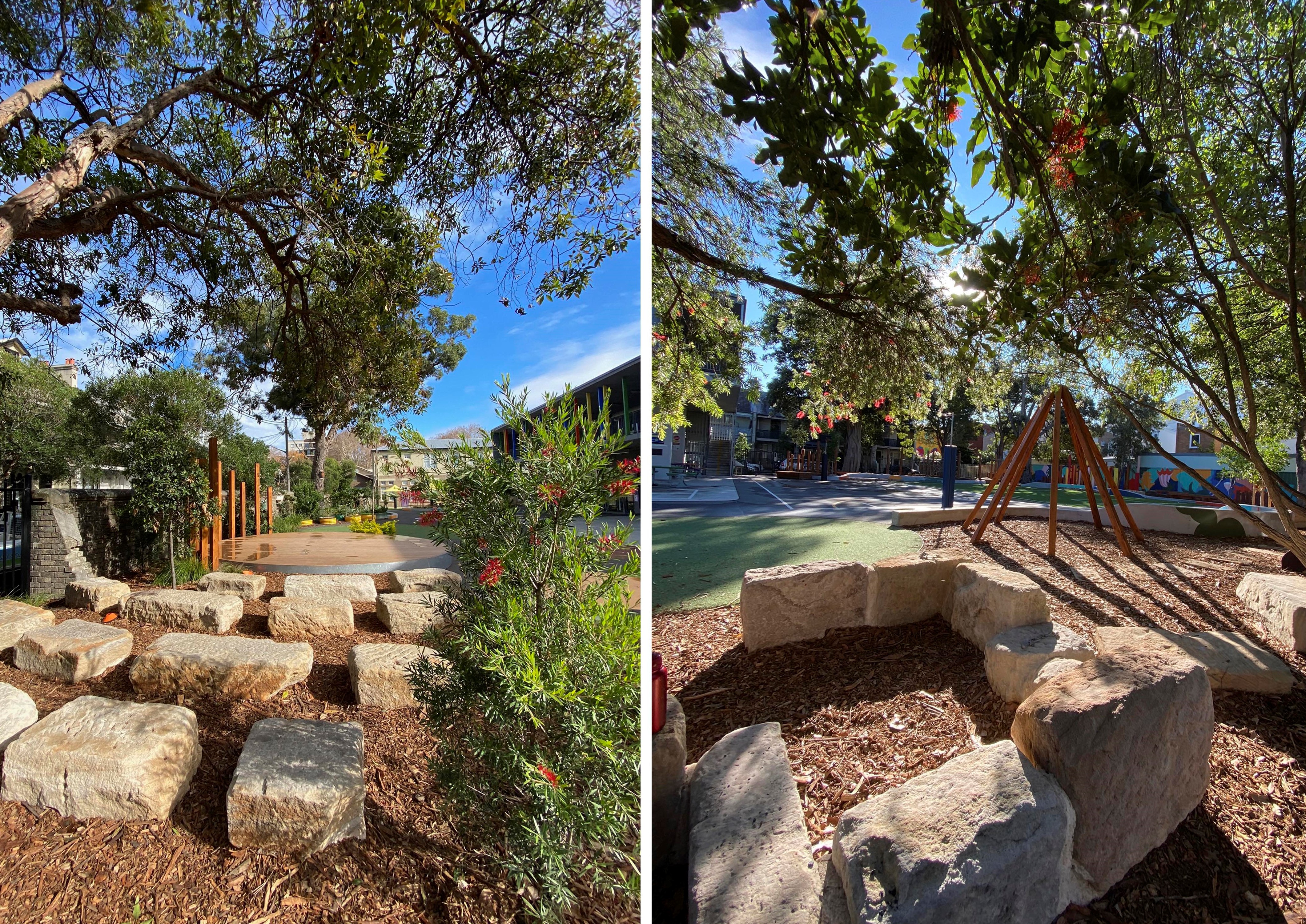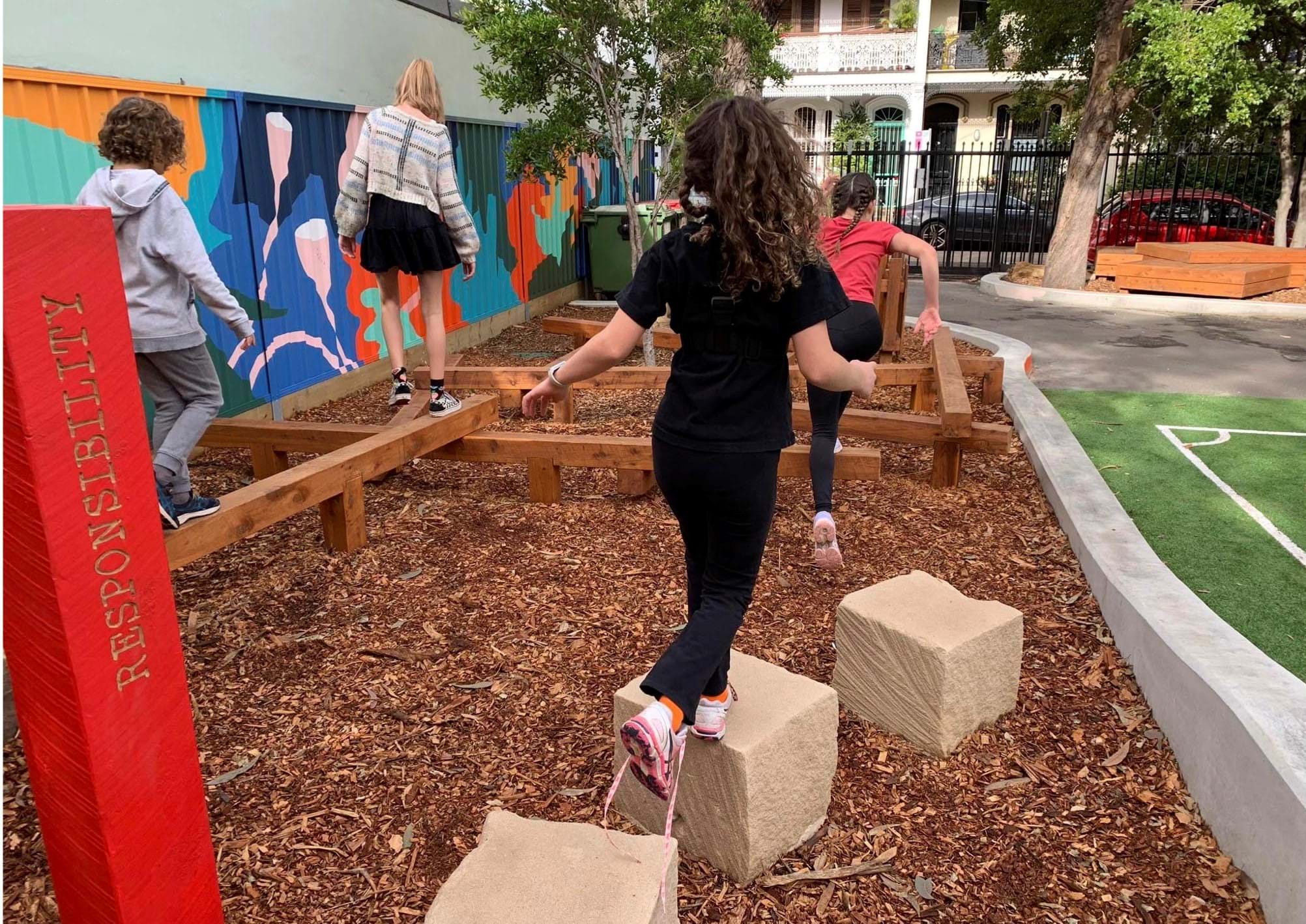 The design for the school in the inner city of Sydney was to maximise the usable outdoor play area to create diverse, engaging areas for learning and play. It was to be mindful of the site's heritage while responding to a large, newly constructed modern building, use reclaimed site materials, provide habitat, contain food producing gardens and create a rustic, natural feel to counterbalance the surrounding high density city scape. Risky play elements for the older children and gross motor and imaginative play elements for the younger children were to be included. Their location was to be carefully considered to create a harmonious play space that avoided conflict between active and passive play types.