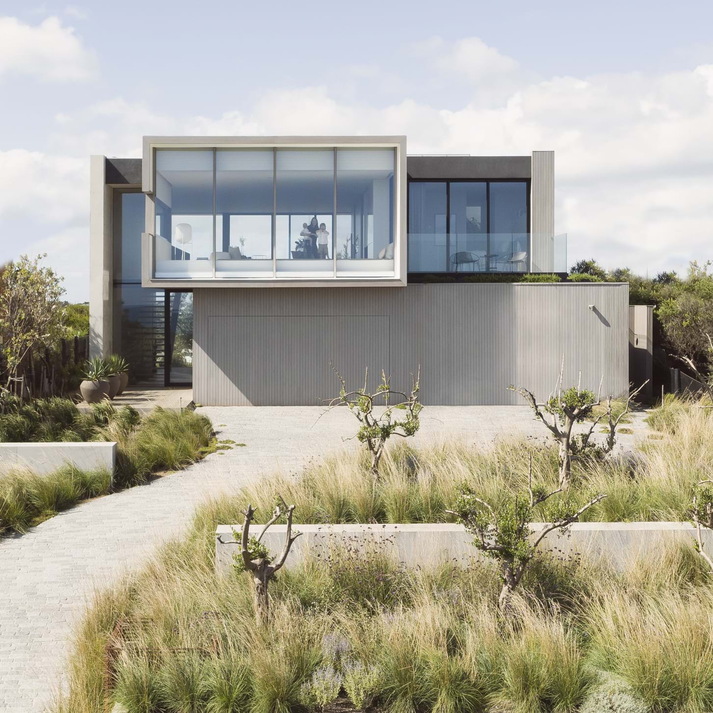 Large monolithic concrete planters were used as sculptural elements within a soft plant palette but these were also designed to act as retaining and help with the sandy dune conditions.