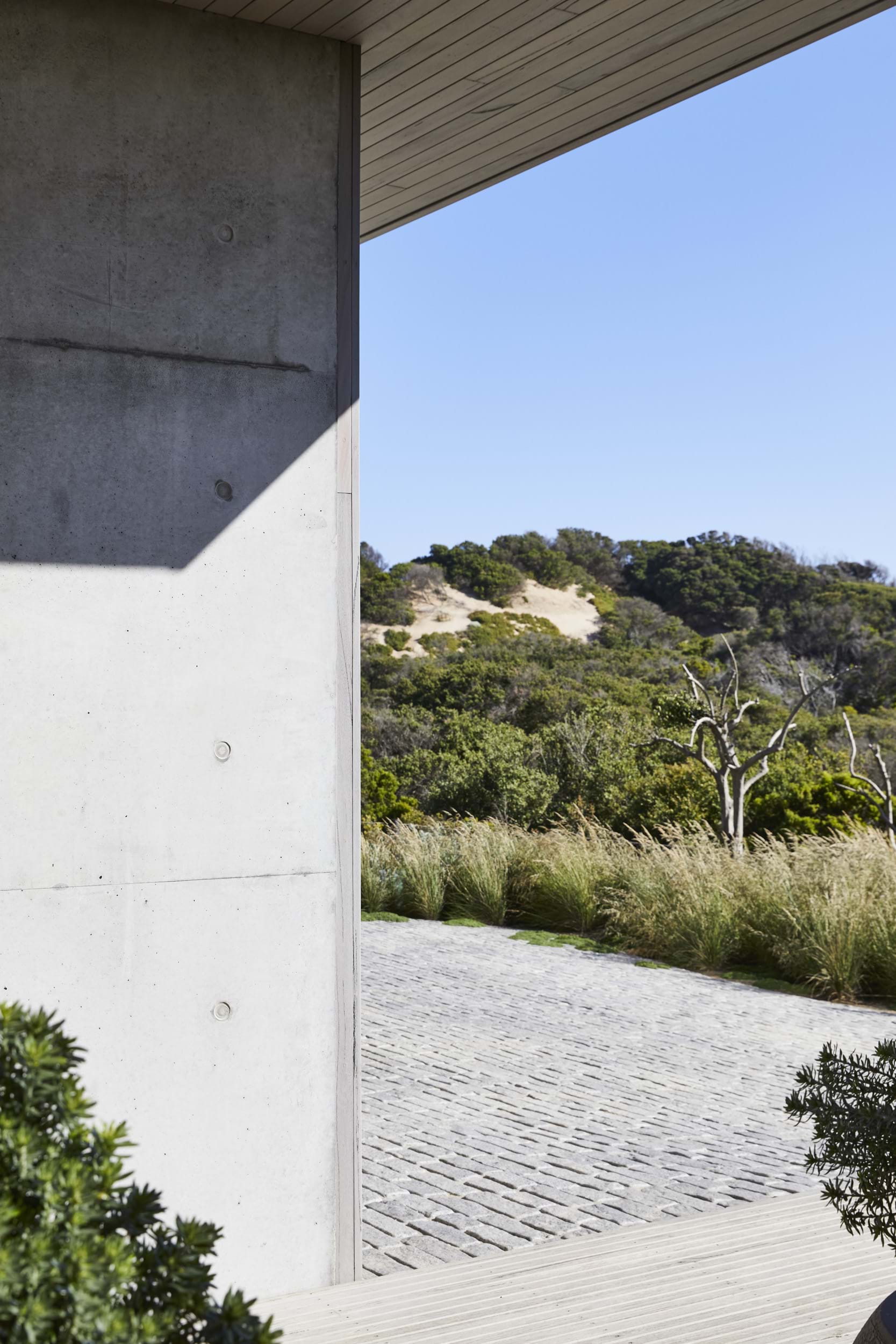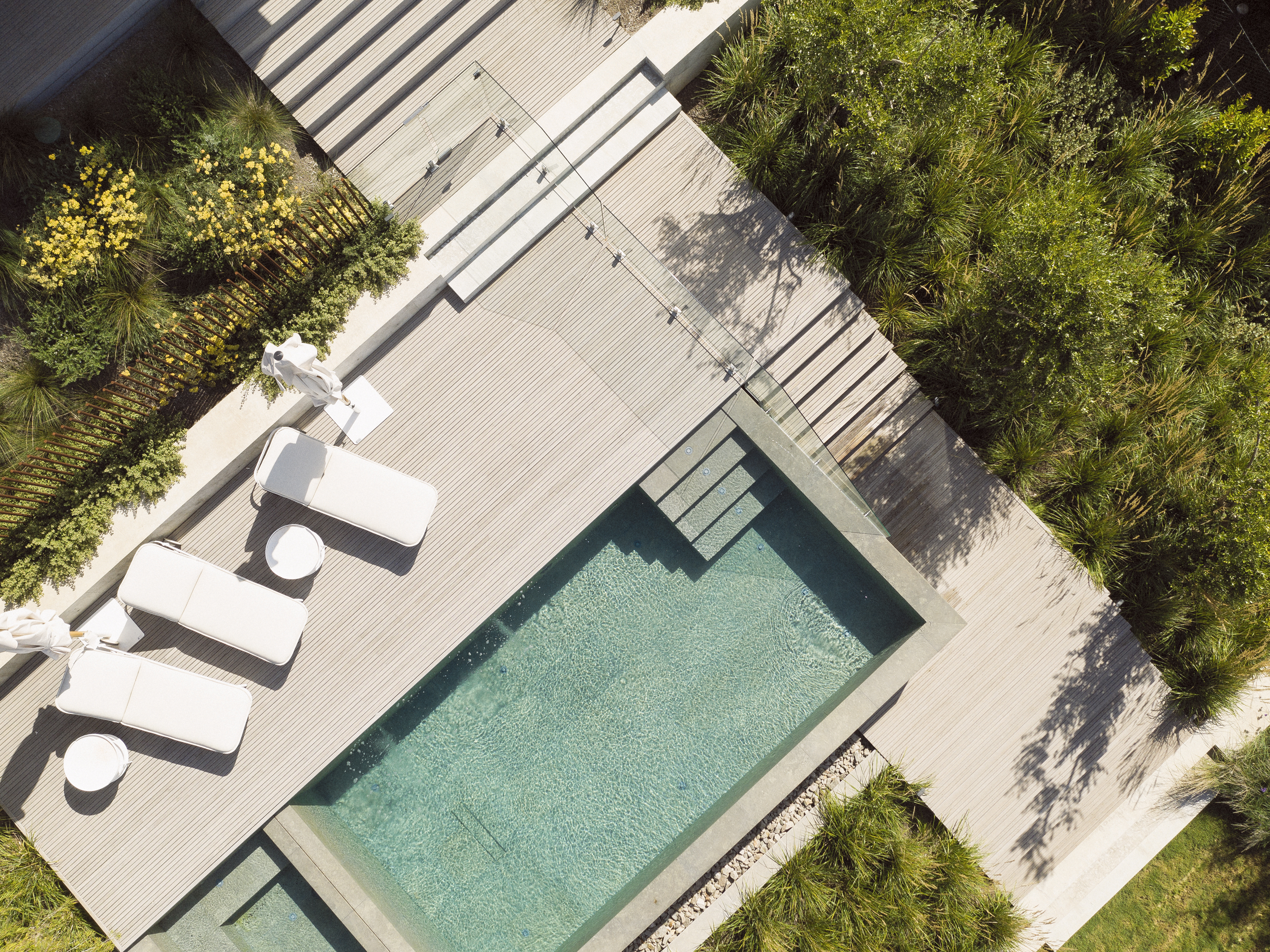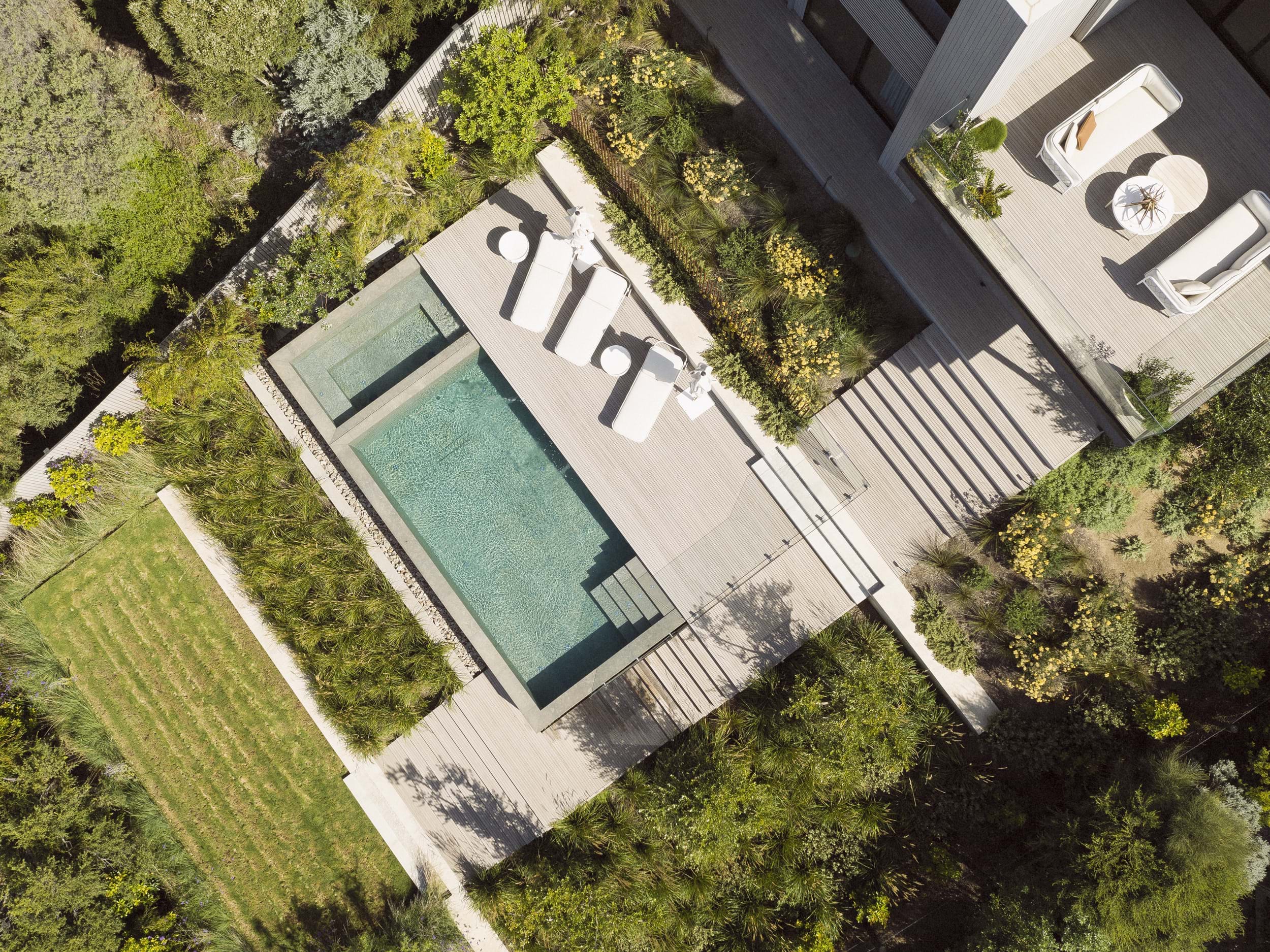This project was about connecting the architecture to the coastal conditions. Being coastal, the site was exposed and received brutal winds that whip off the ocean so a landscape that was sympathetic to the site context was important. The pool is multipurpose acting as a beautiful water feature to look on to from the house above and helping to terrace the site, activating the backyard by creating levels that can be used by the family.