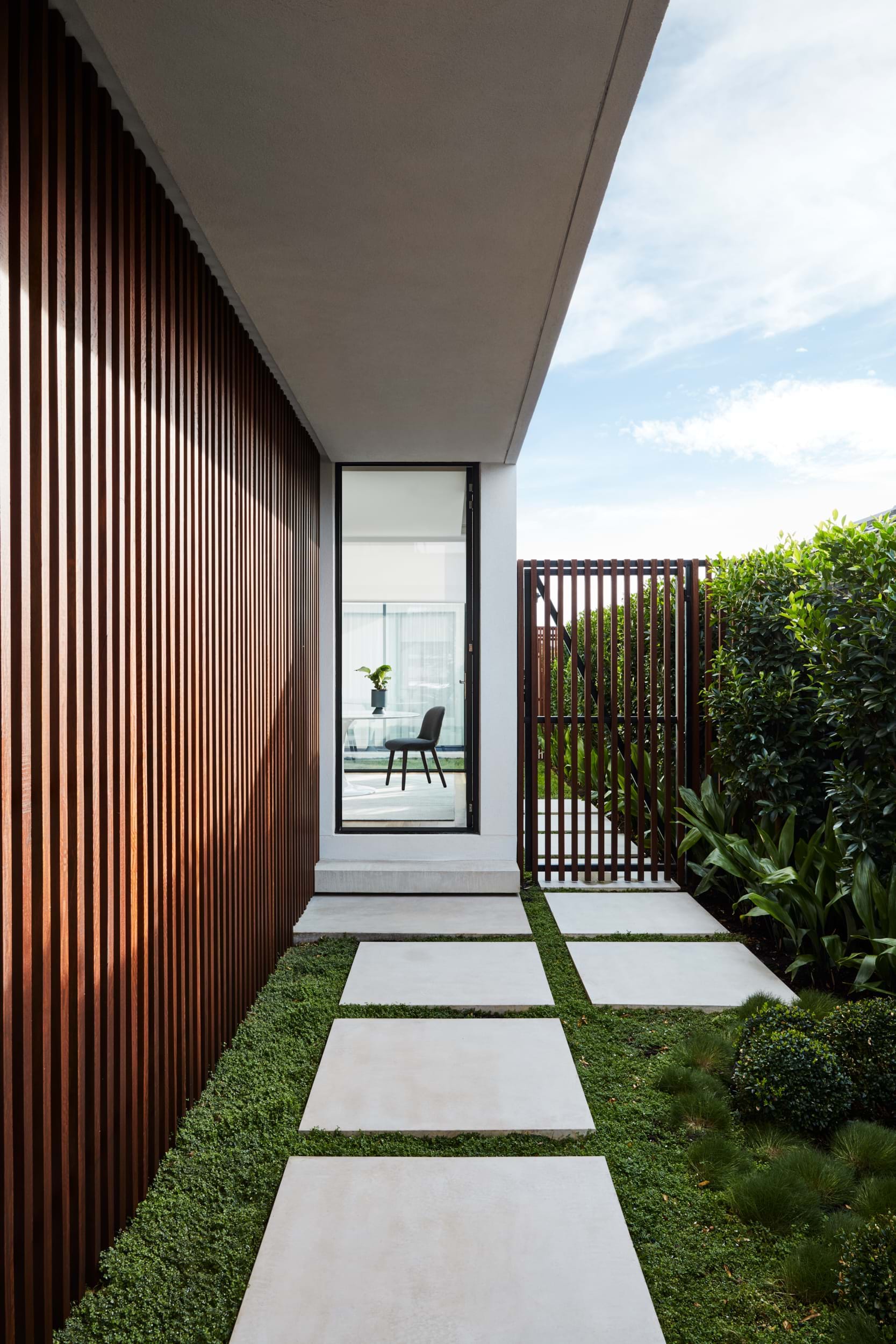 There is a clever placement of plants inviting the garden indoors. The steps at the front of the house lend themselves to the design, simple and stylish as is the selection of trees. Plants almost cocoon the entire house providing privacy and a sense of calm. The design works well with the monolithic architecture of the home. There is an interesting use of bricks going into the pool as cladding rather than pool tiles. Thoughtful detailing of concrete showing evidence of the construction process adds to the industrial vibe.