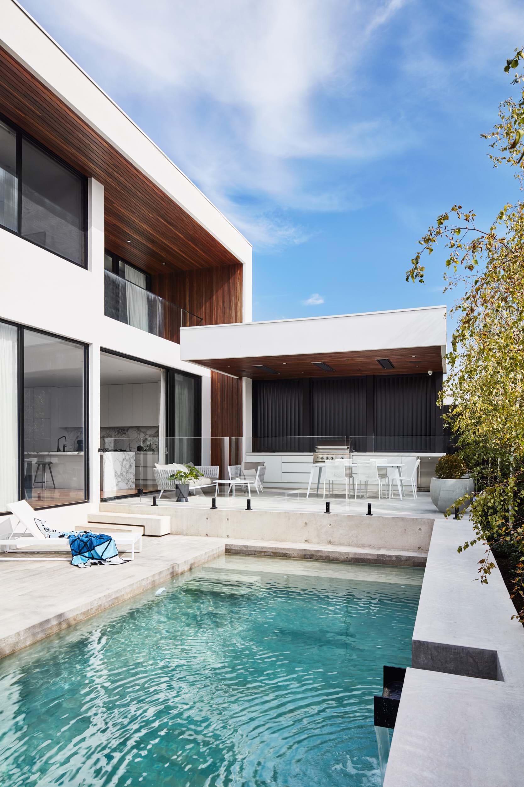 In the front, a stylised forest was created to help soften the façade and give semi-permeable privacy for the residence when inside. The sideway was about greening the boundaries and layering the tight garden beds with all year-round greenery and lushness. In the rear, the main focus was the swimming pool and its surround. The Andorra limestone is a key feature running through the pool and items like the outdoor kitchen and pool water feature - all oversized to replicate the details of the home.