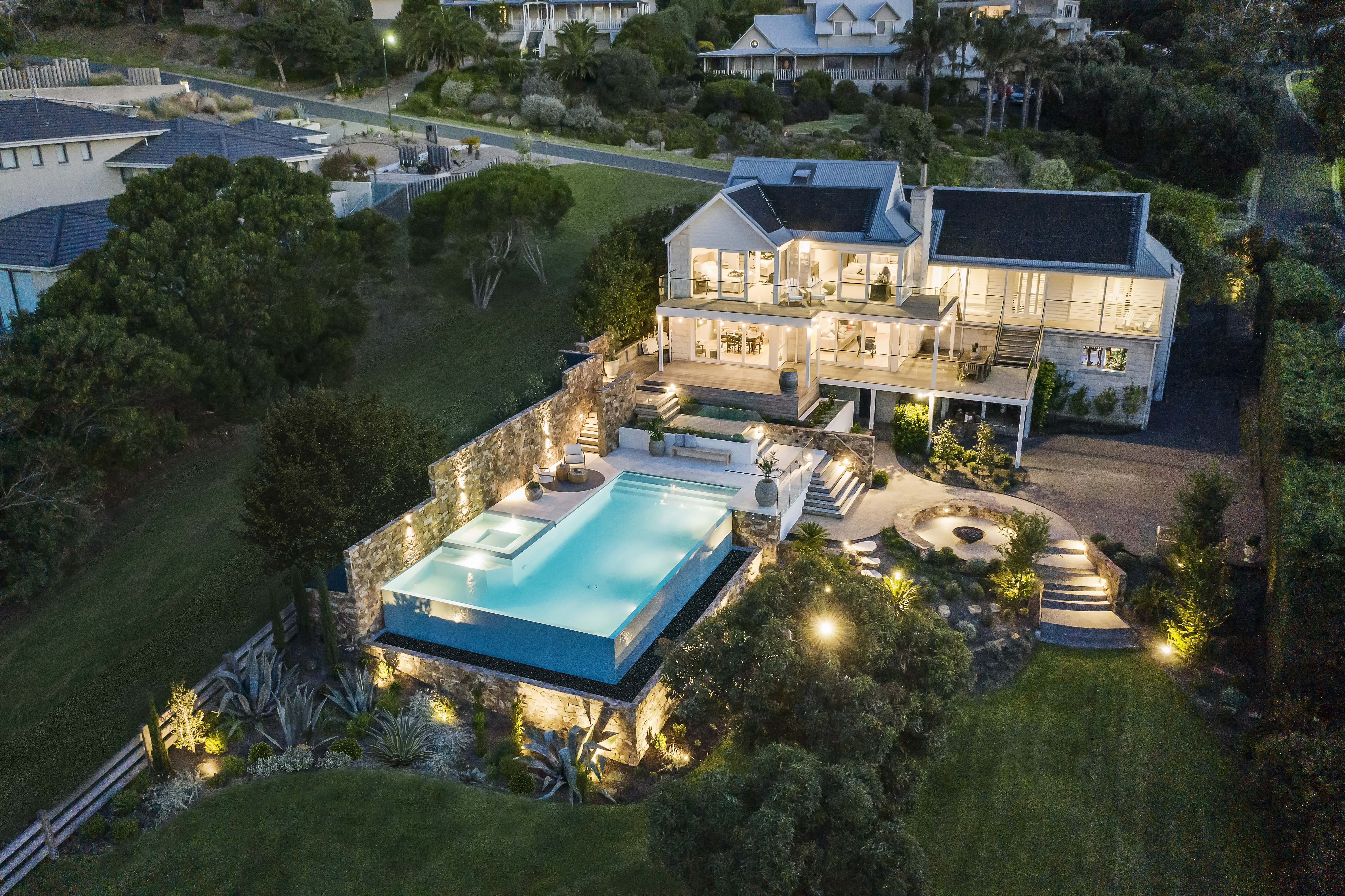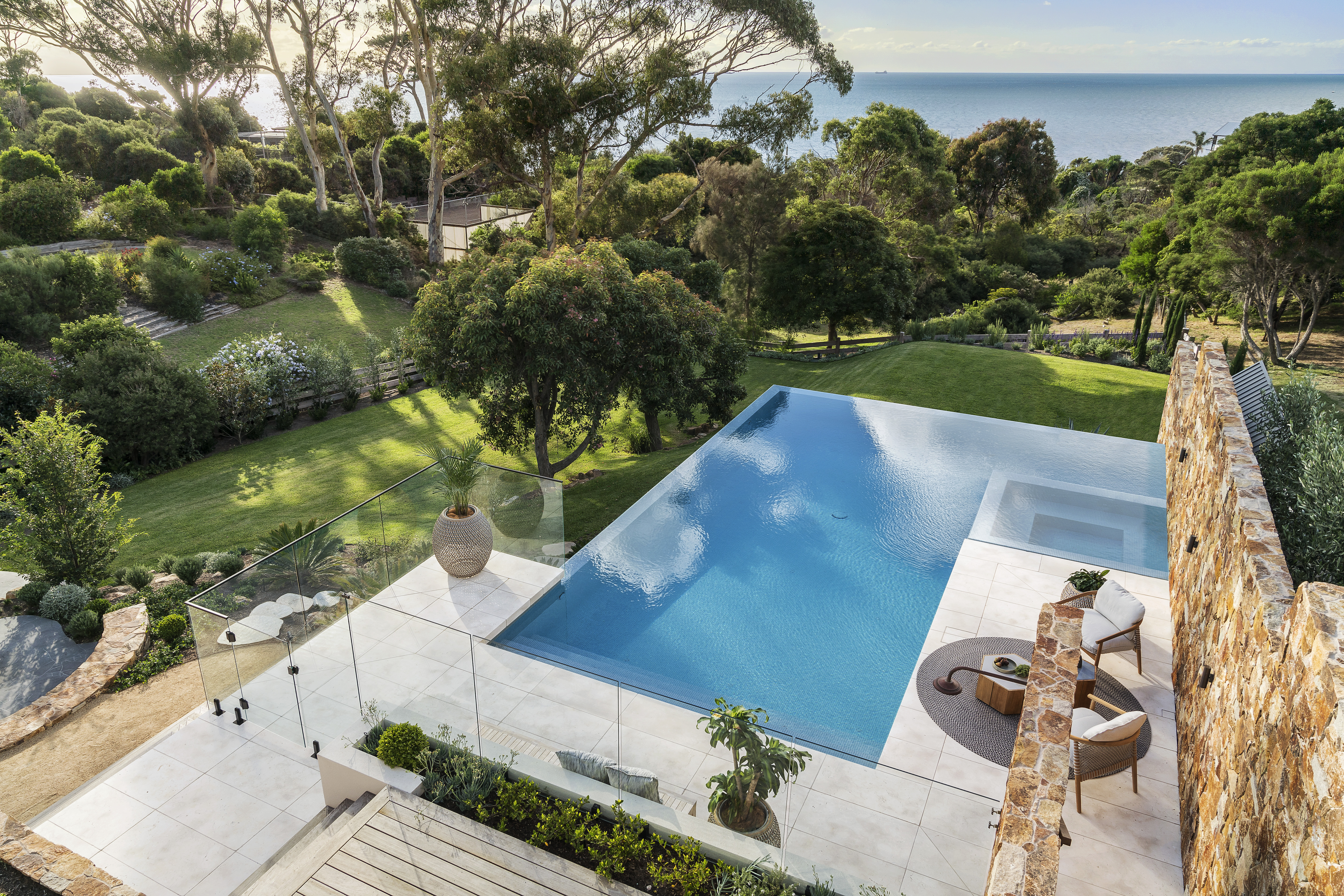 The client required a landscape and pool design for their sloping block of land. The first challenge was the 8.5 metre fall from the top to the bottom. The other challenge was to design a landscape to fit with the architecture of the house and surrounding coastal environment.