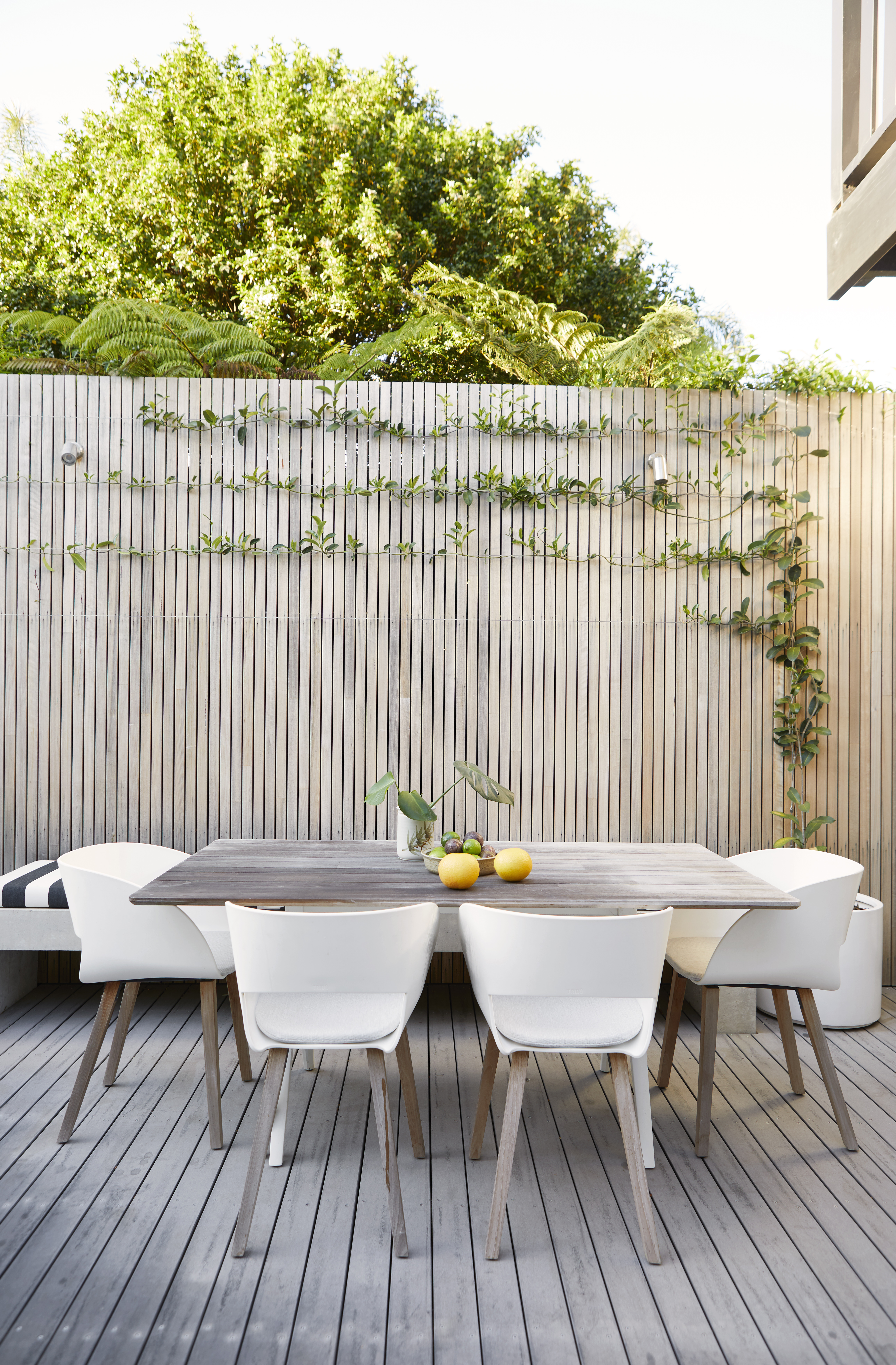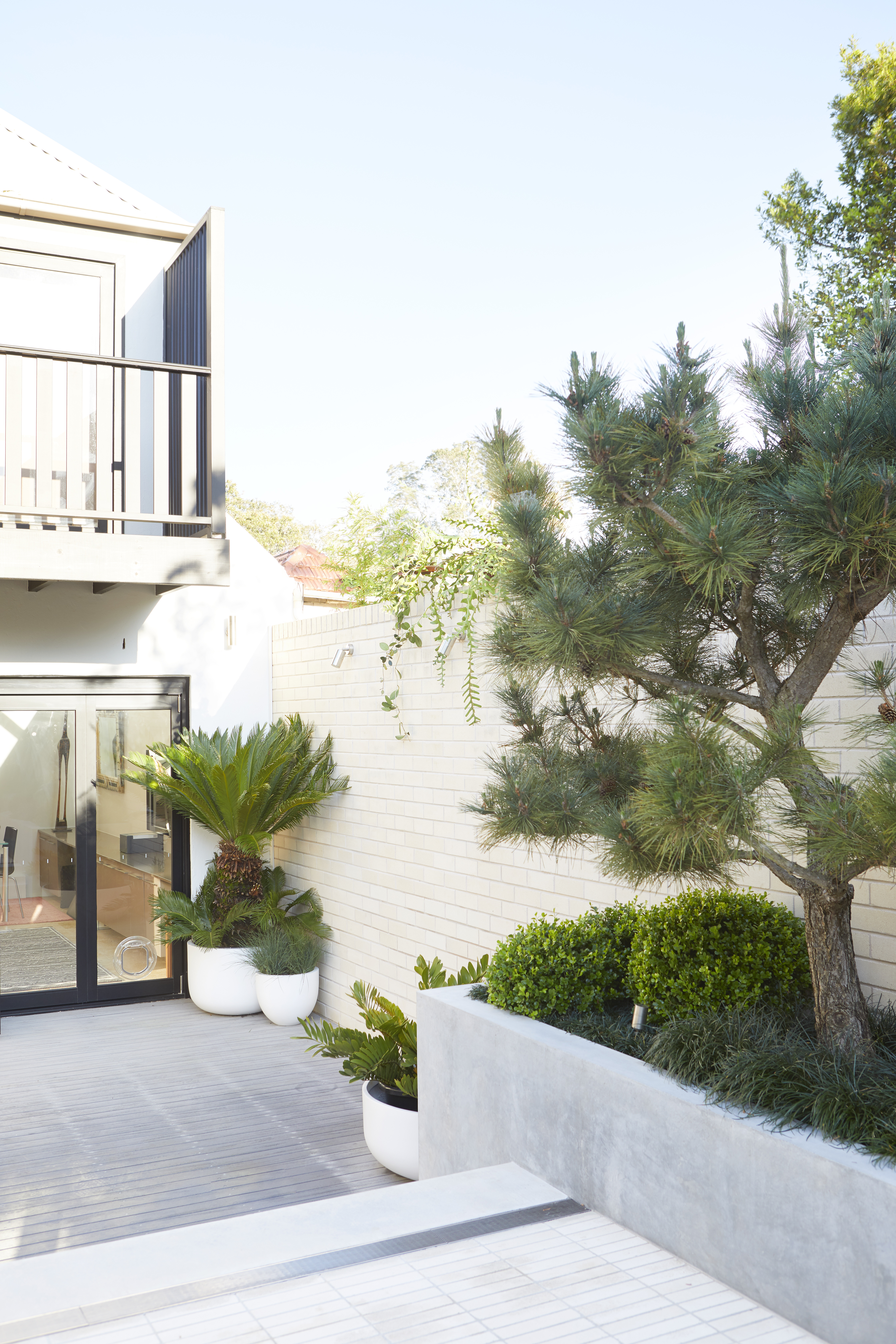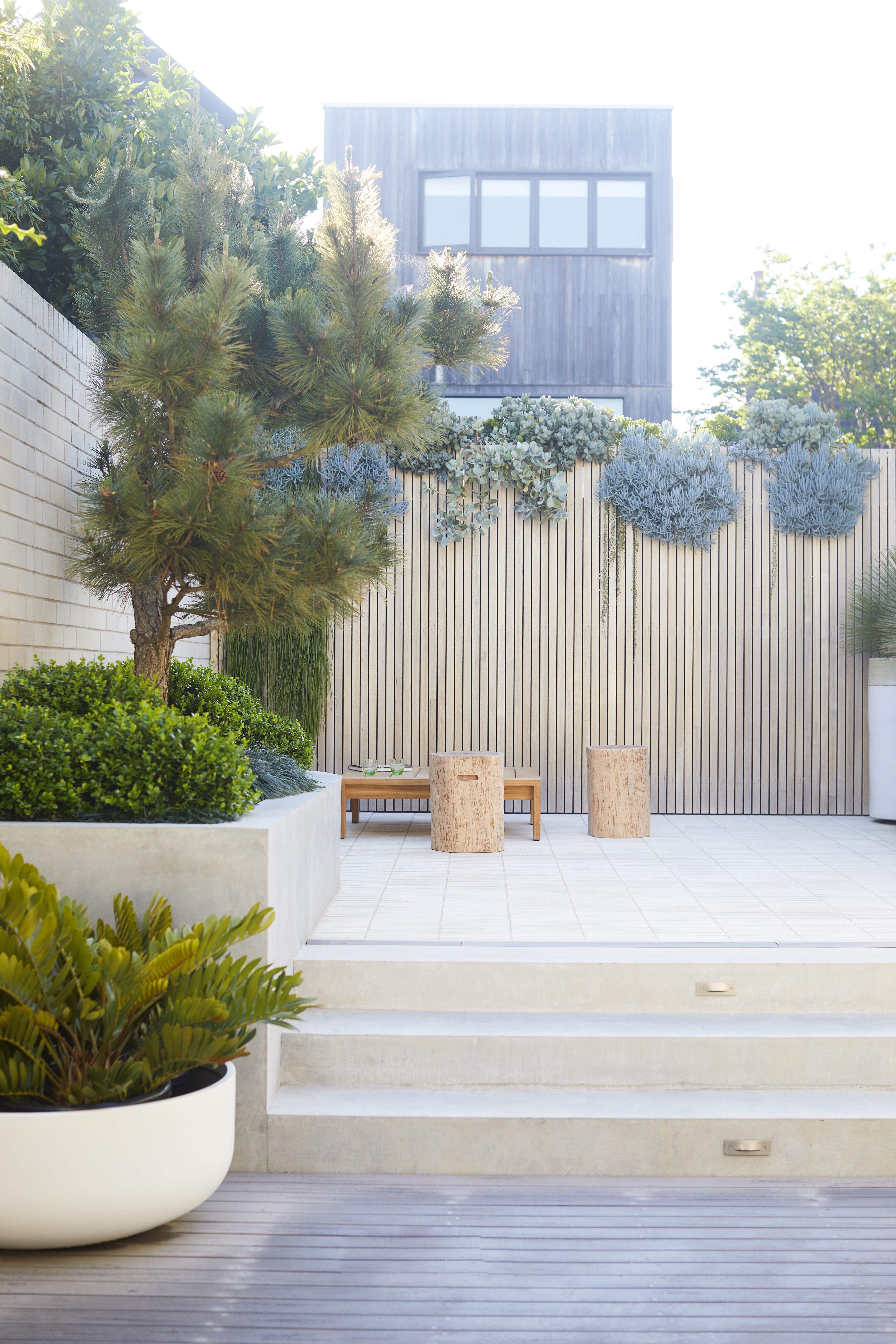 This is a deceptively simple and seemingly effortless but carefully and beautifully curated courtyard garden. The use of subtle silvers, greys and creams in the hardscape finishes bring in borrowed landscape elements such as the greying timber of a neighbouring home, making the courtyard feel larger and more expansive. Beautiful construction details, such as the insitu concrete bench seamlessly curving around to become a perpendicular landing step make this a high-end project befitting its location.