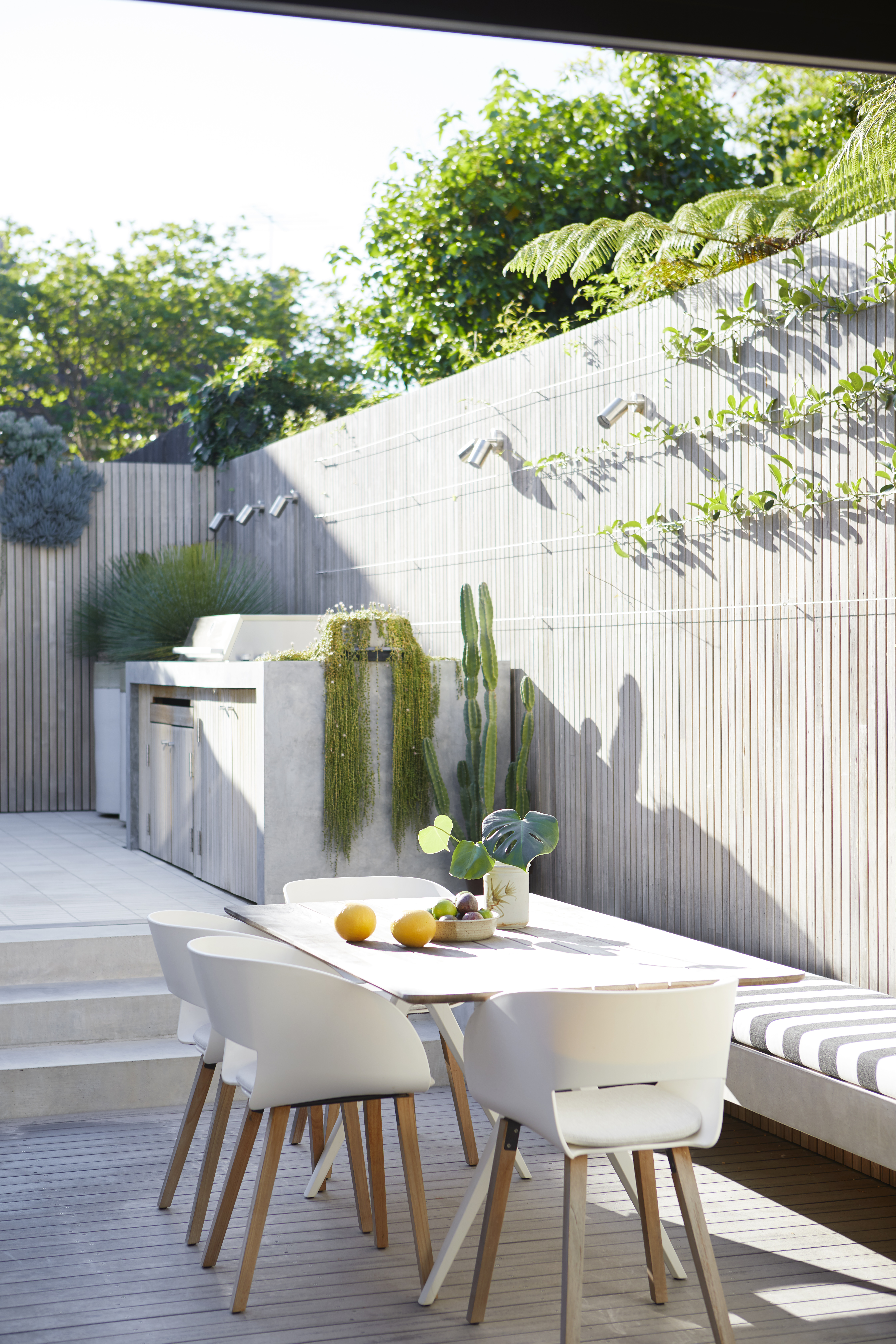 The clients design brief was for an uncluttered backyard with a sense of space that flowed, a self-sufficient and easy to care for space. Materials and plantings were to be both durable and low maintenance. The design explored elements such as level changes, seating, an outdoor kitchen, lighting, shade structures, furniture, pots, and plantings.
