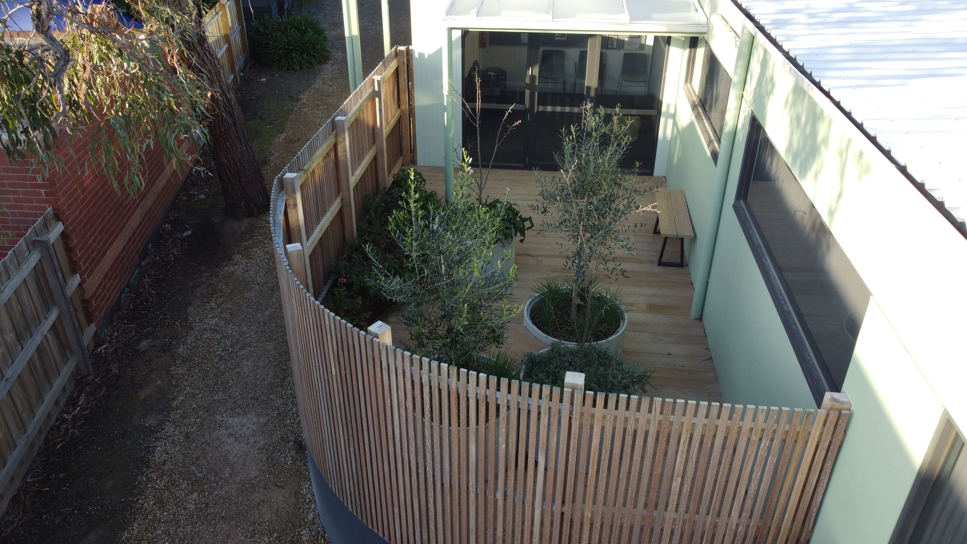There was to be no fixed playground equipment in the private courtyards due to the relocatable nature of this project. Open space was requested to allow children the opportunity to take their toys out to play in a safe and private outdoor space while in full view of their parent/carer in the adjacent counselling rooms. There was to be an emphasis on the power of plants using garden beds and planters filled with seasonally changing plants to soften these spaces providing a welcoming, homely feel.
