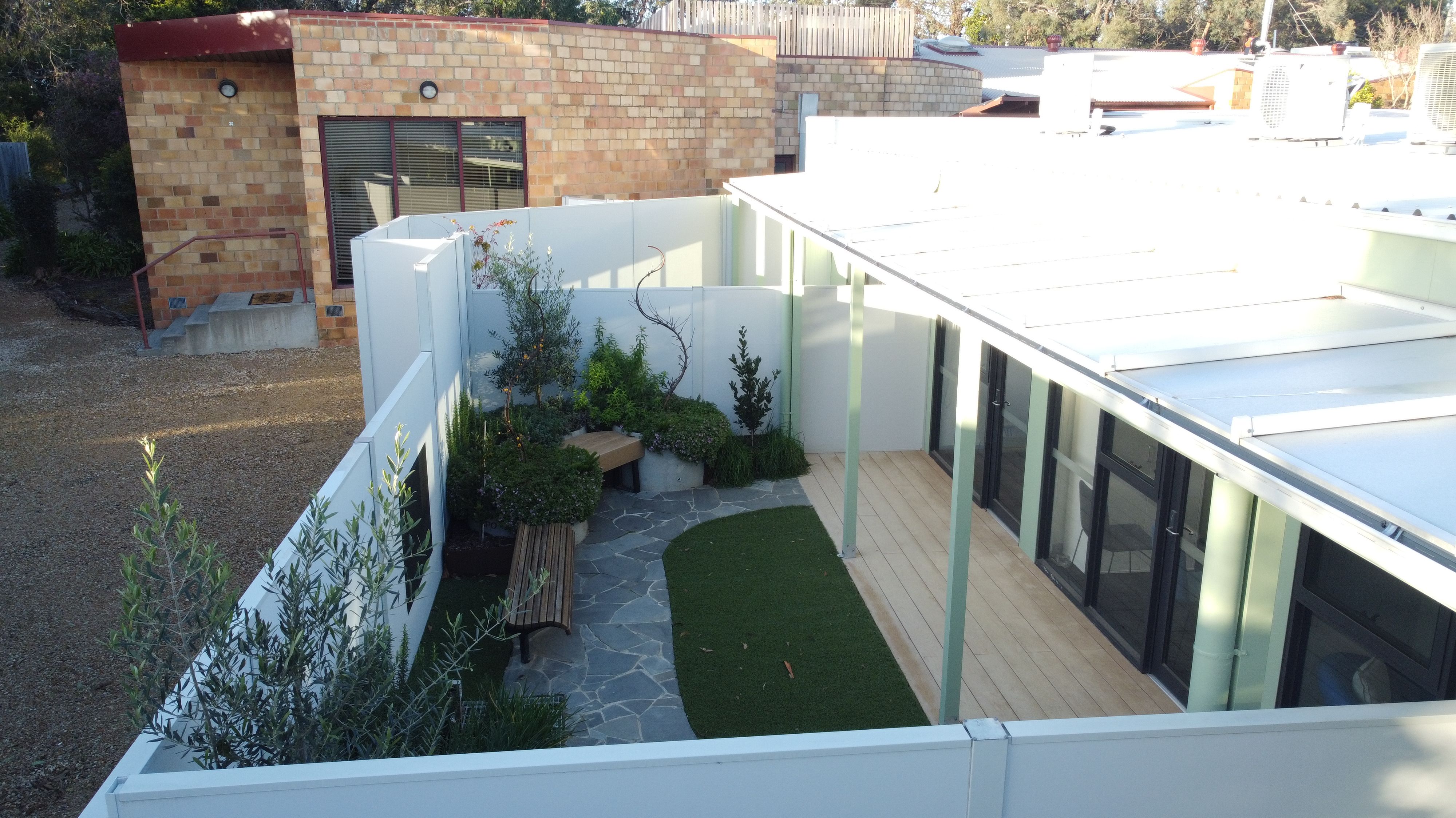 An existing building on this site was to be demolished to allow space for a new modular building and an existing building refurbished to allow for increased community health services to commence. Due to the modularity of the new building the landscape design was to create a series of courtyards which could be relocated with the building in the future. The landscape brief required a series of outdoor waiting room spaces and private courtyards reminiscent of a residential backyard to be utilized by family groups.