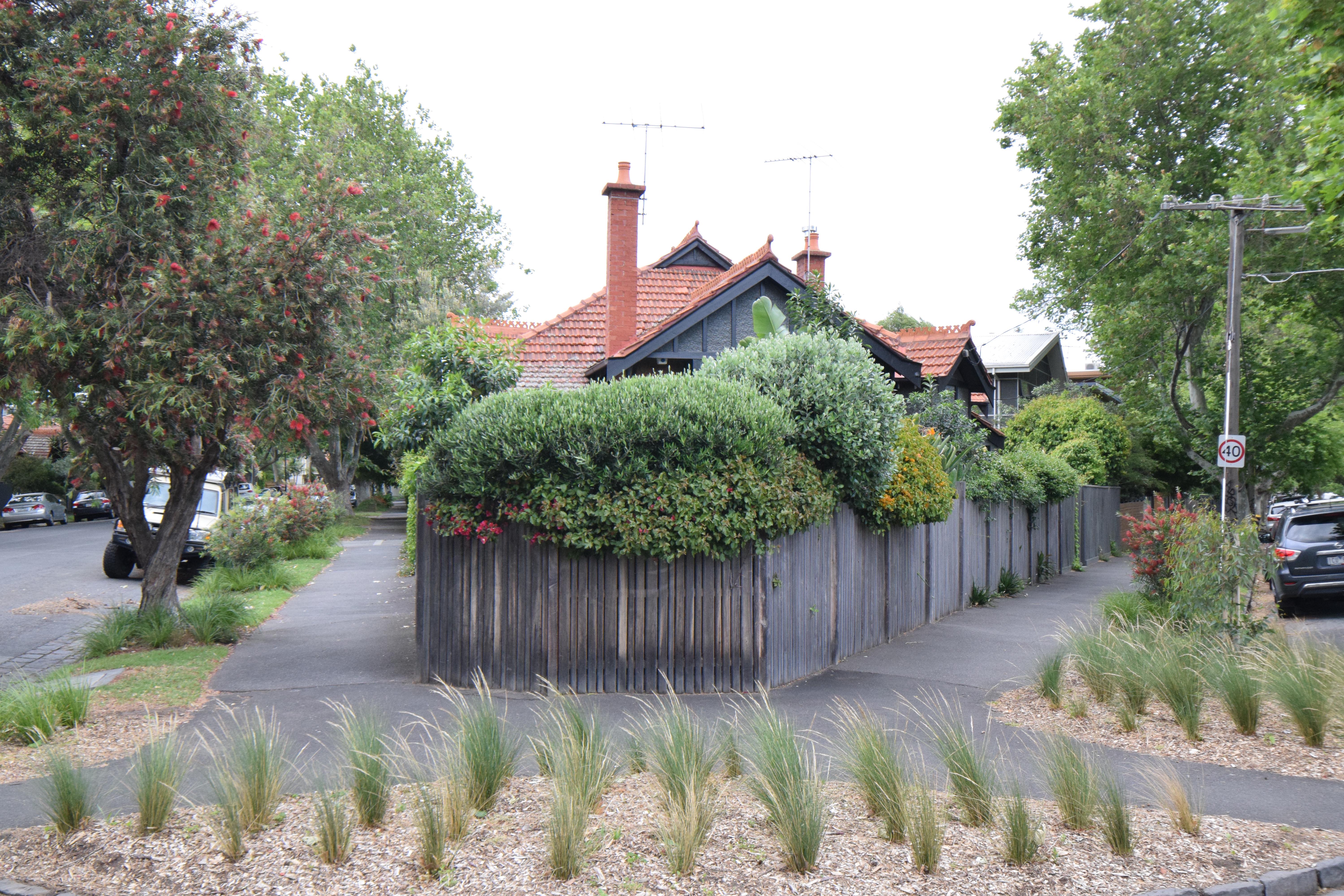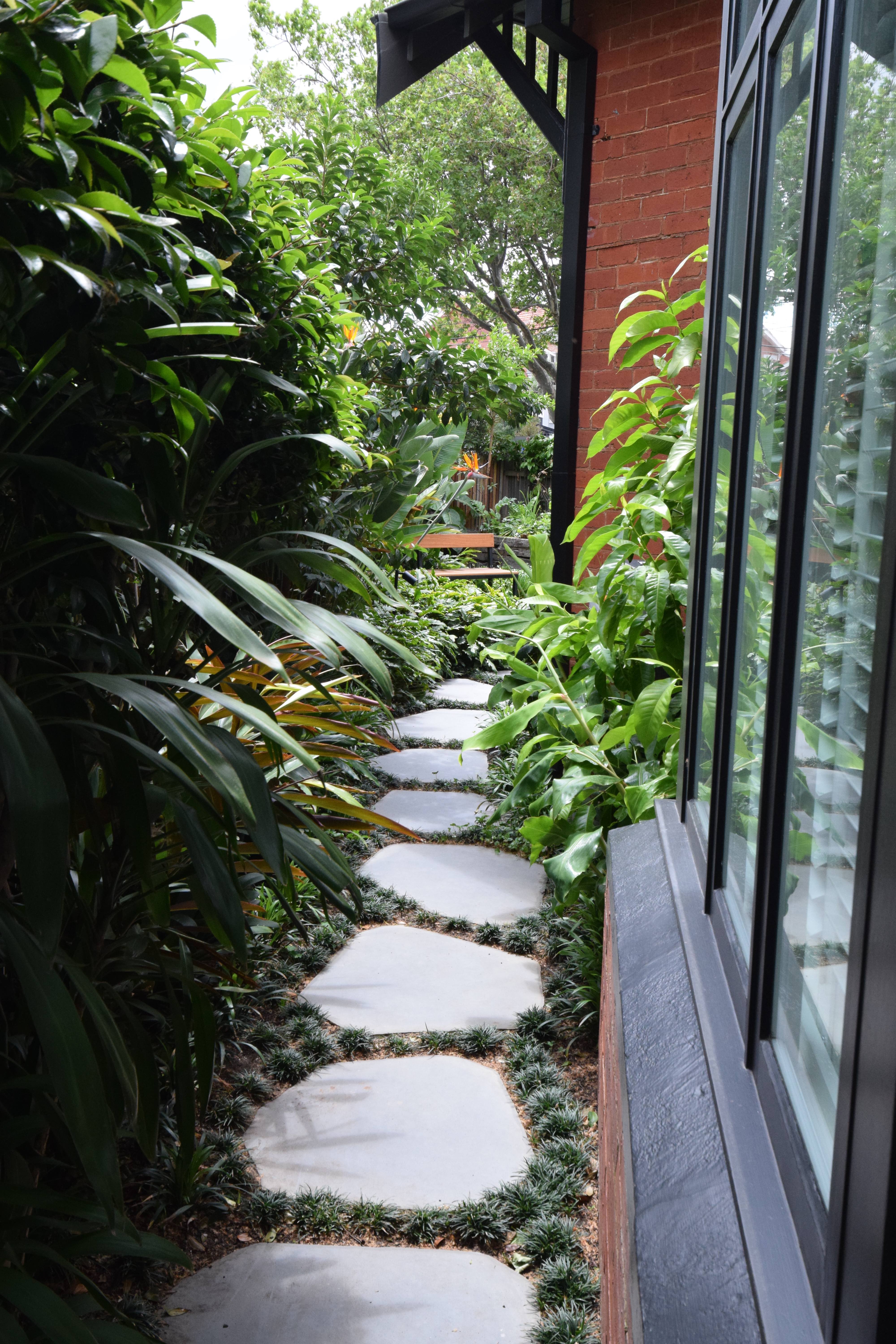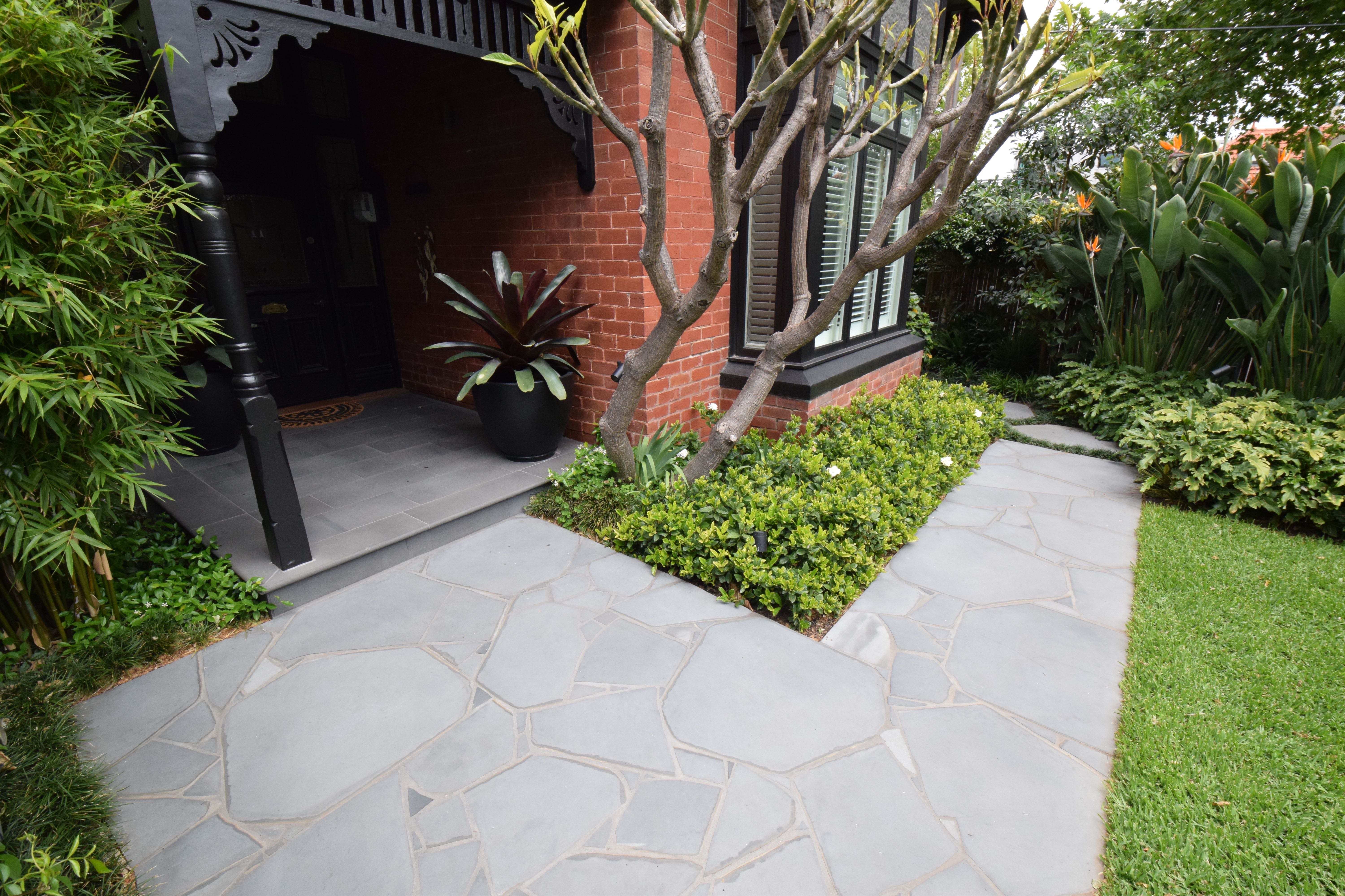 The layout of this garden draws heavily on the architectural lines of the house, projecting them into the garden. The illusion of space is created while dissolving any awareness of the tapering boundaries. An entrance court in Victorian bluestone serves to showcase the attractive façade, Frangipani tree, and garden beyond and invites engagement in all directions.