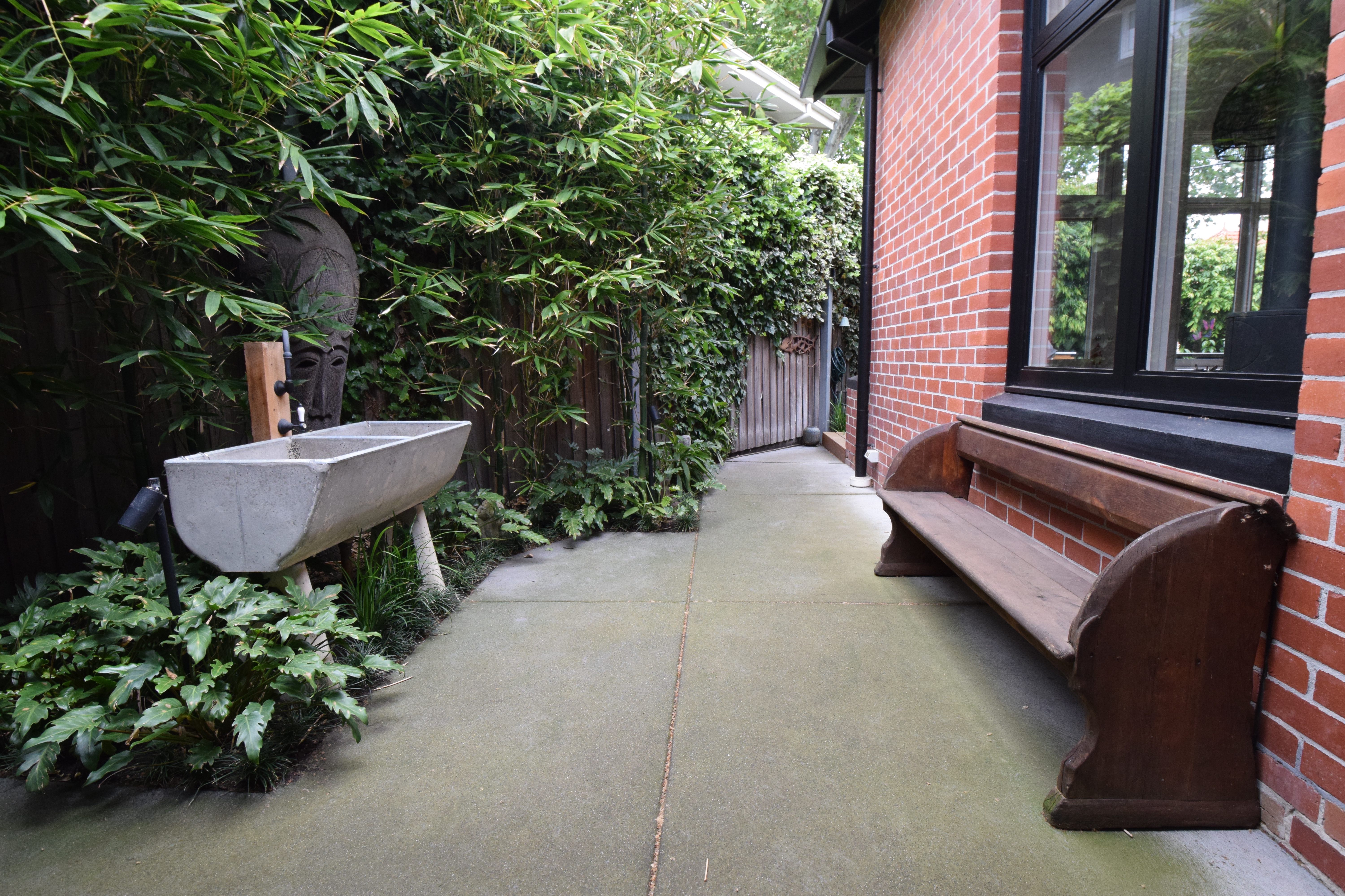 Architectural lines are drawn from the house to make a seamless connection, facilitating connection, flow, depth and space. A salvaged concrete laundry tub serves as a practical piece and sculptural outlook from the living space.