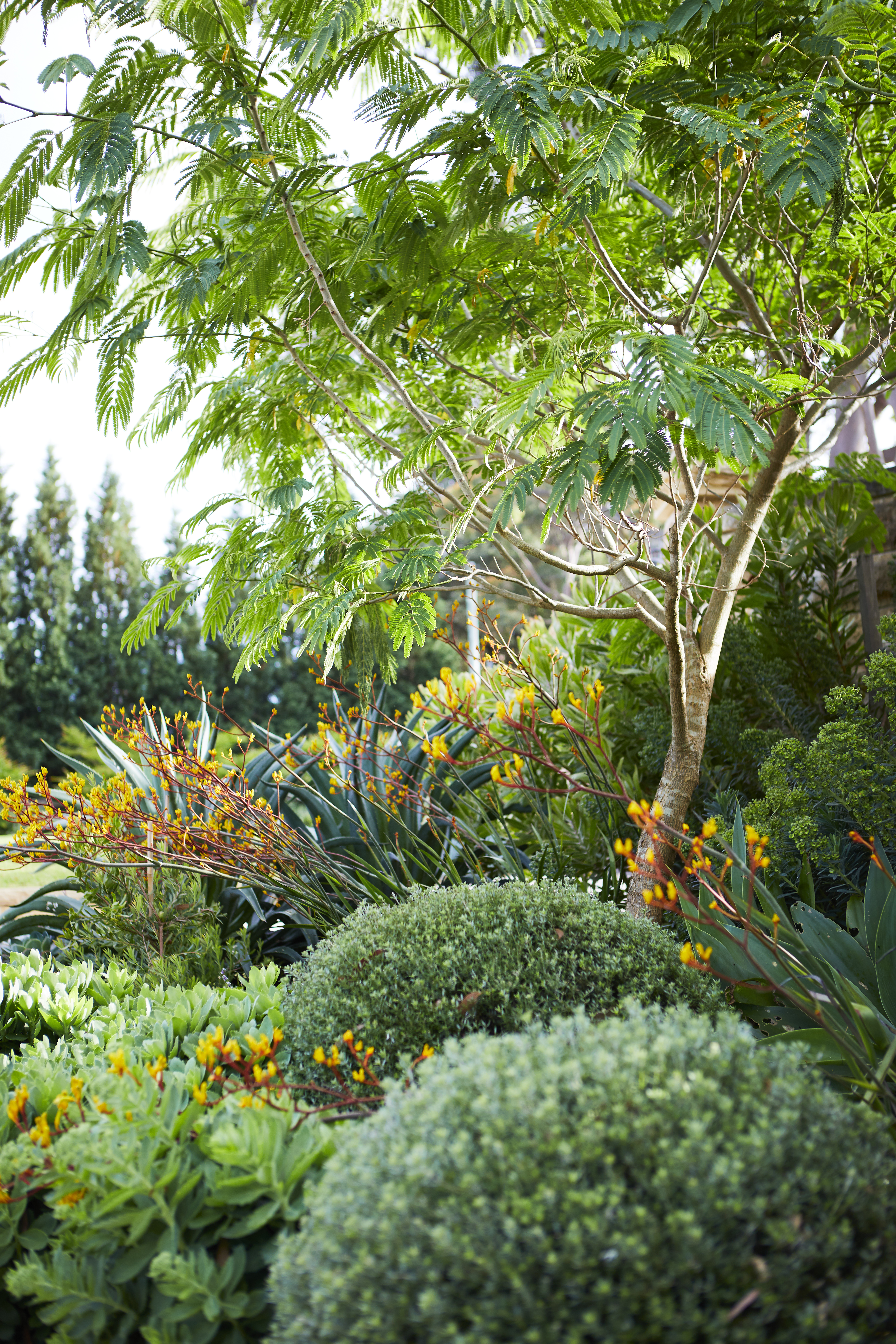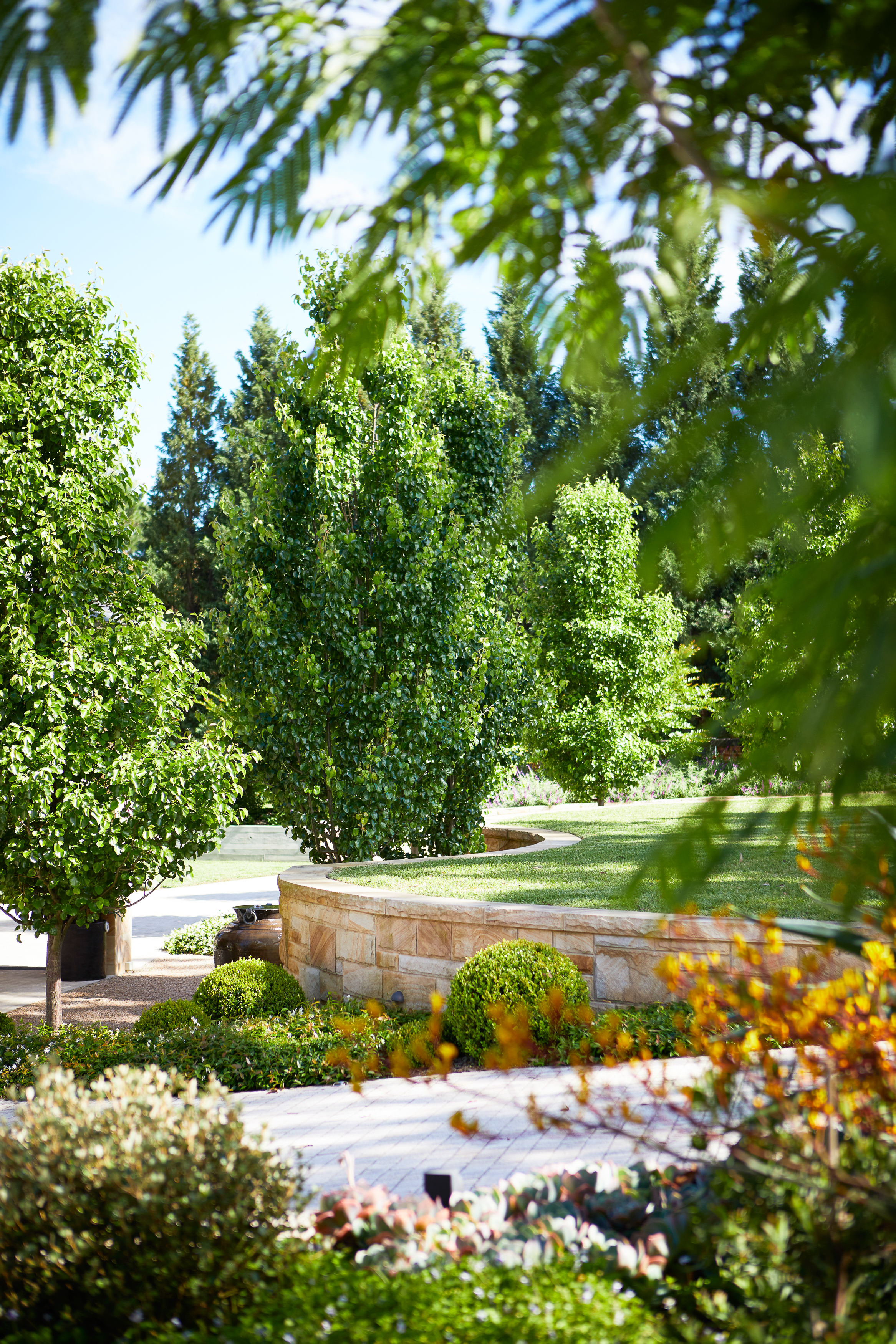 The client requested a garden that was an amalgamation of styles - Australian, Italian, and Mediterranean, to reflect their mother’s heritage with no clear label to define it. The garden was to screen the home and provide views from inside the house. Classic topiary elements were mixed with flowering natives, deciduous weeping trees were paired with sculptural succulents and Australian sandstone paired with Italian travertine.