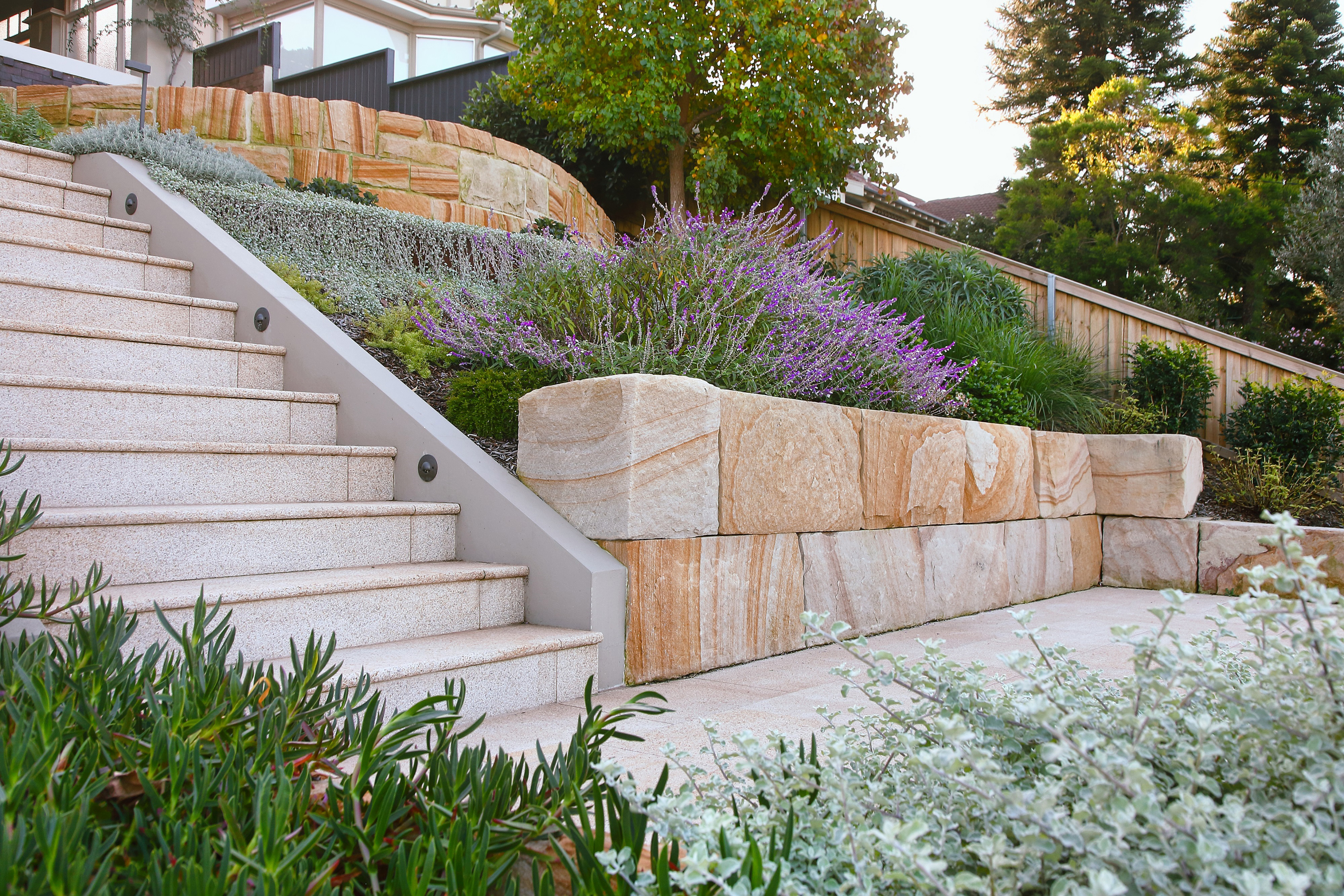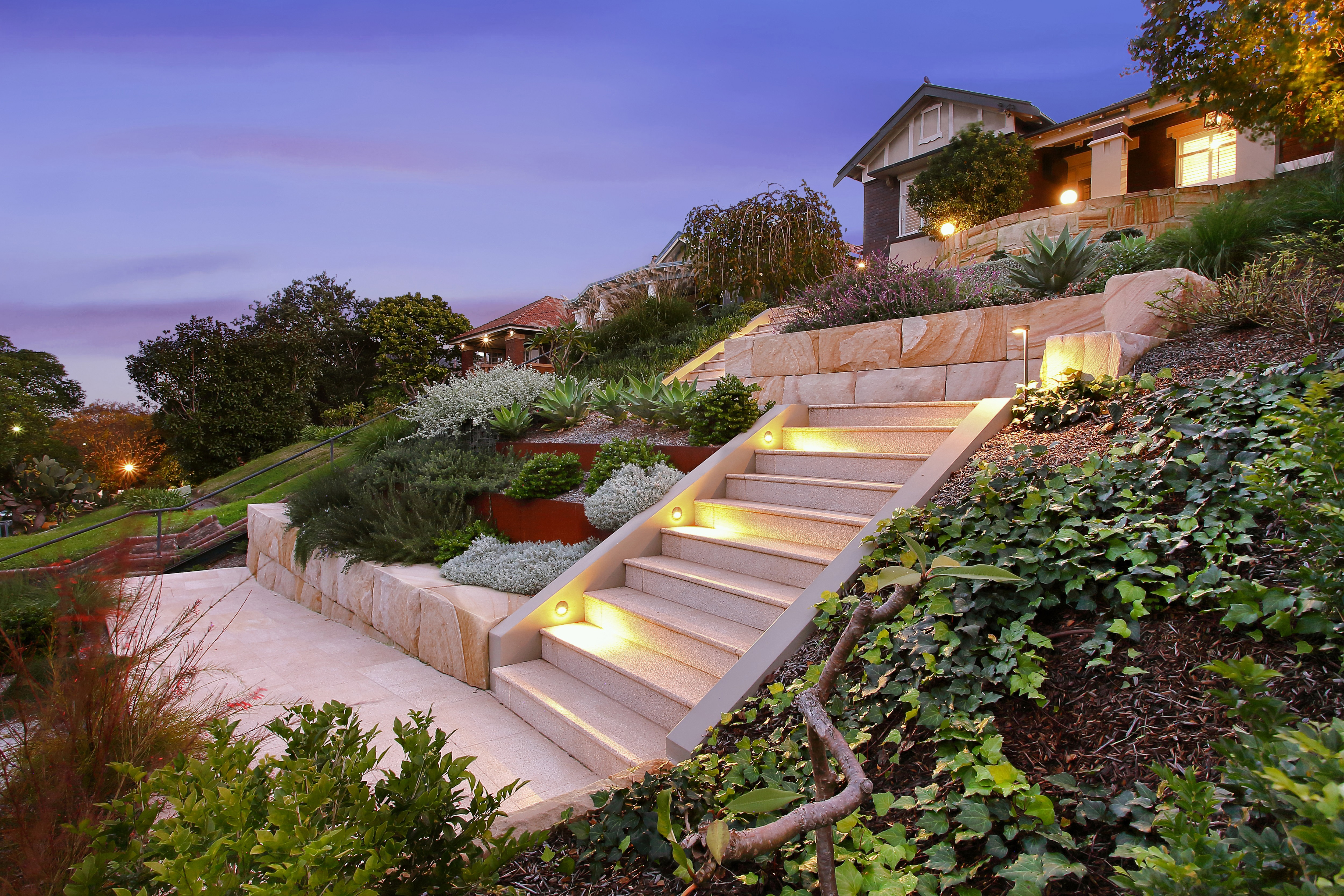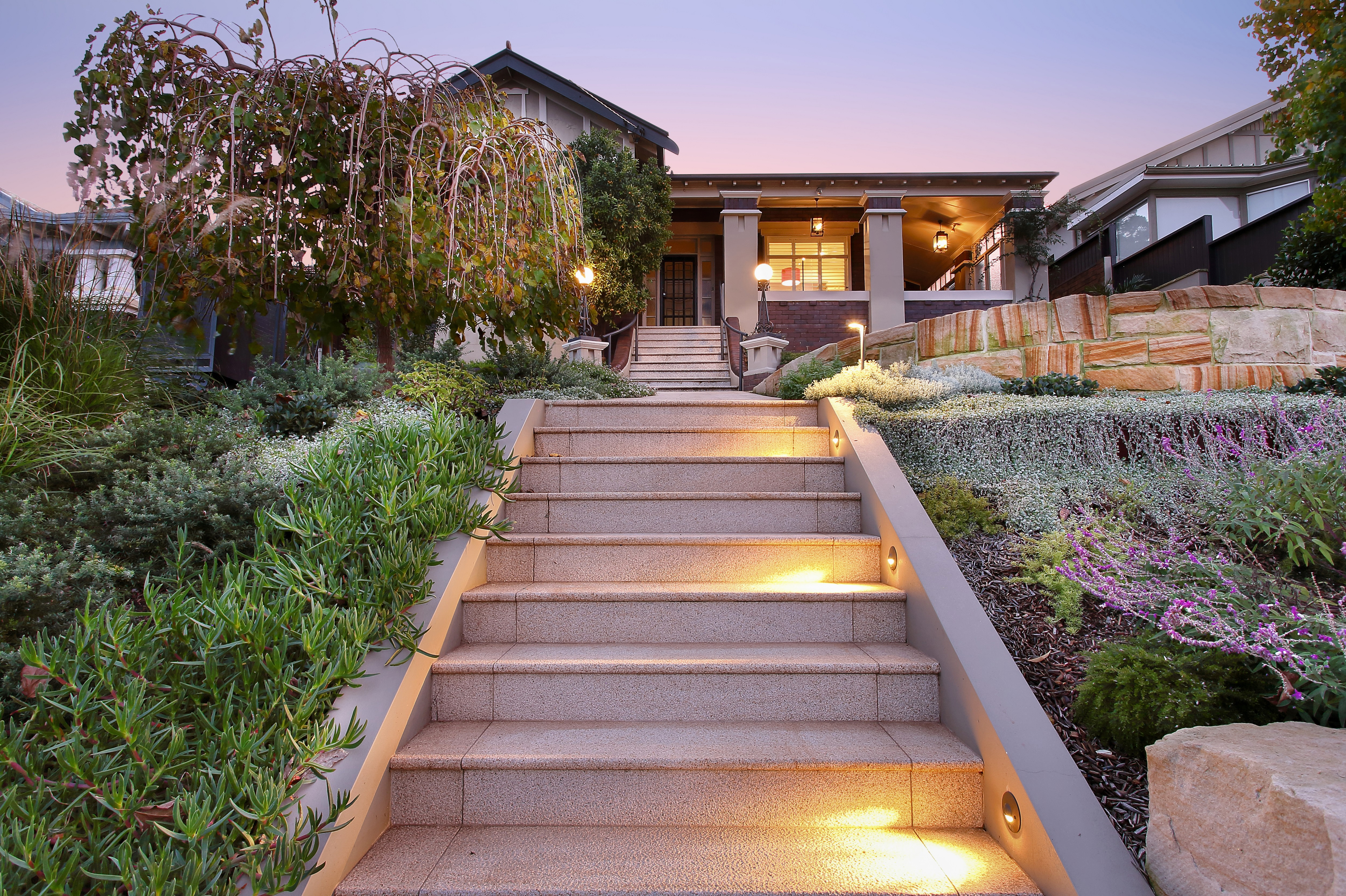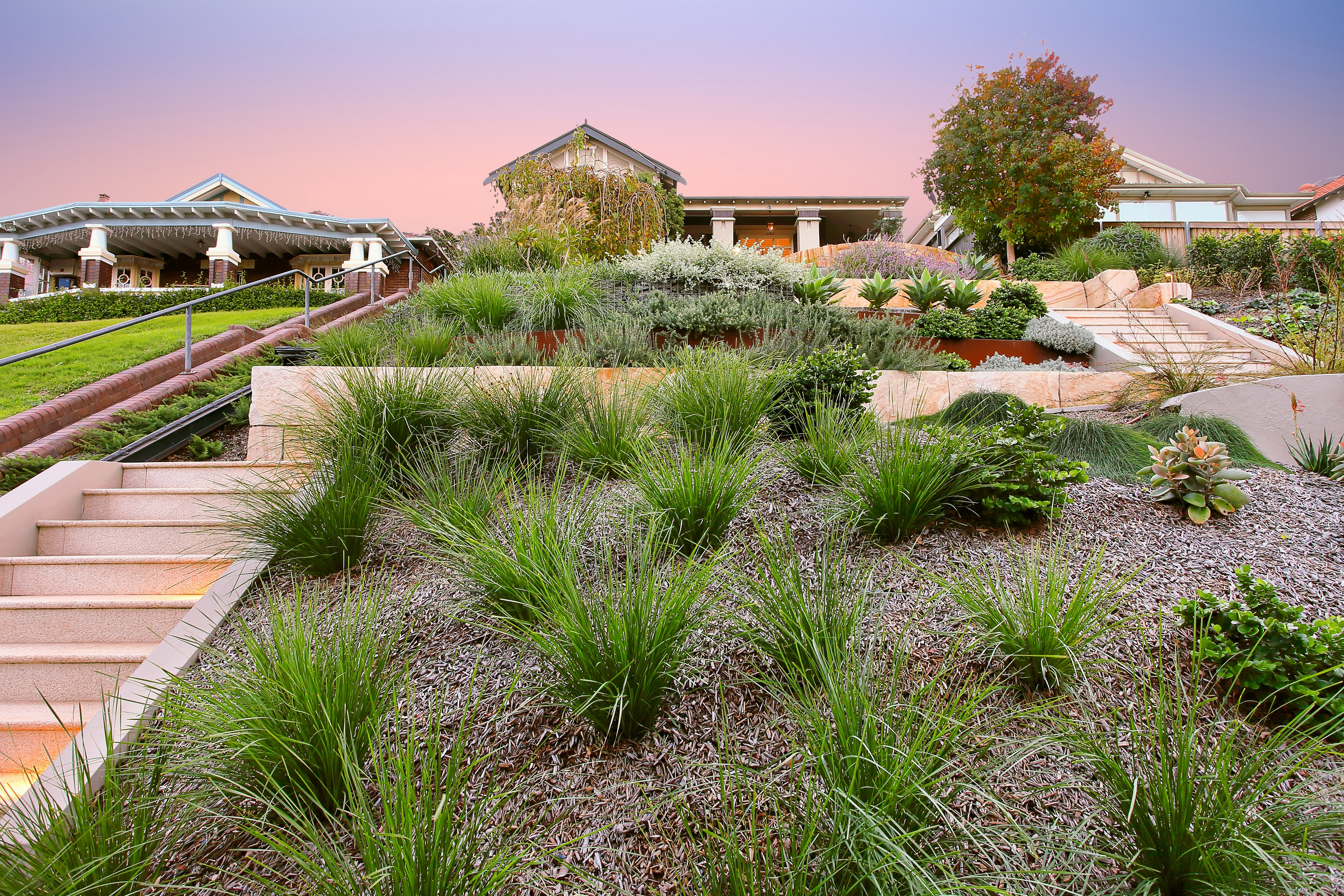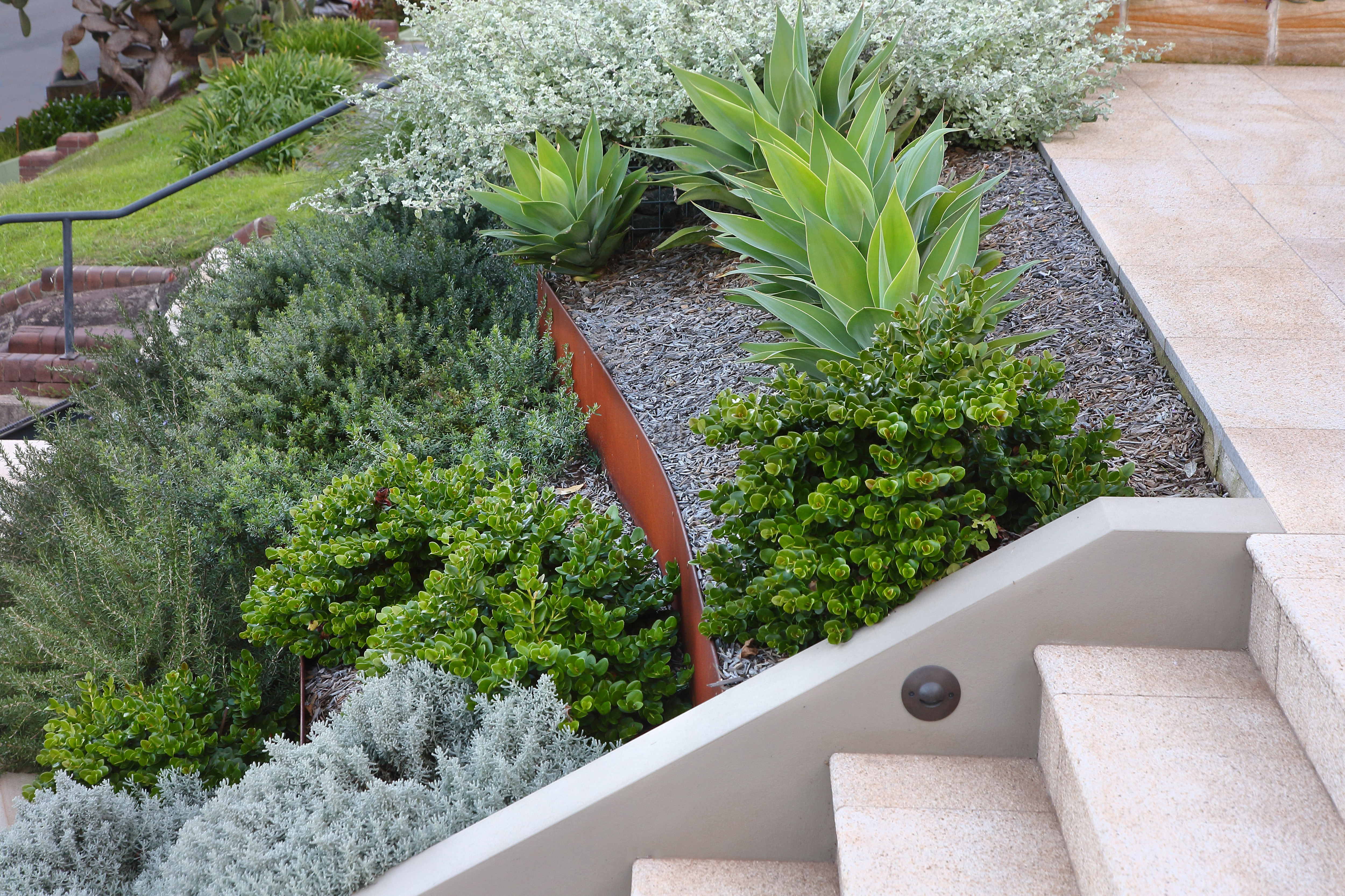 This was a challenging site, with a very steep slope and exposed position to enter the house. Harmonious yet interesting textures and tones in both the plant and hardscape palettes have created a landscape that meets the brief and gives the property a strong street appeal.