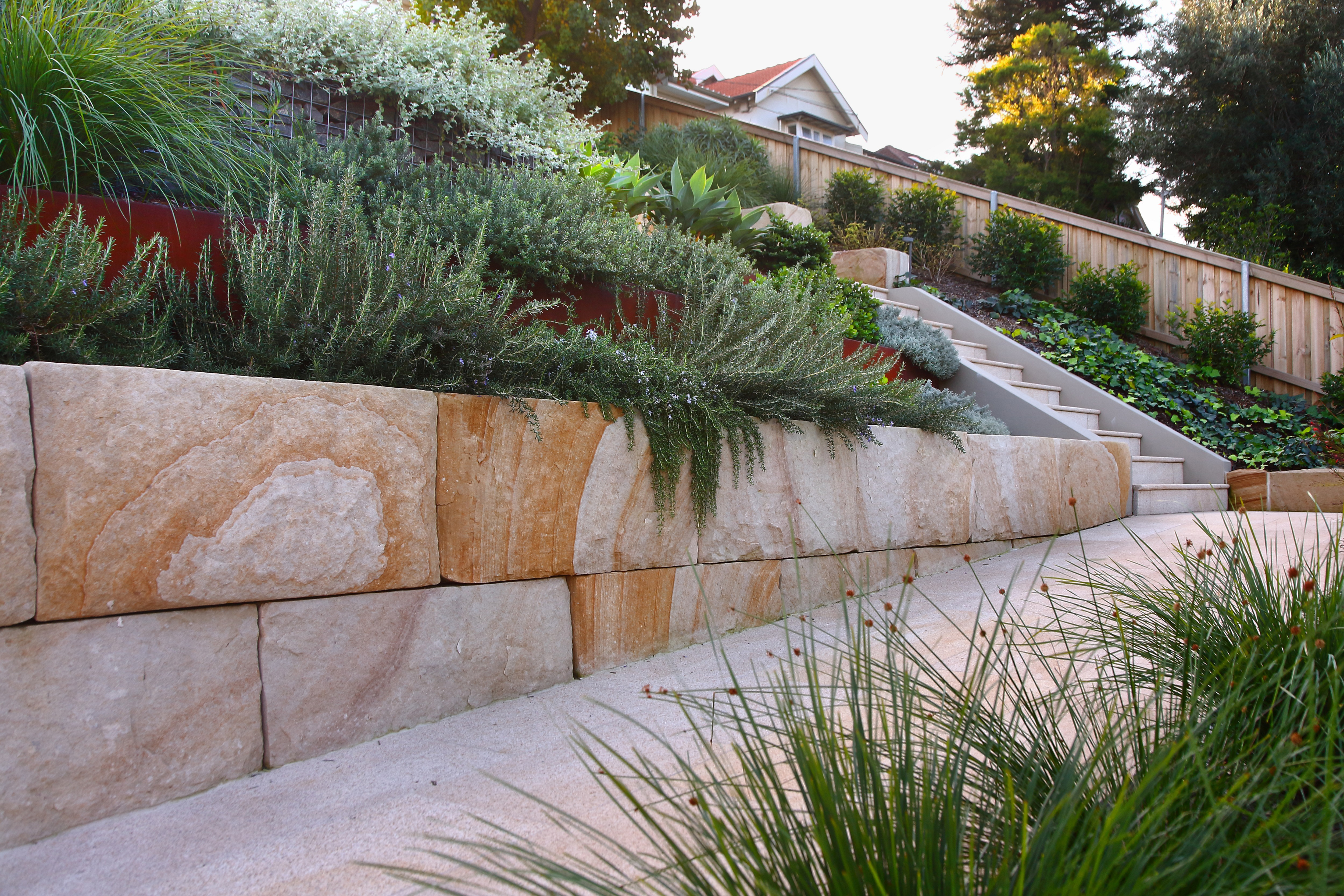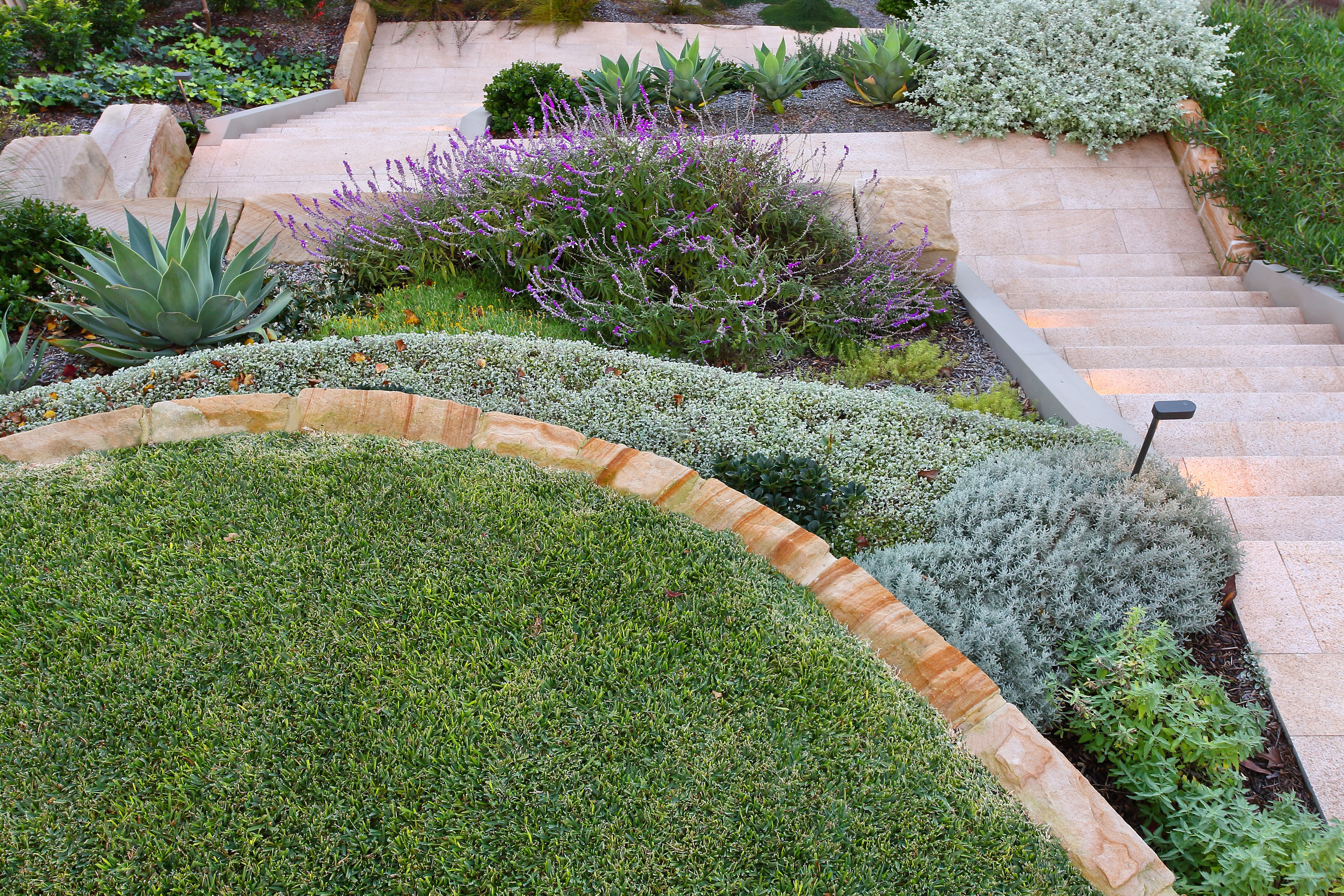The client wanted to avoid creating a series of formal terraces with rigid retaining walls. They hoped to have some organic shapes with a variety of interesting materials, mixed with formal retaining if required. While it looked like a yard with no options for play, one of the favourite activities for the children was jumping off the front verandah and rolling onto the lawn so retaining this small area of lawn was a priority. The design intent was to create a relaxed, informal garden full of textural contrast and plant variety.