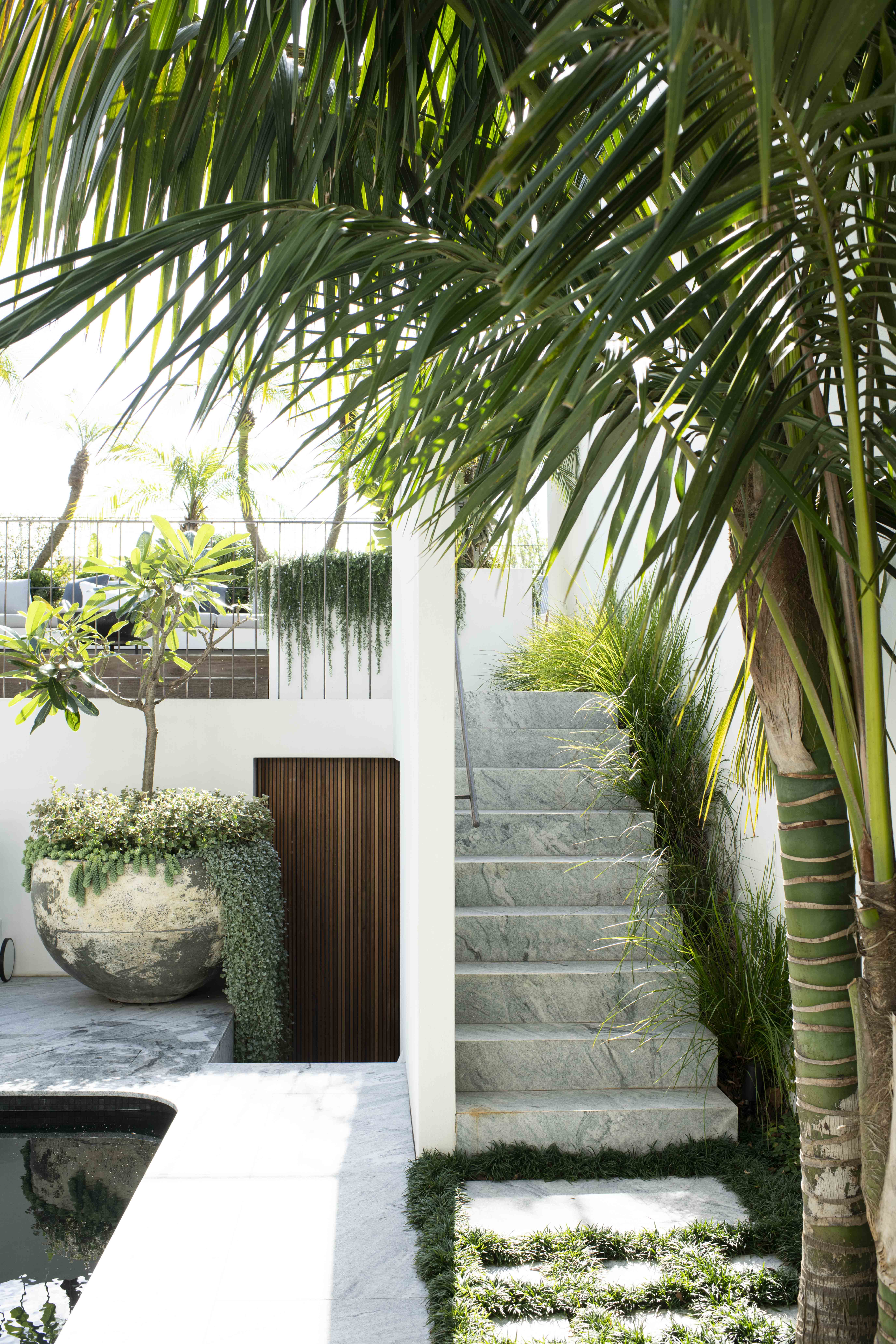 The brief was to ground the large home and walls into the property. The feeling of being submerged in a retreat was desired with a sense of canopy and abundant green. The hardscape was to be blurred and counter-balanced with planting.
