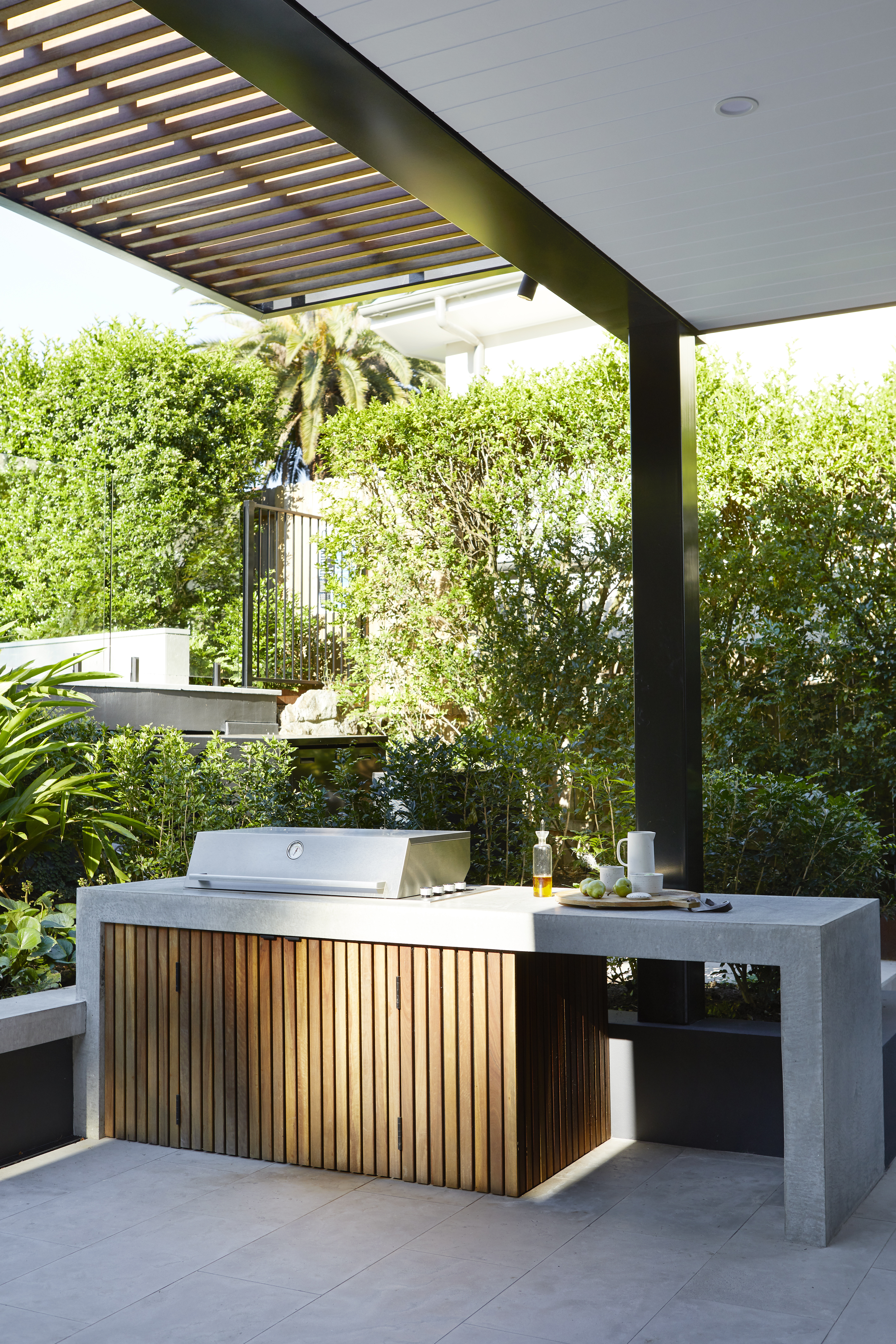 entertaining while still allowing natural light into this space and the adjacent living areas was key. Incorporation of informal seating, heating, lighting and a dedicated cooking station were also required.