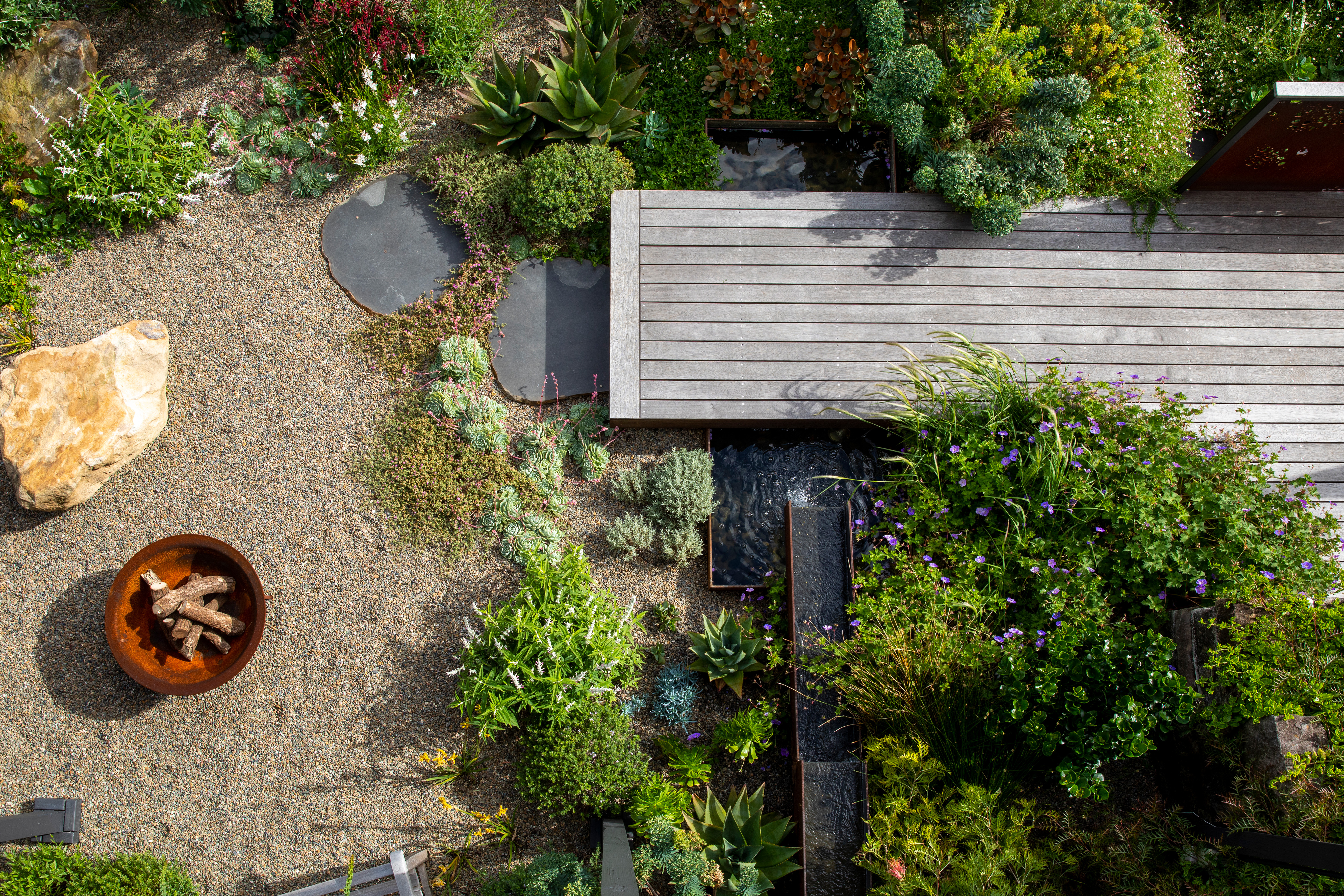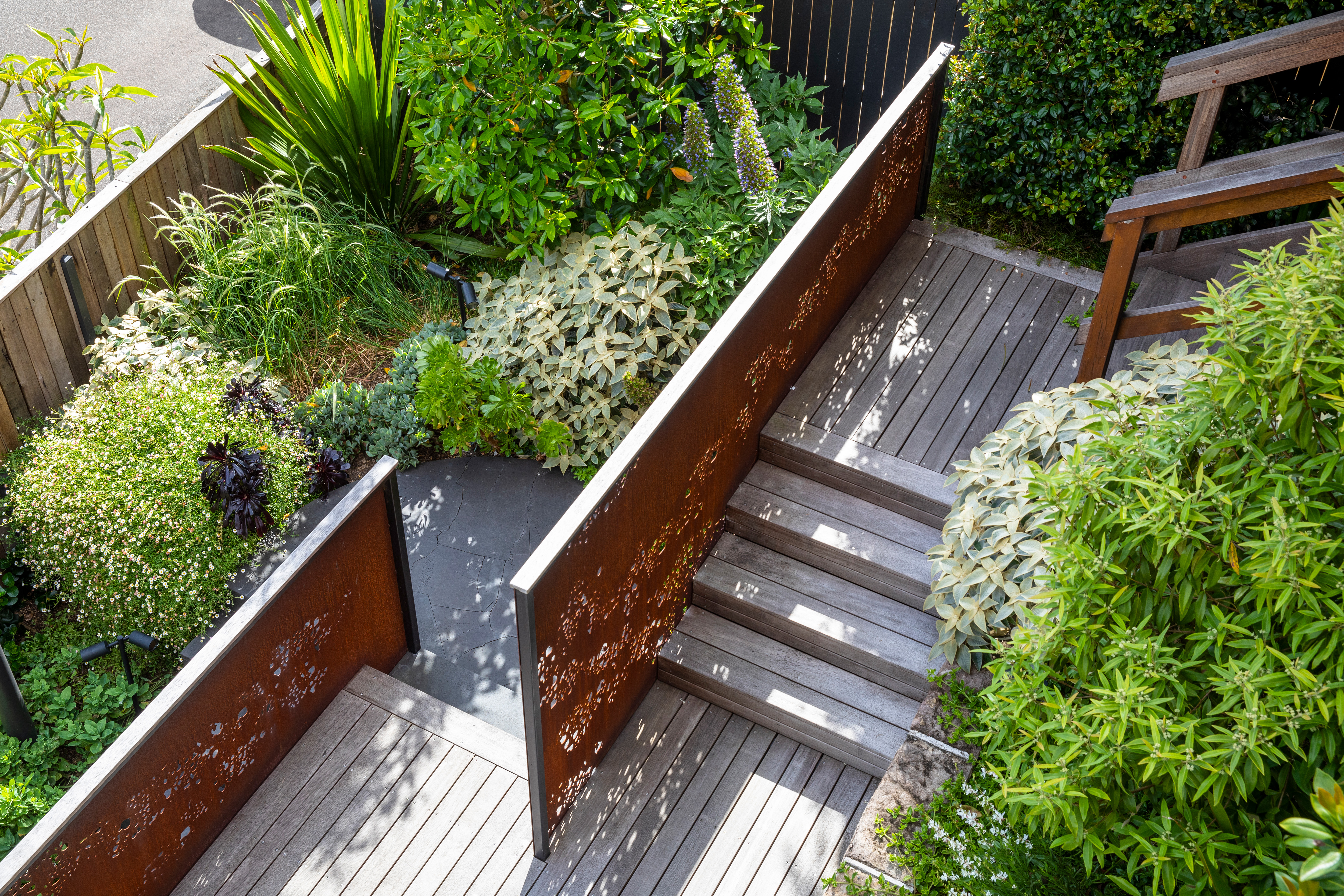 The stair ways were to be easy and comfortable to navigate. The garden was to be a beautiful and interesting ‘artwork’ to look down into from the main deck of house above, incorporating existing sandstone and include a water feature. The clients requested that there be no lawn.