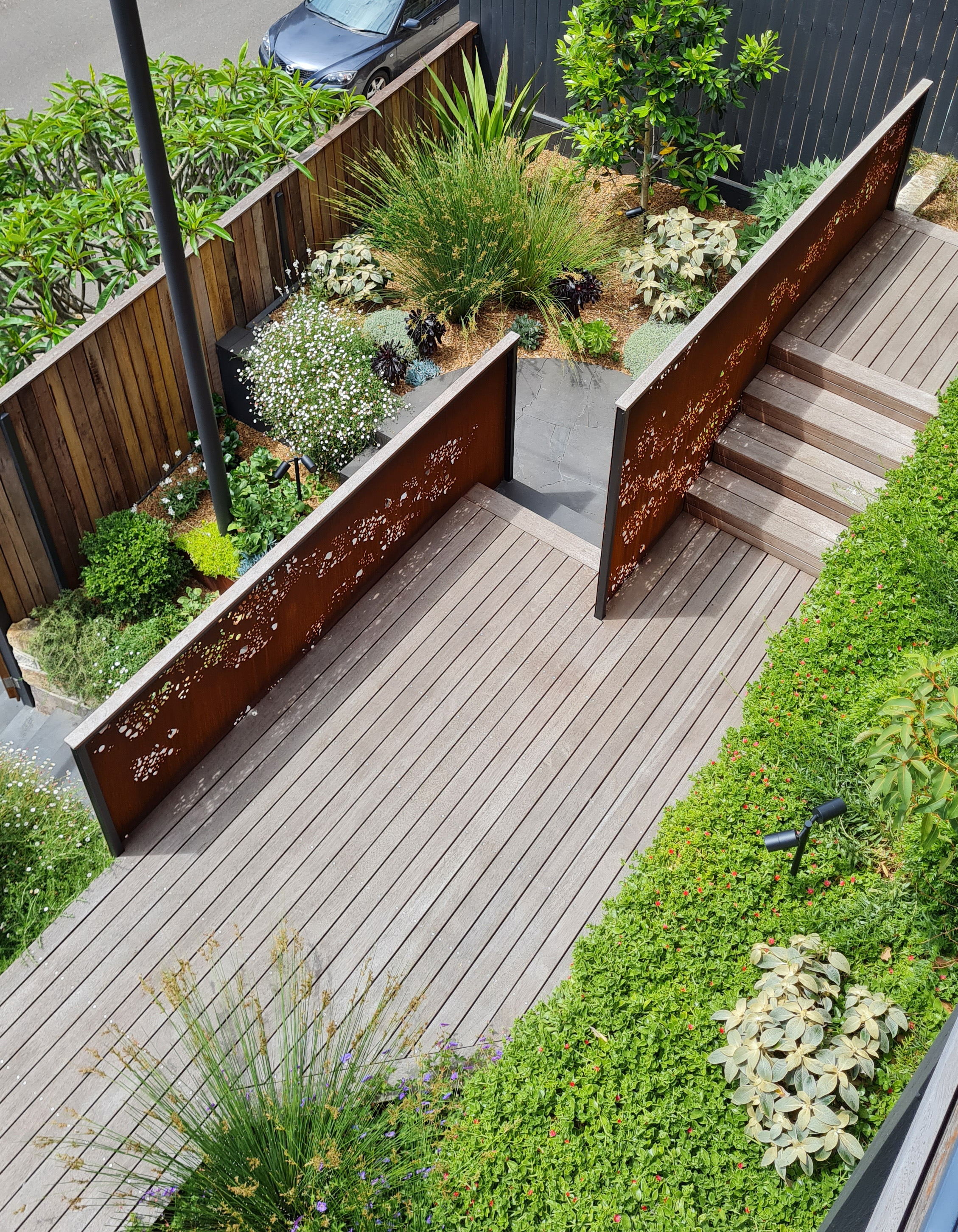 The brief was to create a lovely garden to enjoy and ease the journey from the house to the street with much to enjoy on the way. The garden was to become an active living space with stairs and a strong, interesting entrance.