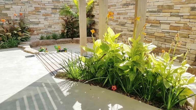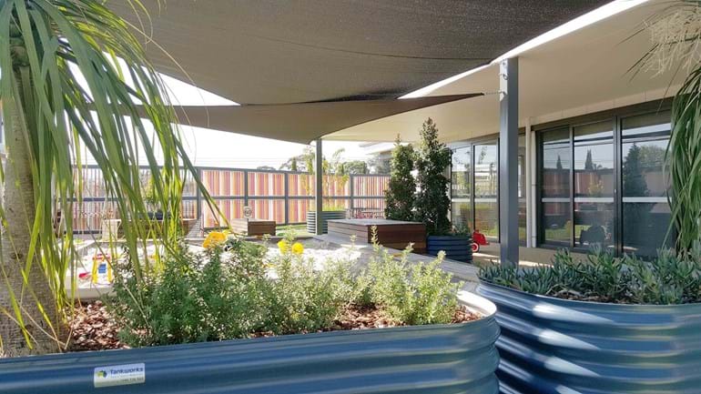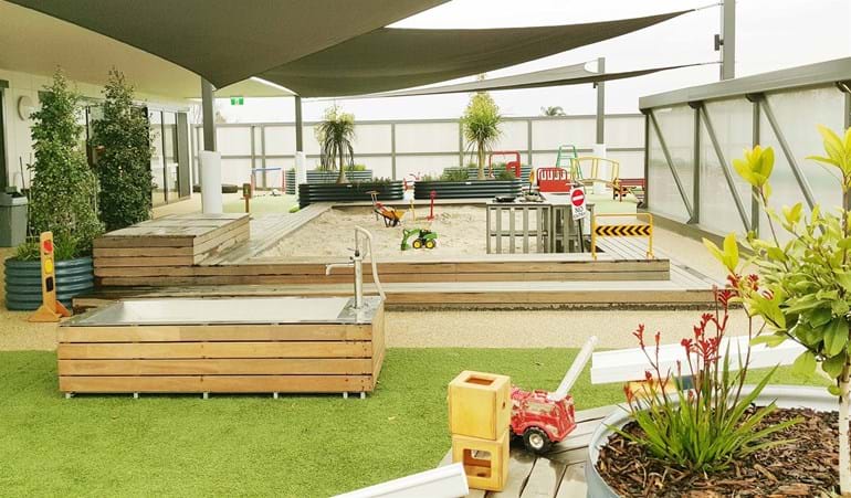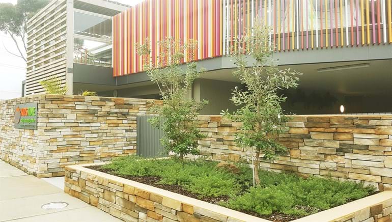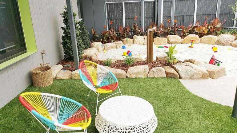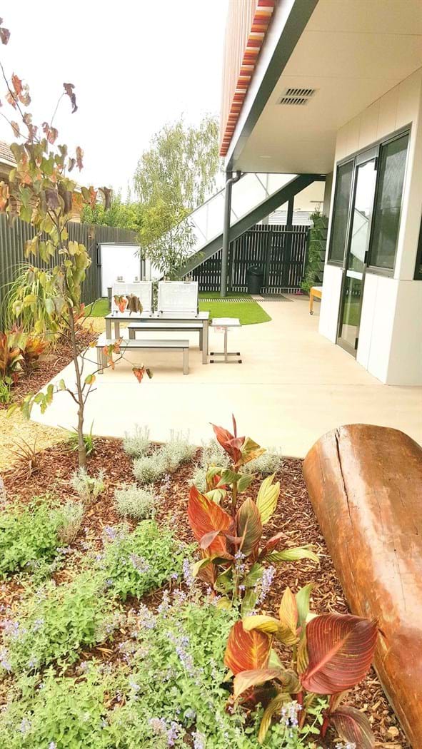 The narrow site for this privately owned childcare centre presented a challenging brief. Legal requirements associated with a playspace had to met. Items (including trees) needed to be located 1.2m away from boundaries to prevent climbability, softfall areas needed to be wide enough to allow for climbing equipment (for example the minimum fall zone is 3m plus the width of the equipment), sandpits had to be included and plant selection had to be correct and suitable.