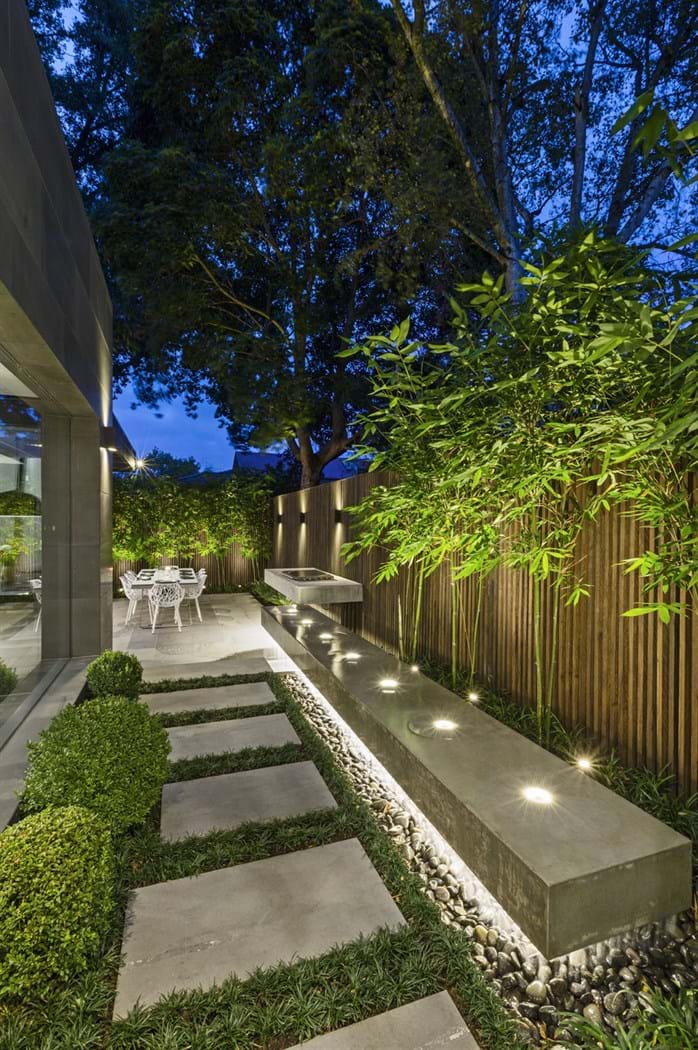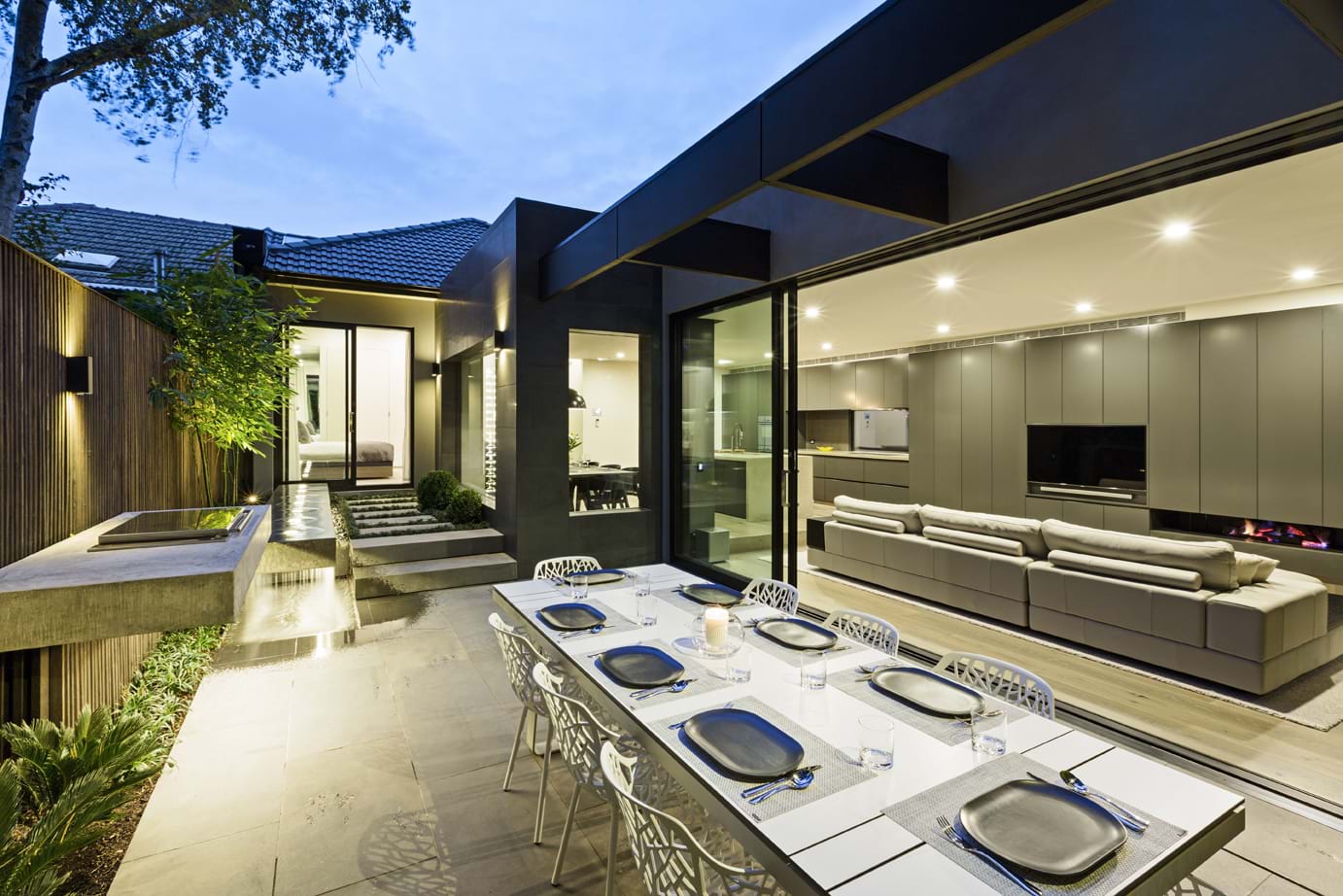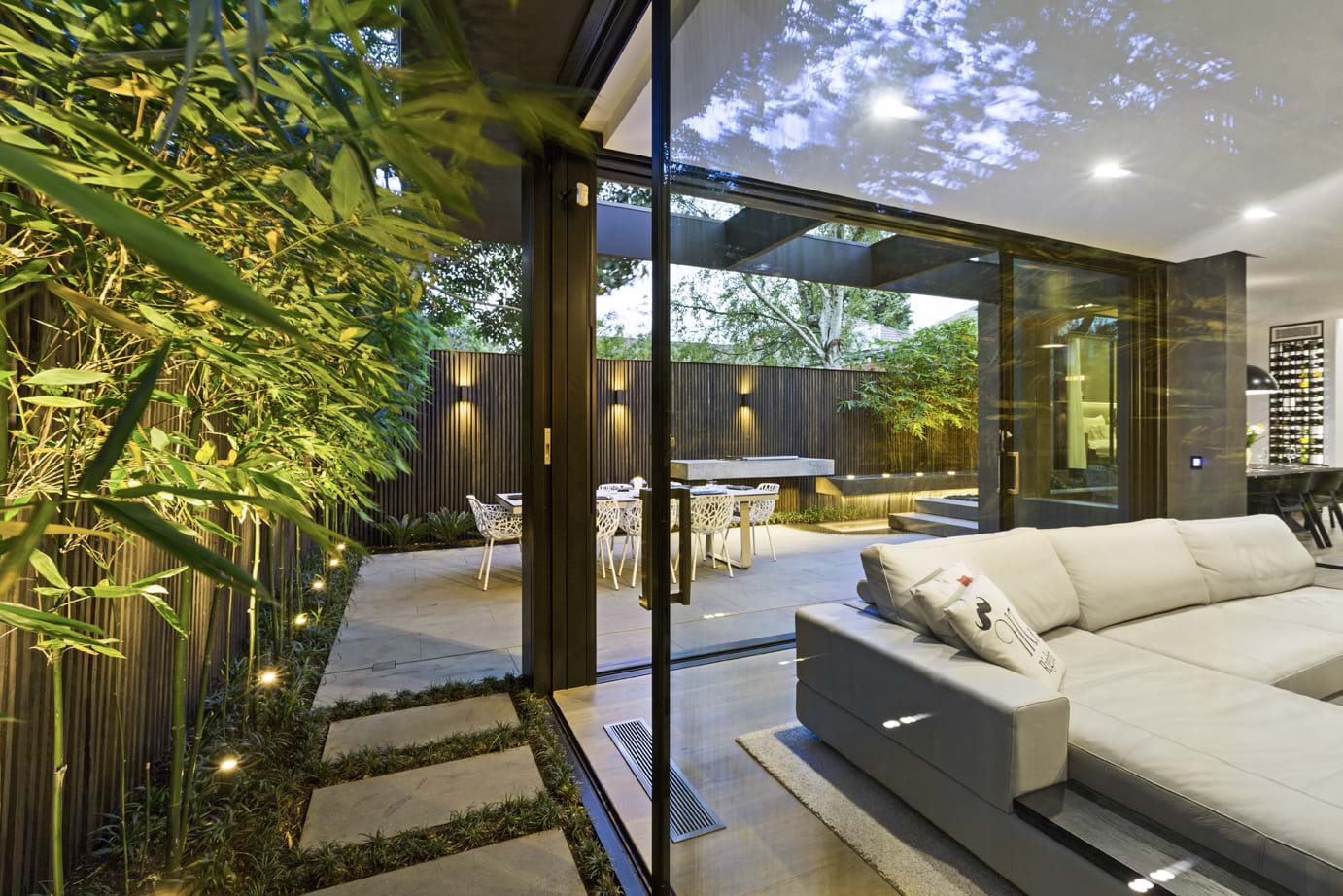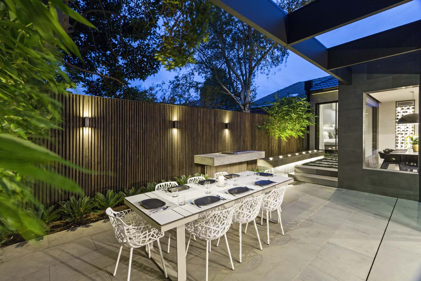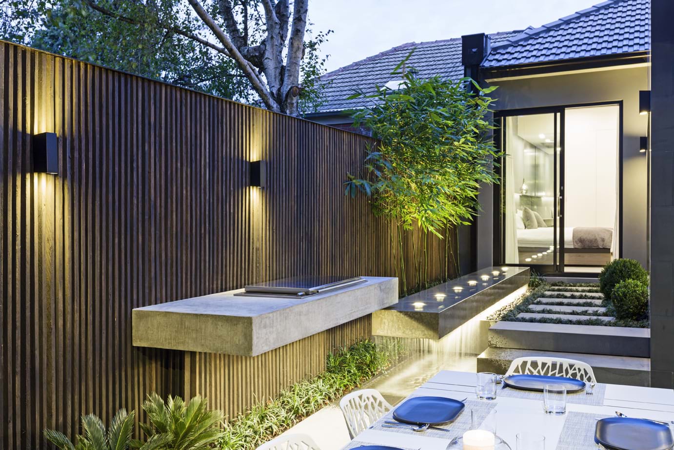 Sawn bluestone paving was used to provide consistency with other selected materials and stained radial timber for fencing. To soften the space clumping bamboo, architectural culms, massed planted lirope and dwarf mondo grass were used. To accentuate all the outdoor features at night, a detailed lighting schedule was installed including accent lights, LED strips and AVON up/down lights